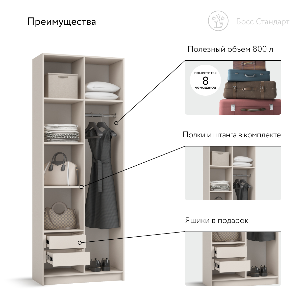 Шкаф Босс Стандарт 80 — компактное, но статусное решение для городской квартиры: хранить всё нужное, оставляя максимум свободного пространства. Лаконичный фасад с удлинёнными чёрными ручками отвечает эстетике 2025 года и становится ярким акцентом любого интерьера — от сканди до неоклассики. Каждый сантиметр внутри задействован: базовый гардероб, коробки с обувью и текстиль размещаются упорядоченно, освобождая комнату от визуального шума.