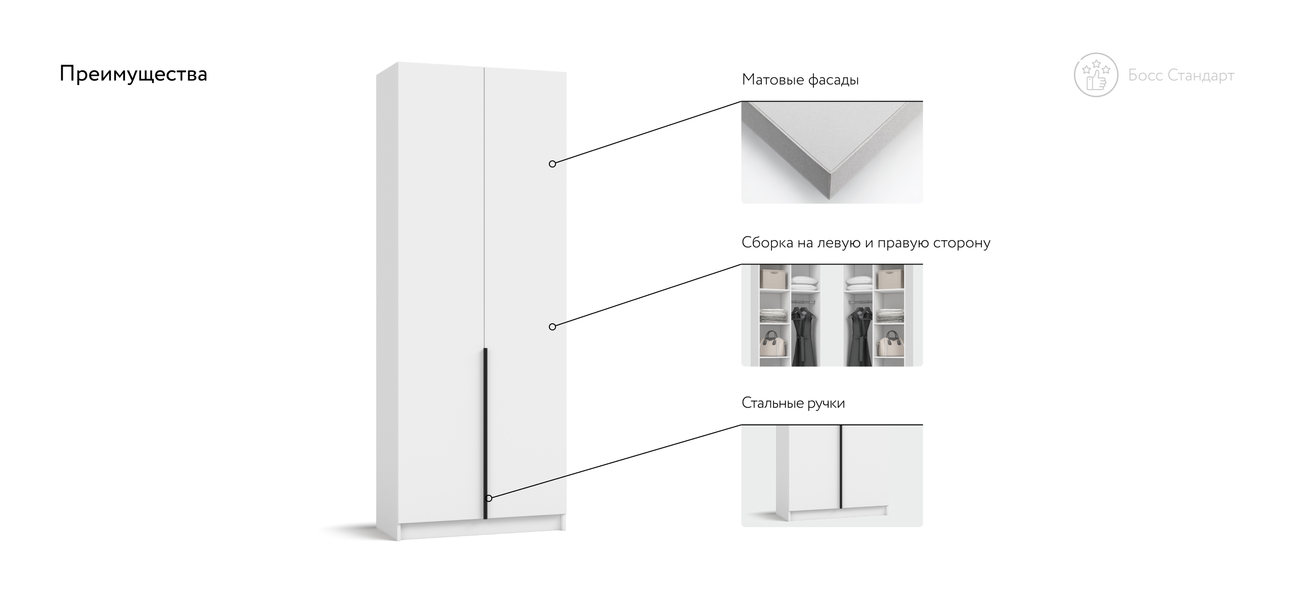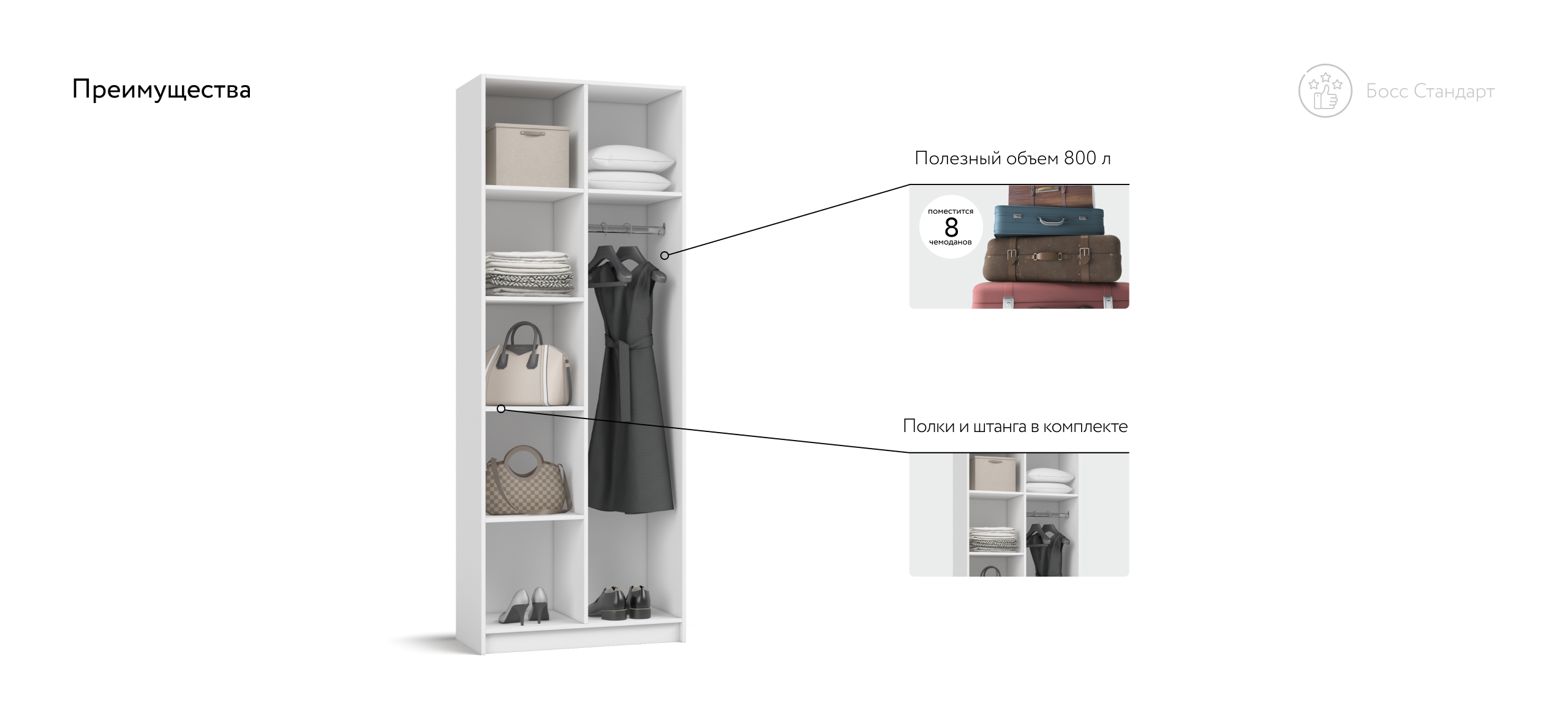 Гибкая компоновка превращает Босс Стандарт 80 в персональную систему хранения. Переставляемые полки позволяют адаптировать внутреннее пространство под высоту одежды и размер коробов, выбирая конфигурацию, которая лучше соответствует планировке комнаты и вашим привычкам. Двери с премиальными доводчиками открываются лёгким движением и закрываются мягко, не нарушая утренний ритм.