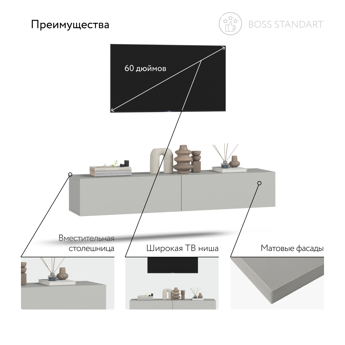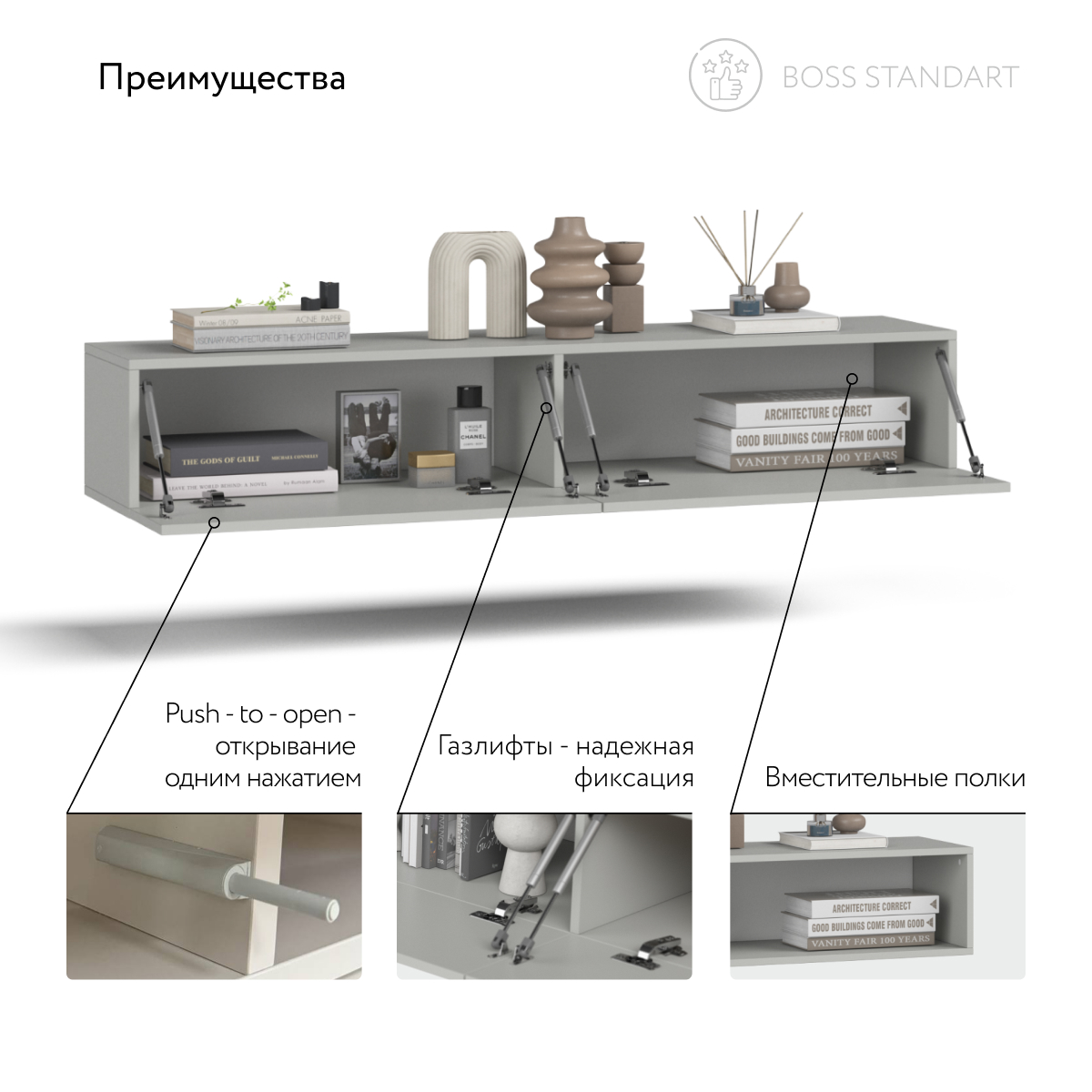 Вместительная ТВ тумба BOSS STANDART 140 с полностью закрытым хранением идеально подходит для хранения личных вещей, ТВ аксессуаров. Тумба оснащена фасадом с подъёмным механизмом, который плавно и бесшумно откидывается вниз, образуя доступ ко всему внутреннему пространству. ТВ Тумба оснащена системой Push-to –open, которая обеспечит легкое открывание дверцы одним нажатием.