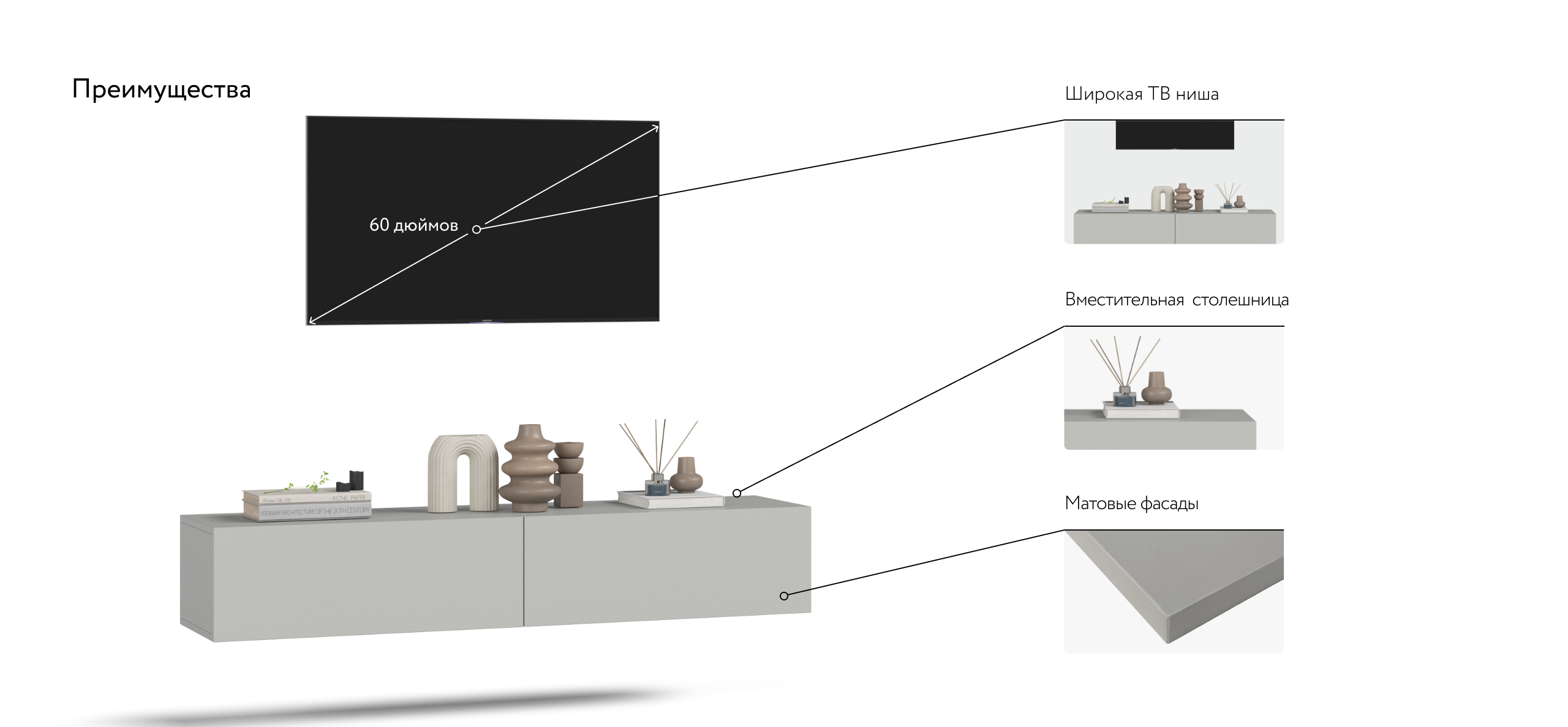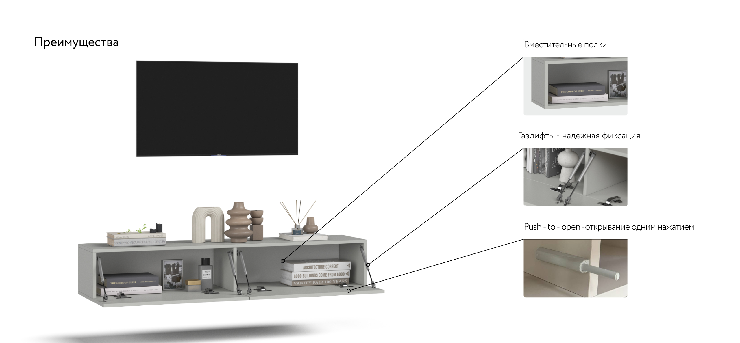 Вместительная ТВ тумба BOSS STANDART 140 с полностью закрытым хранением идеально подходит для хранения личных вещей, ТВ аксессуаров. Тумба оснащена фасадом с подъёмным механизмом, который плавно и бесшумно откидывается вниз, образуя доступ ко всему внутреннему пространству. ТВ Тумба оснащена системой Push-to –open, которая обеспечит легкое открывание дверцы одним нажатием.