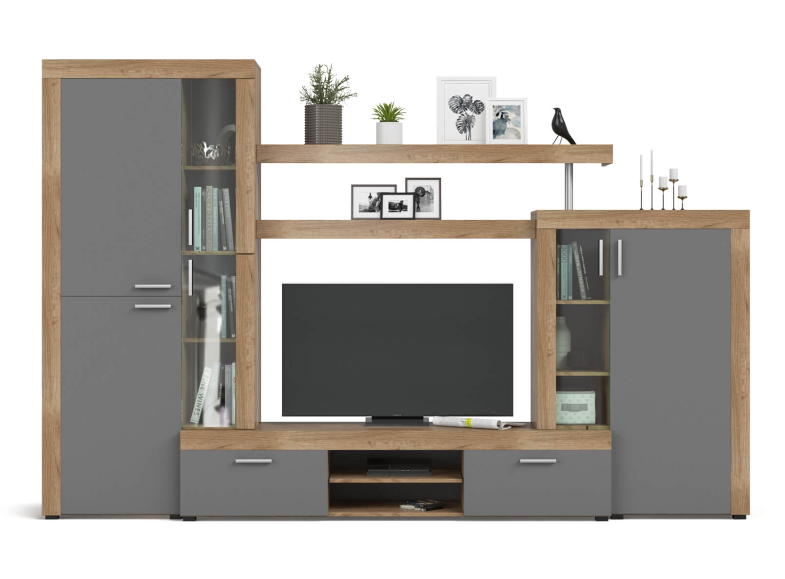Стенка Монтана – стильная стенка, которая отличается лаконичностью форм и элегантным сочетанием светлых фасадов и корпуса в древесном декоре.