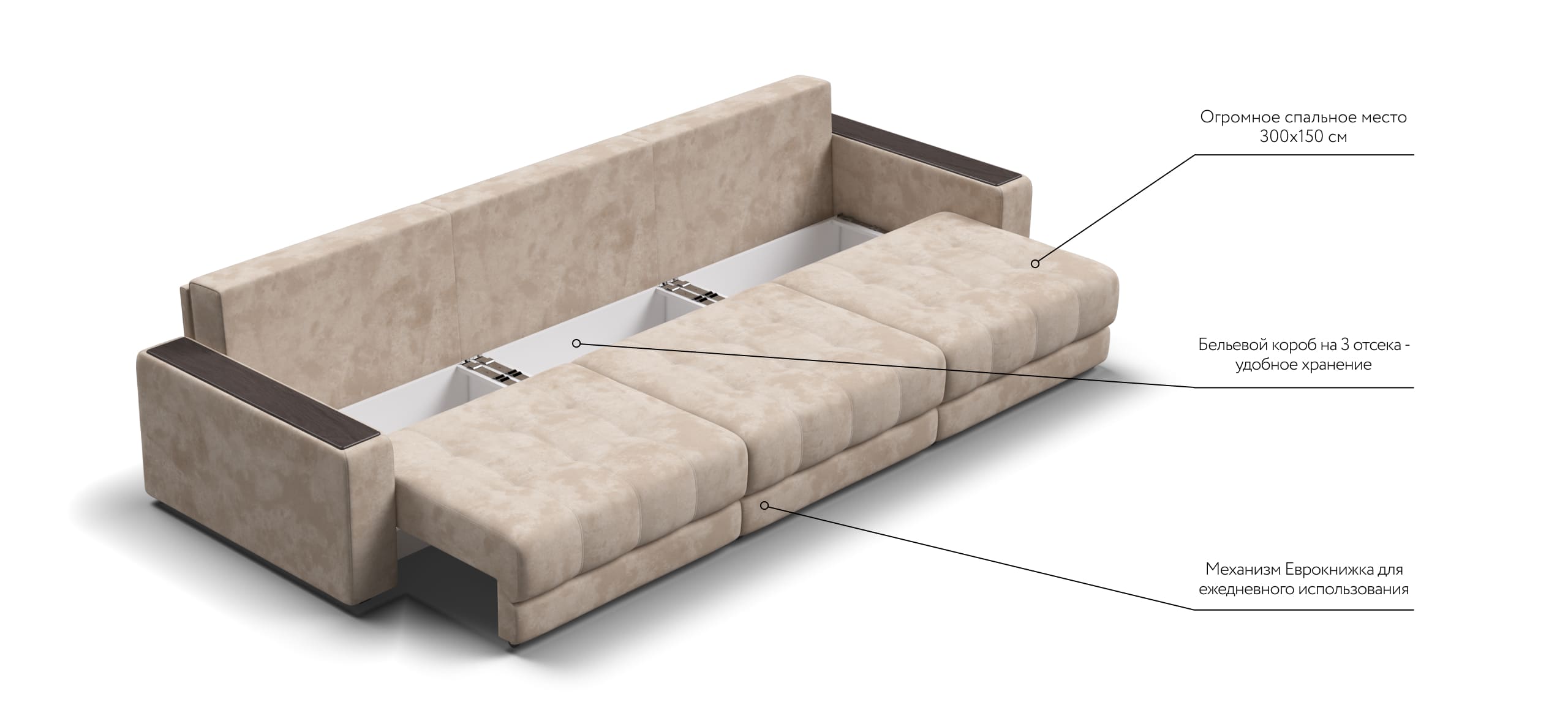 Легкая трансформация в три положения создаст для Вас максимально комфортный отдых, а улучшенное анатомическое основание в диване обеспечит Вам здоровый сон. Спинка защищает от соприкосновения со стеной во время сна.