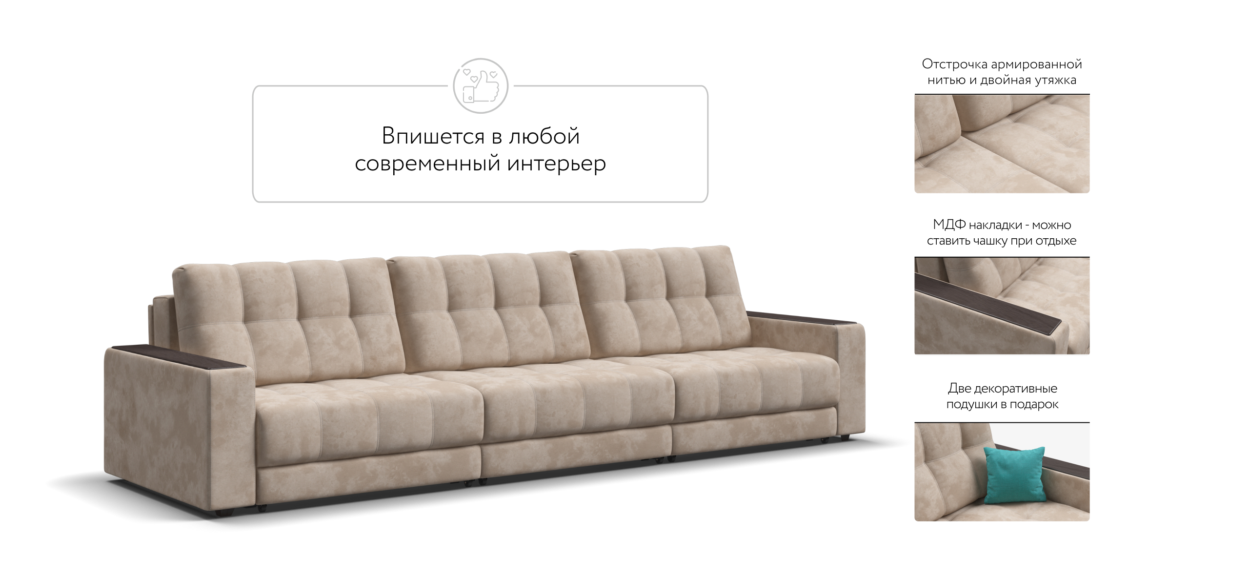 Каждое посадочное место выдвигается вперед и можно получить диван с правым или левым углом, а также получить П-образную форму дивана.