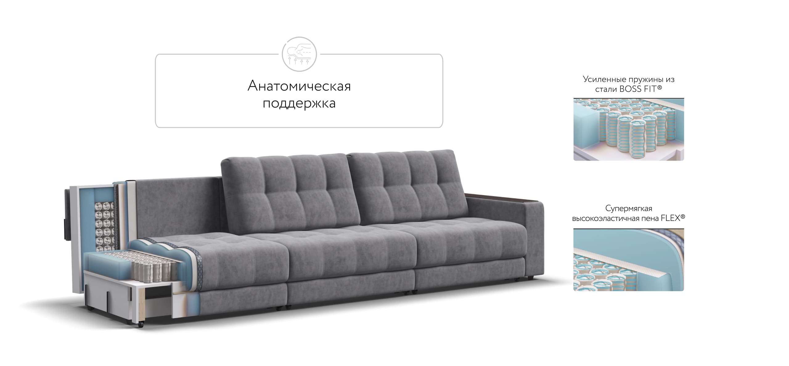 BOSS FIT – усиленные независимые пружины из прочной антикоррозионной стали и супермягкая высокоэластичная пена FLEX – гарантия комфортного спального места.