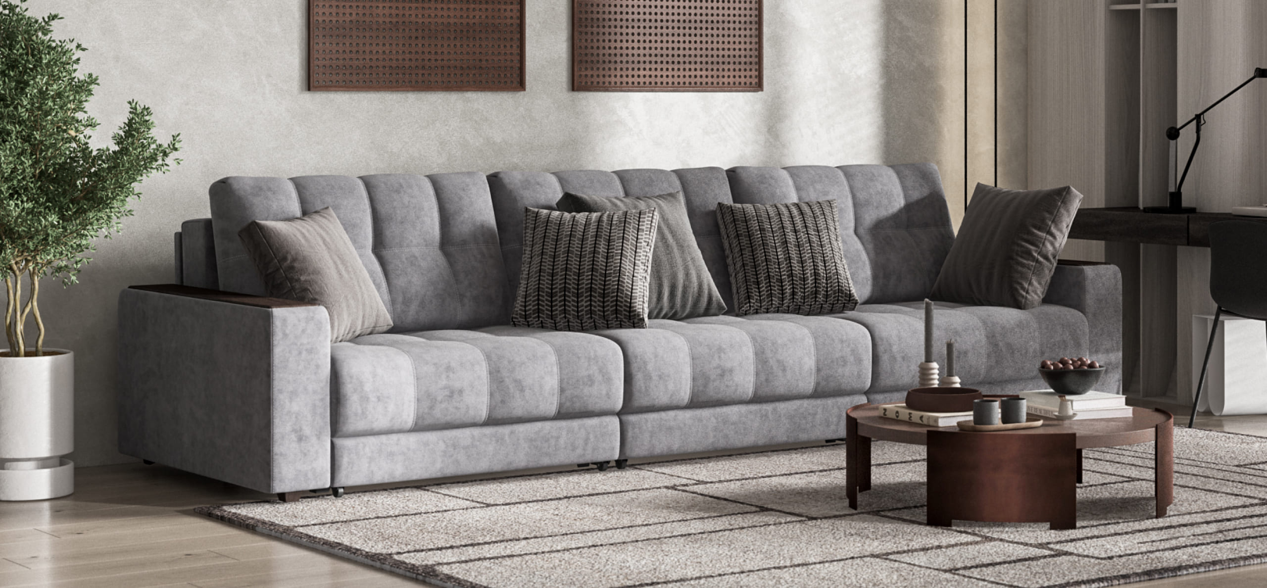 Диван BOSS GRAND - большой, стильный и комфортный диван, предназначенный для просторной комнаты. Продуманный до мелочей диван BOSS сочетает в себе надежный каркас, мягкие ткани, многофункциональность и быструю сборку за 1 минуту без инструментов - ощутите комфорт у себя дома!