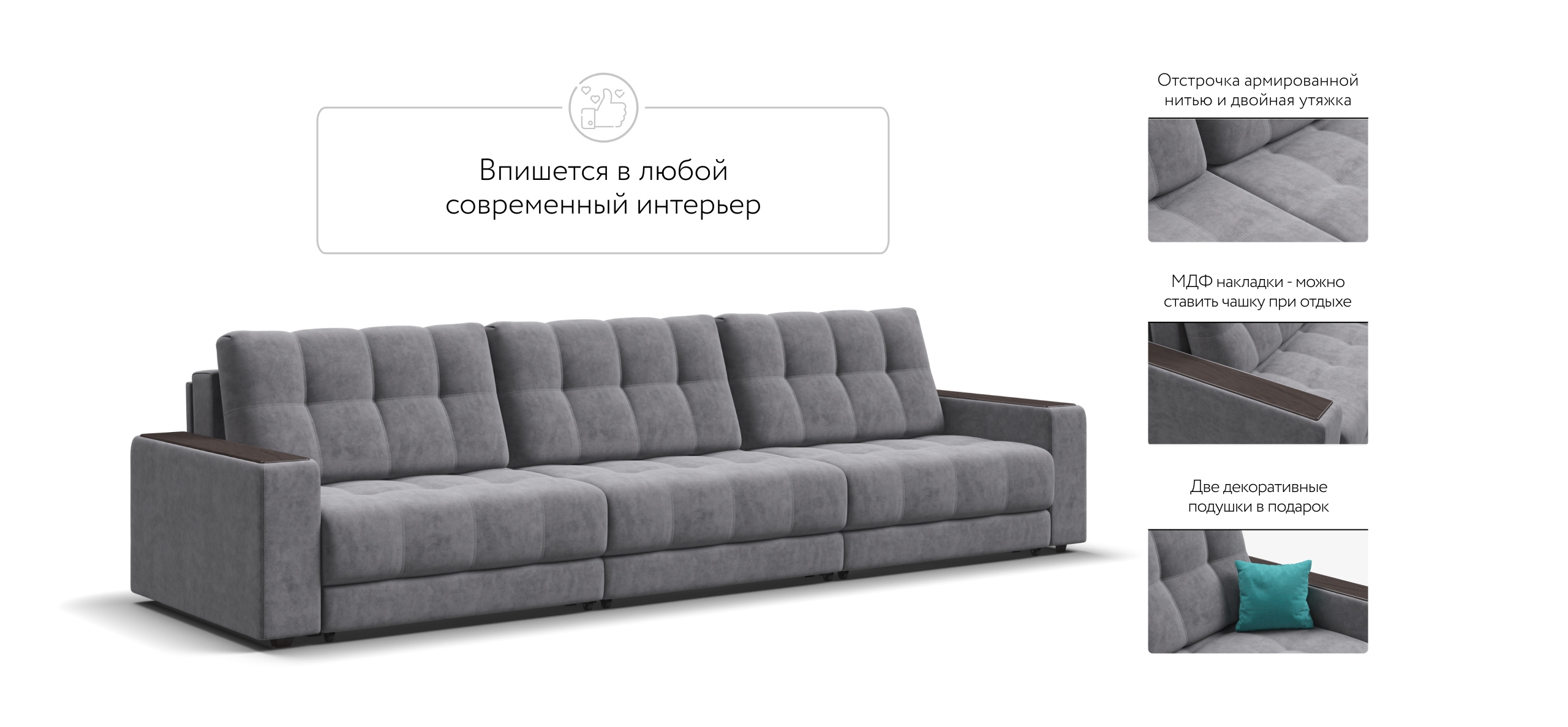 Декоративная строчка армированной нитью и двойная утяжка надолго сохранит внешний вид дивана.