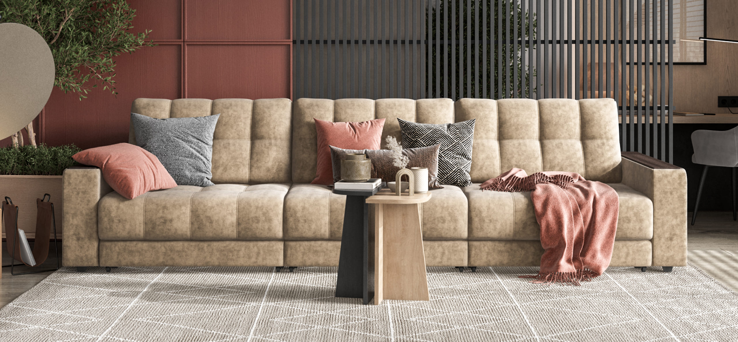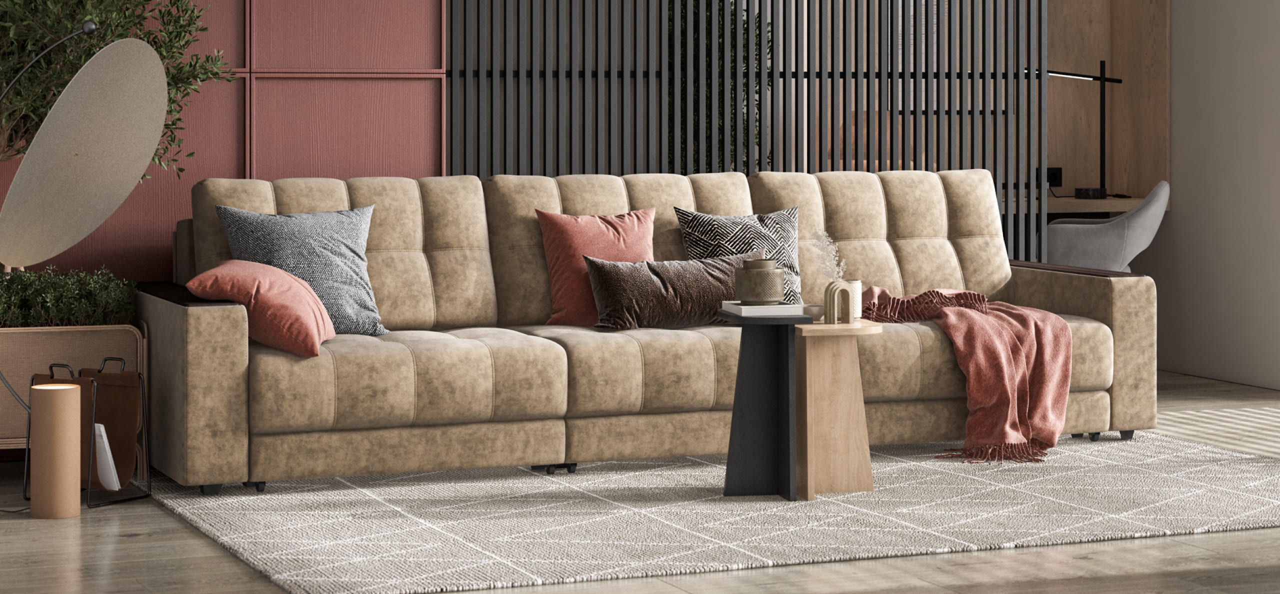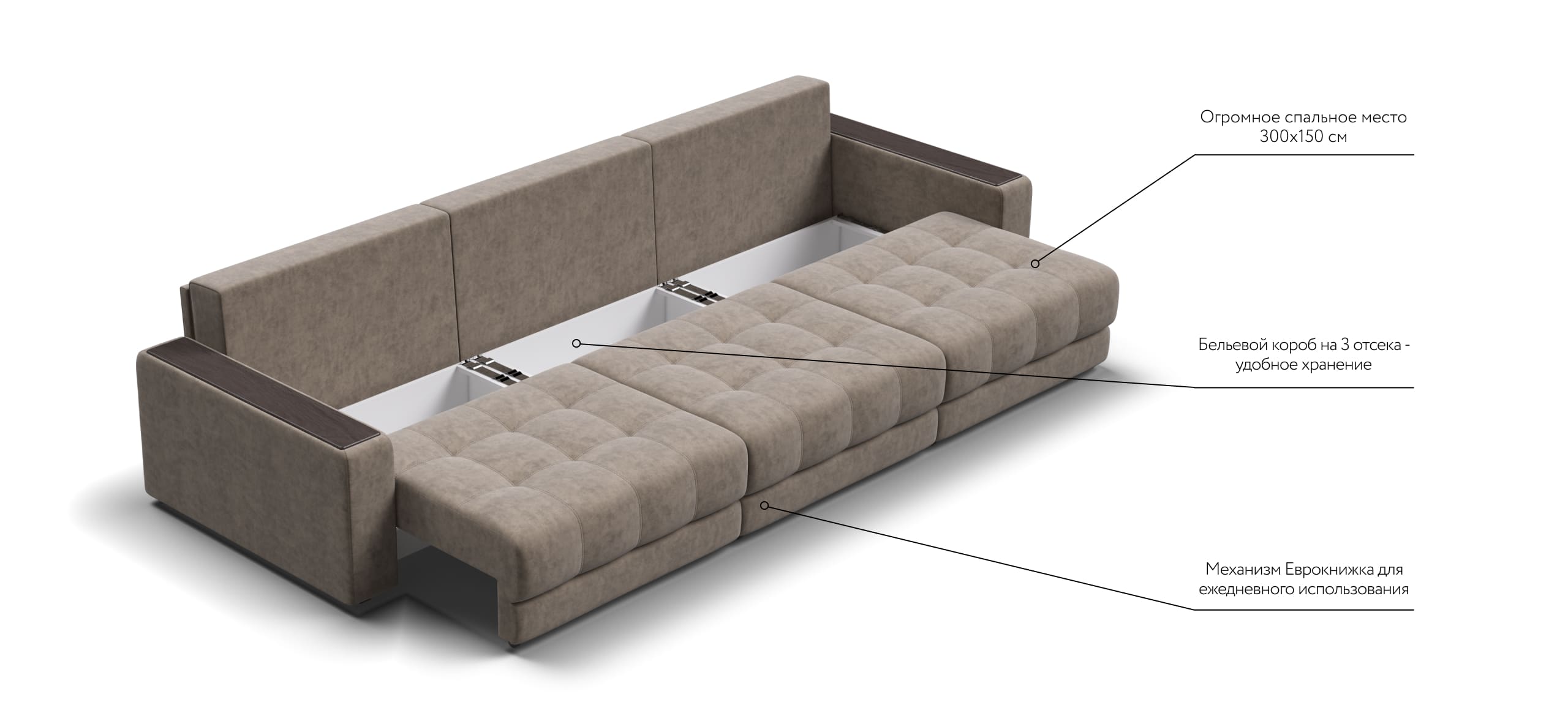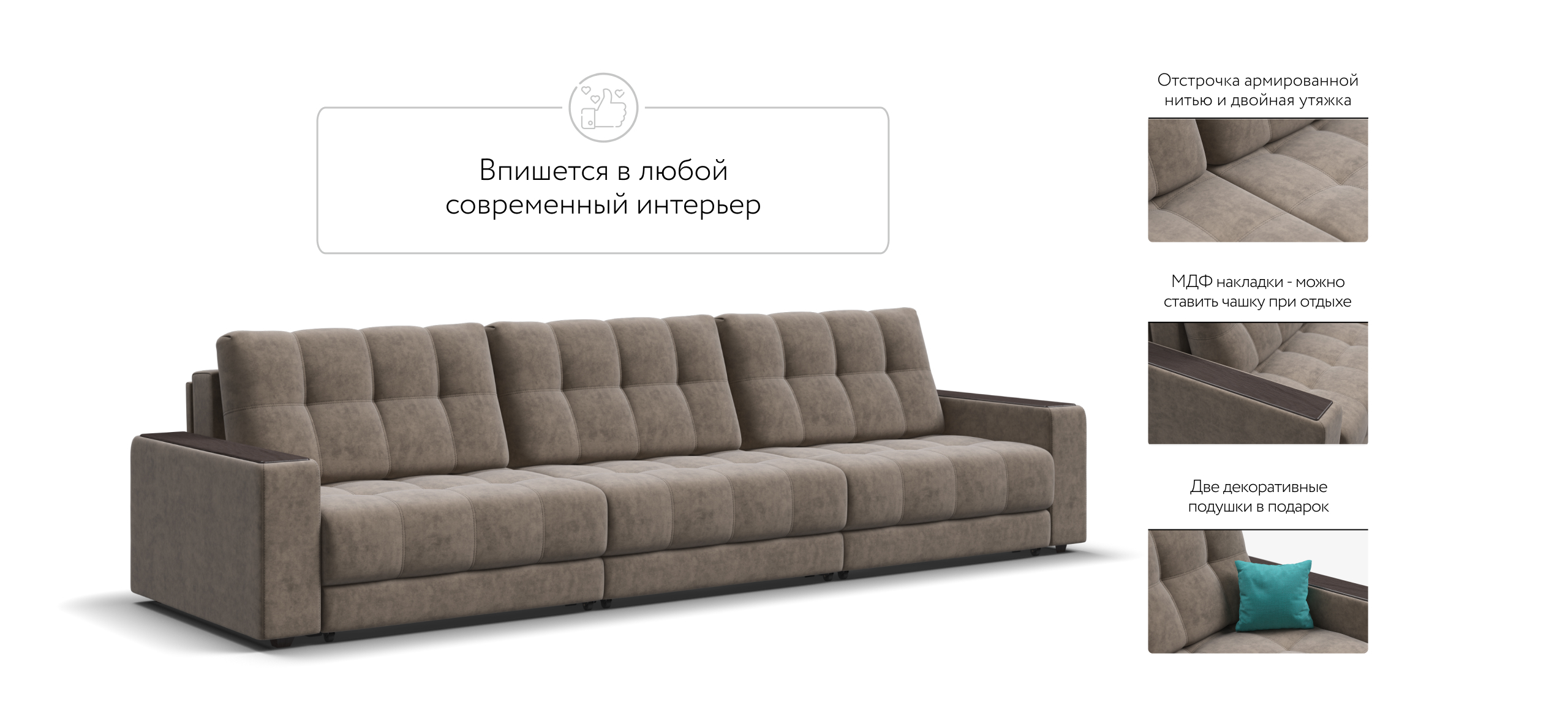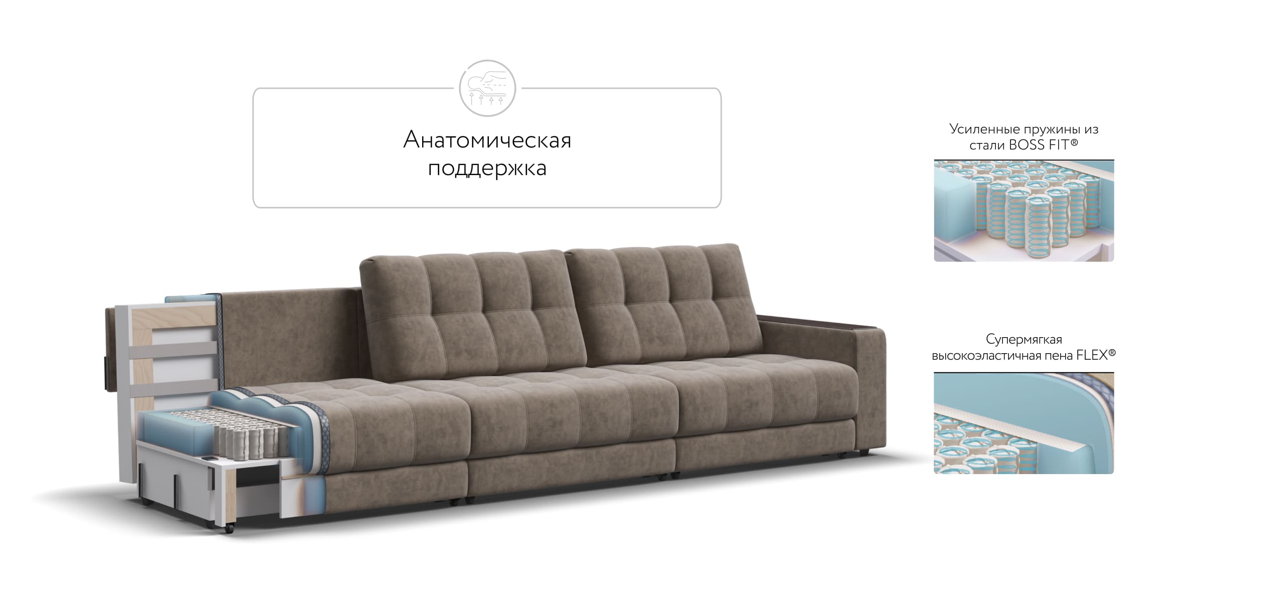 Диван BOSS GRAND - большой, стильный и комфортный диван, предназначенный для просторной комнаты. Продуманный до мелочей диван BOSS сочетает в себе надежный каркас, мягкие ткани, многофункциональность и быструю сборку за 1 минуту без инструментов - ощутите комфорт у себя дома!