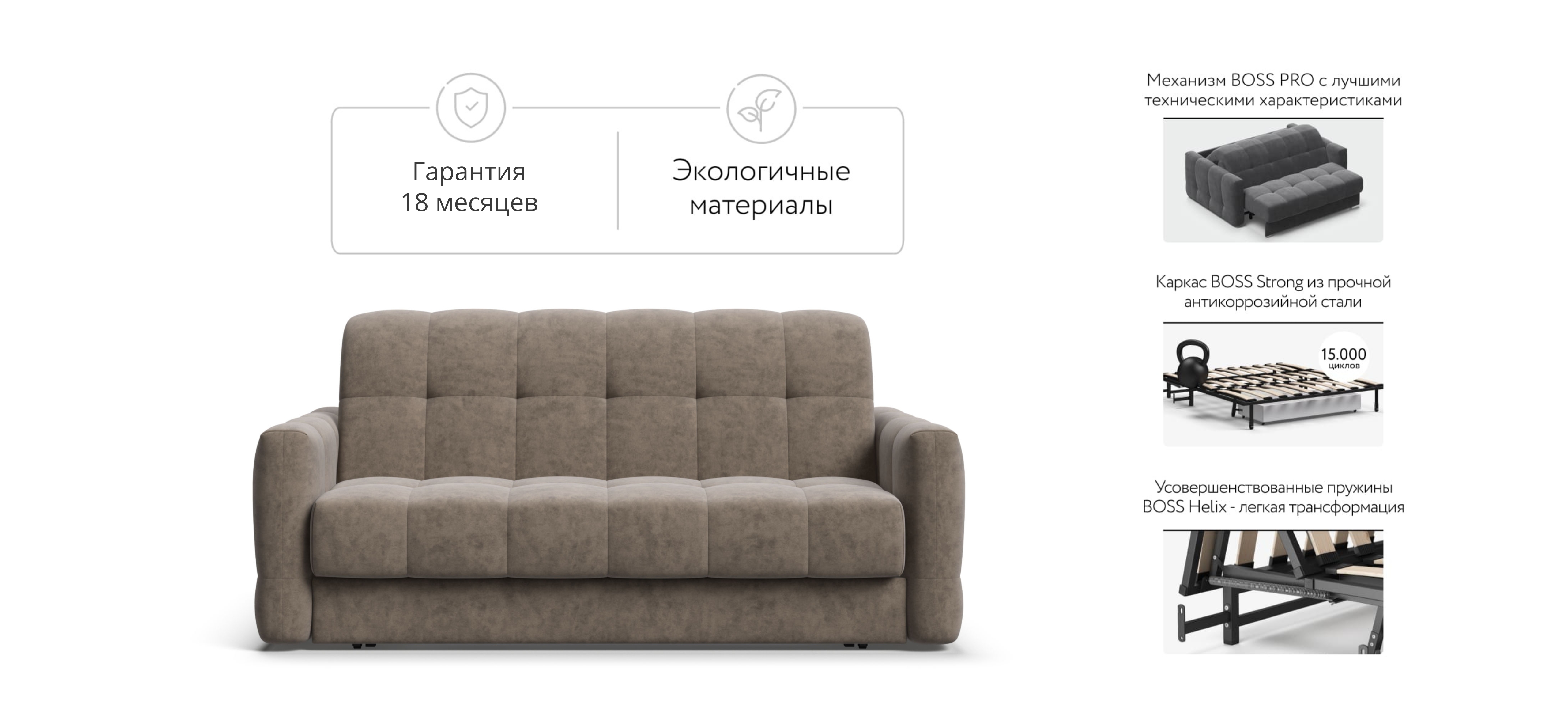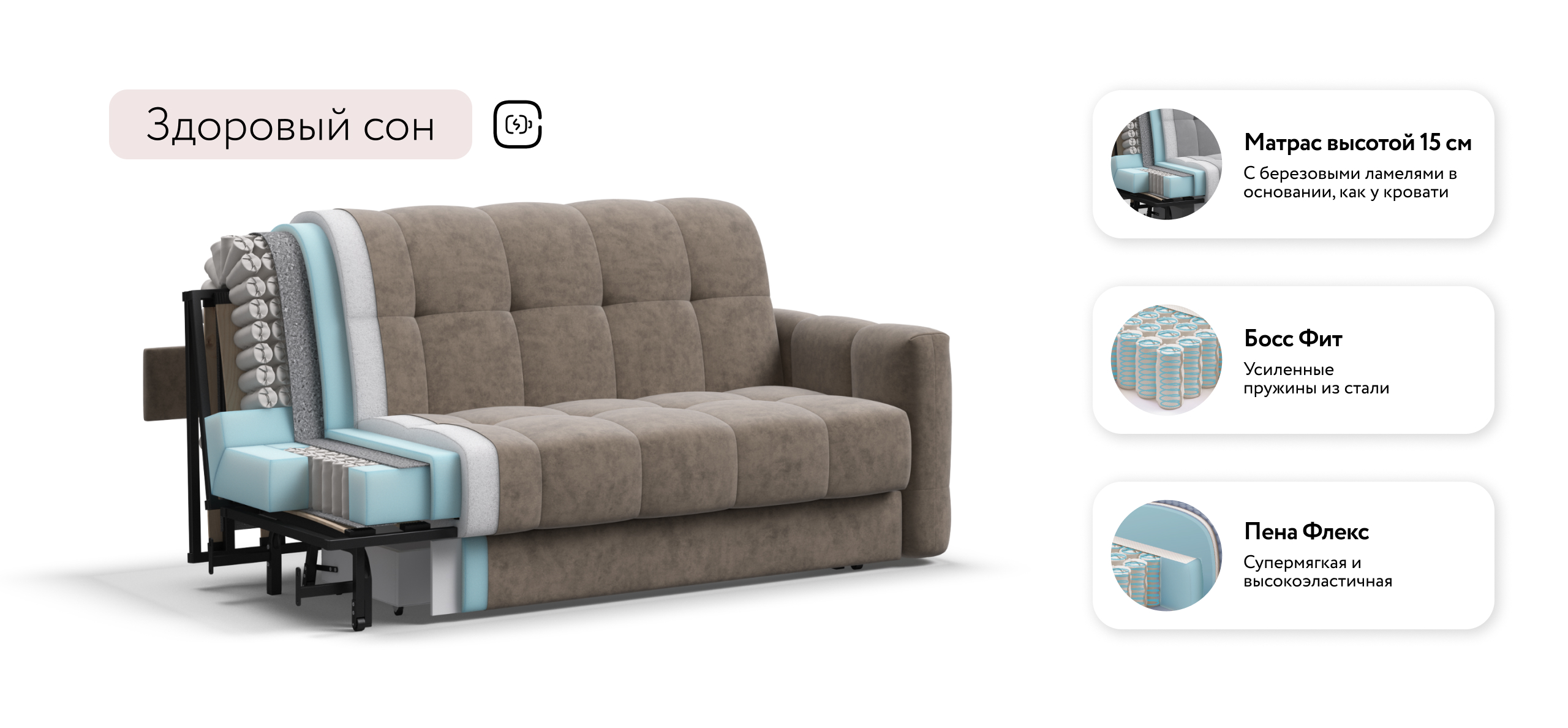 Инновационный анатомический матрас BOSS Quality в диване, высотой 15 см., выполнен из полноценного независимого пружинного блока BOSS FIT и высокоэластичной пены FLEX – гарантия здорового сна, как на кровати!