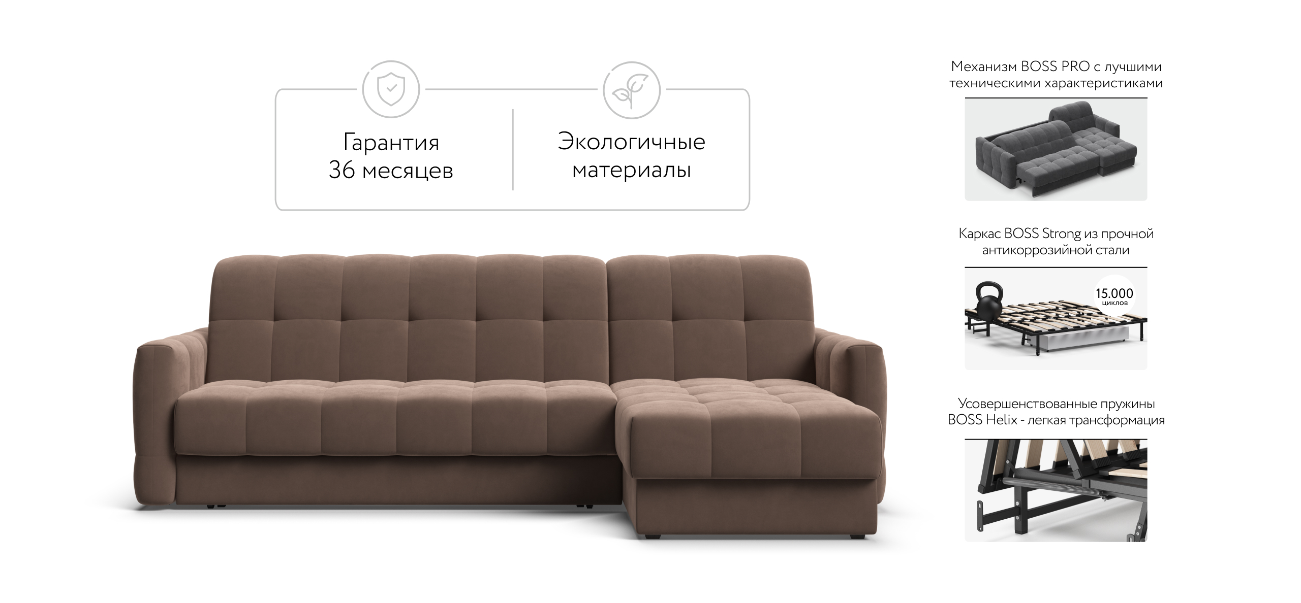 Механизм BOSS PRO и встроенный анатомический матрас – ночью Вы получаете большое спальное место, а днем, в сложенном состоянии, место для отдыха и экономию пространства
