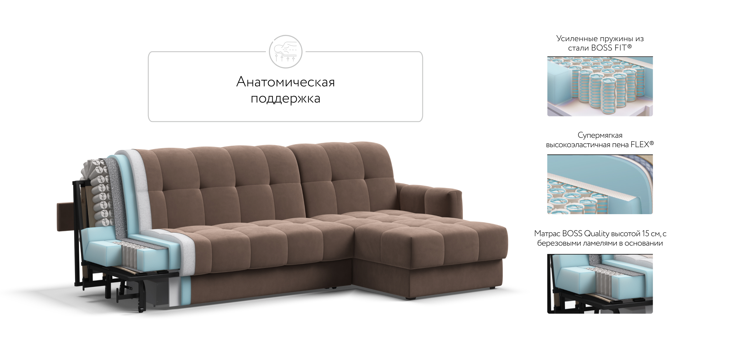 Инновационный анатомический матрас BOSS Quality в диване, высотой 15 см., выполнен из полноценного независимого пружинного блока BOSS FIT и высокоэластичной пены FLEX – гарантия здорового сна, как на кровати!