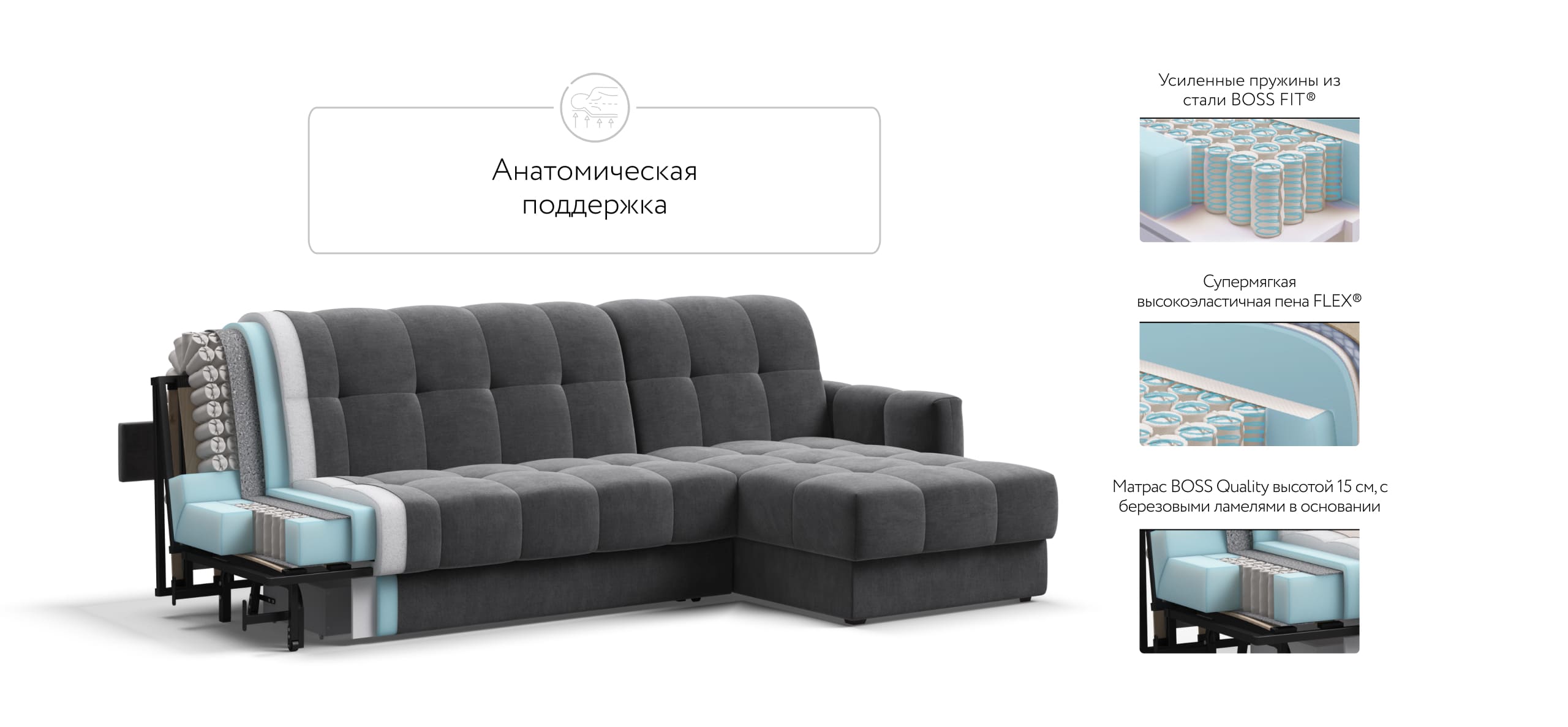 Инновационный анатомический матрас BOSS Quality в диване, высотой 15 см., выполнен из полноценного независимого пружинного блока BOSS FIT и высокоэластичной пены FLEX – гарантия здорового сна, как на кровати!