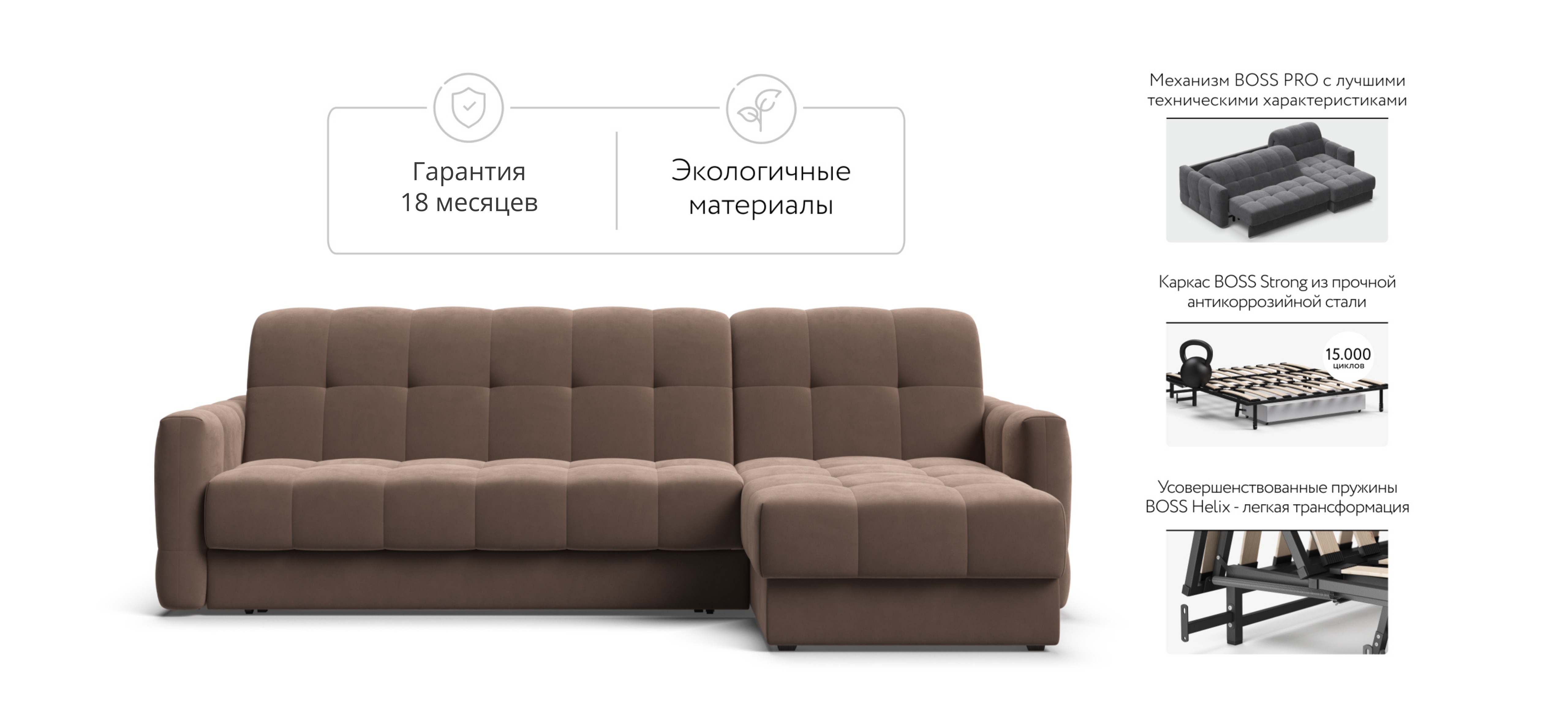 Инновационный анатомический матрас BOSS Quality в диване, высотой 15 см., выполнен из полноценного независимого пружинного блока BOSS FIT и высокоэластичной пены FLEX – гарантия здорового сна, как на кровати!