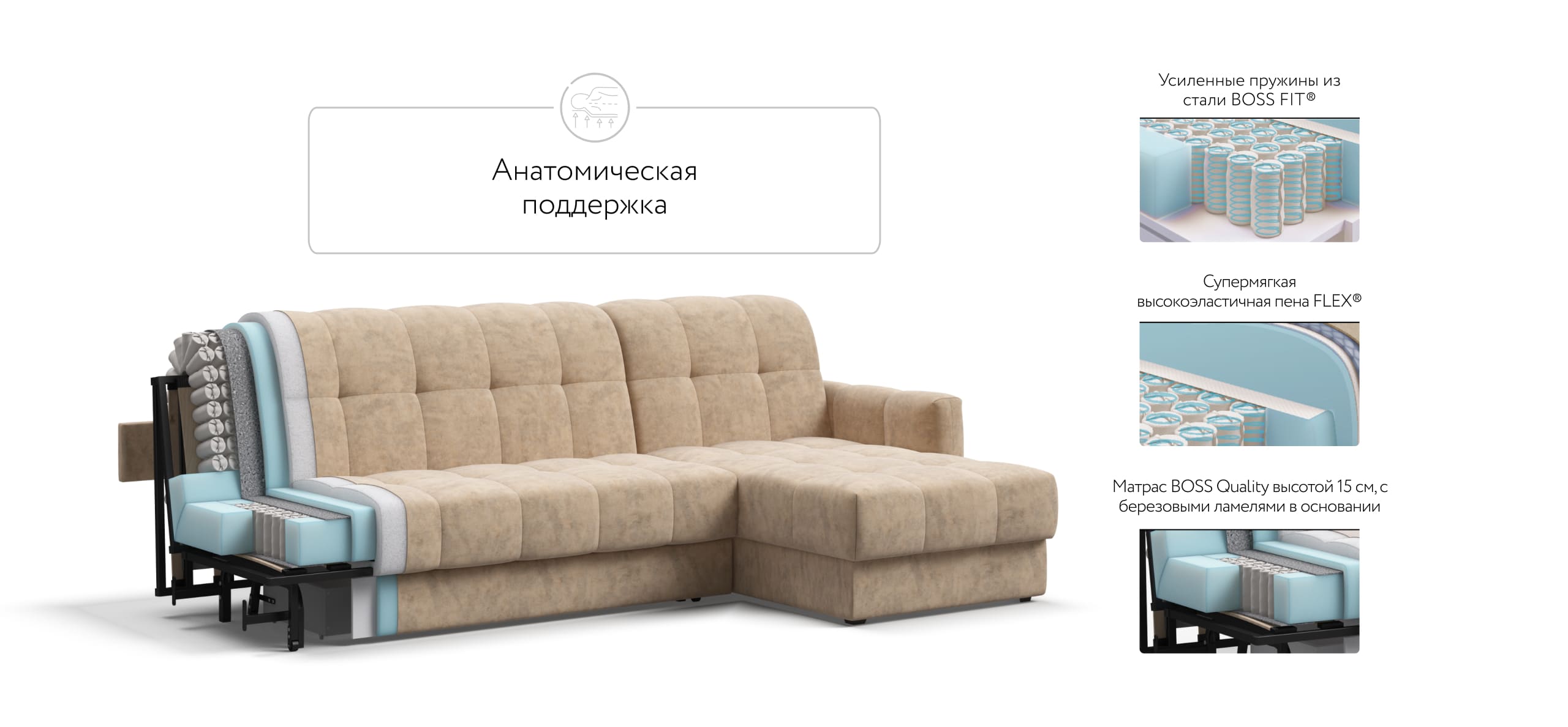 Инновационный анатомический матрас BOSS Quality в диване, высотой 15 см., выполнен из полноценного независимого пружинного блока BOSS FIT и высокоэластичной пены FLEX – гарантия здорового сна, как на кровати!