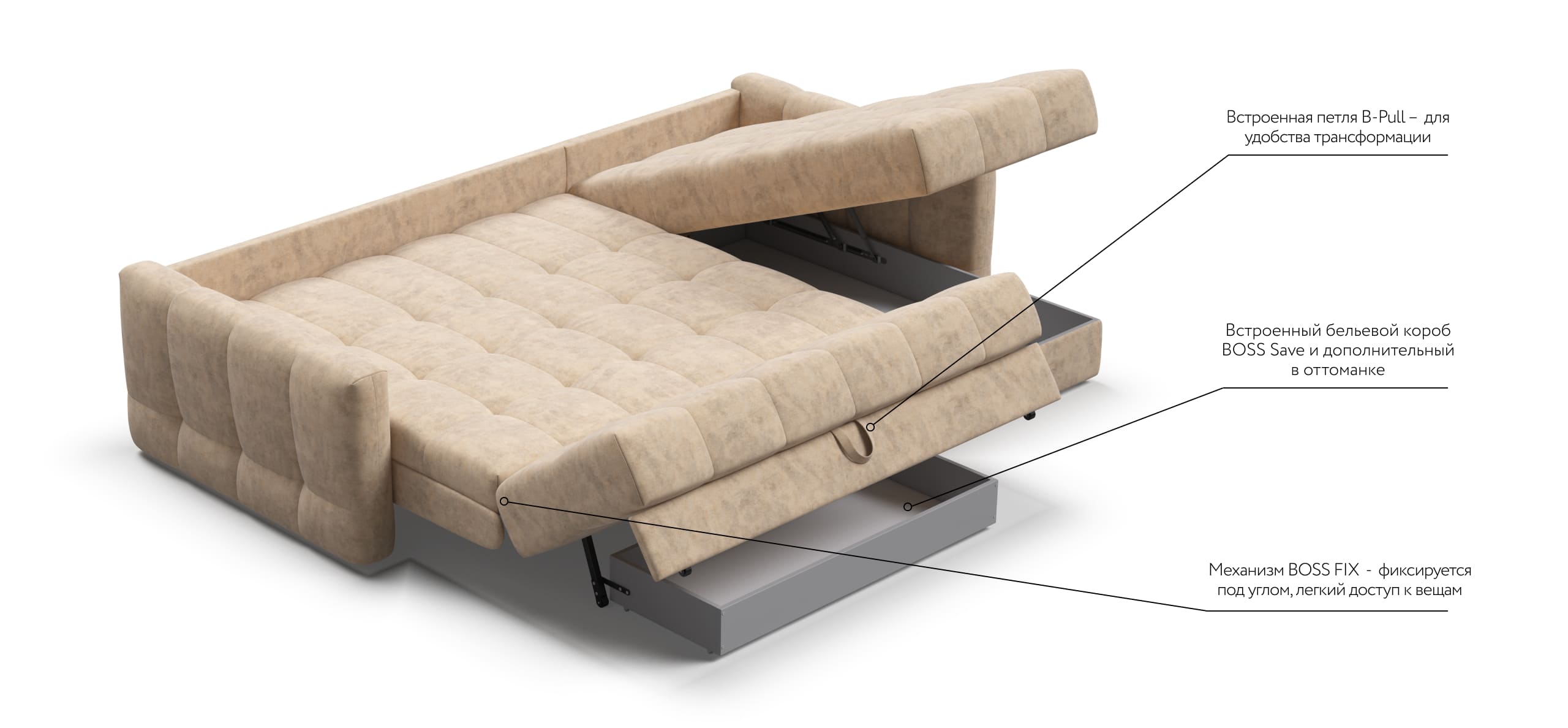 В комплекте с диваном идет бельевой короб BOSS Save и не нужно за него доплачивать, а также дополнительный короб в оттоманке!
