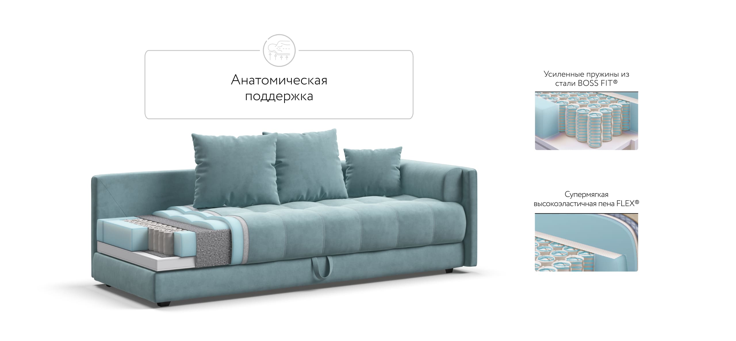 Усиленные независимые пружины BOSS FIT из прочной антикоррозионной стали и супермягкая высокоэластичная пена FLEX – гарантия комфортного спального места