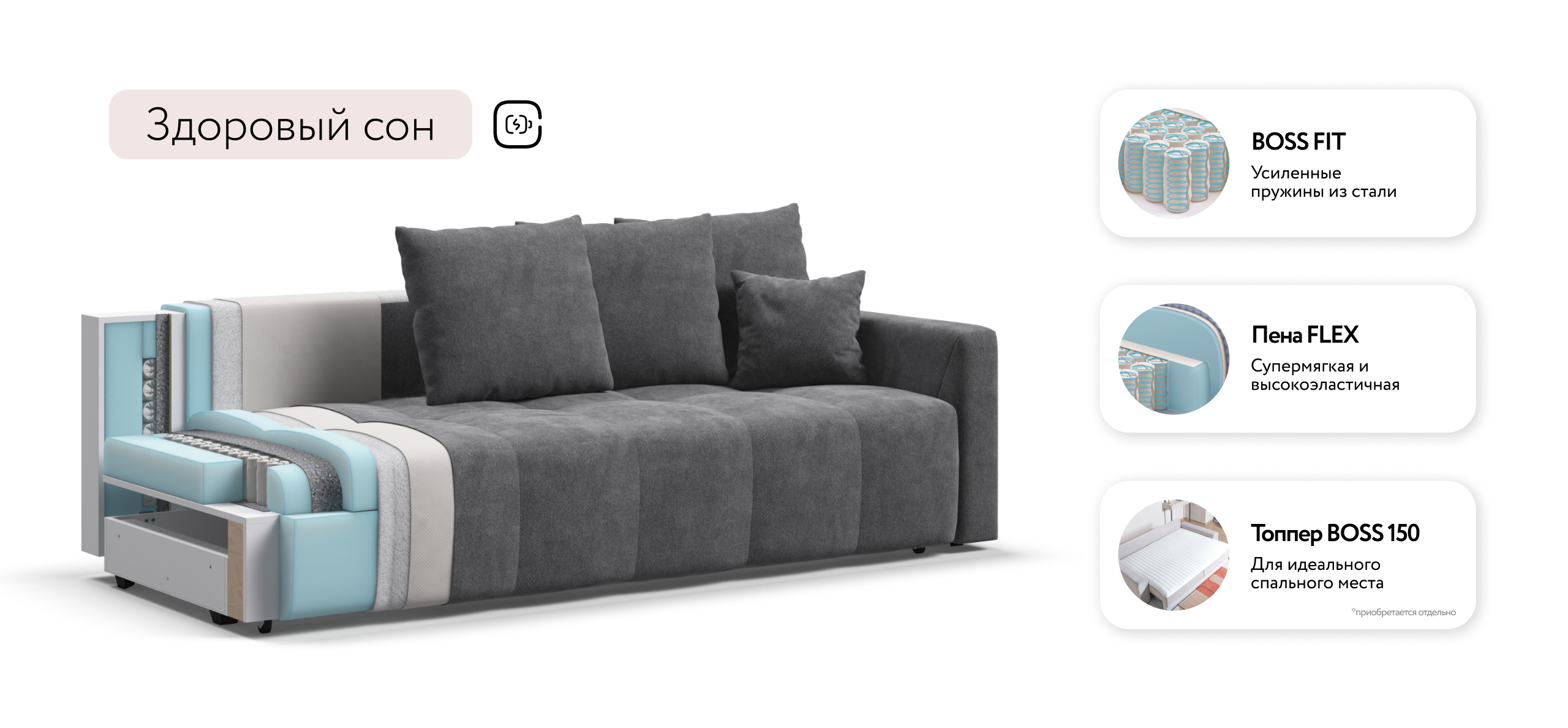 Независимые пружины BOSS FIT и высокоэластичная пена FLEX гарантия комфортного спального места