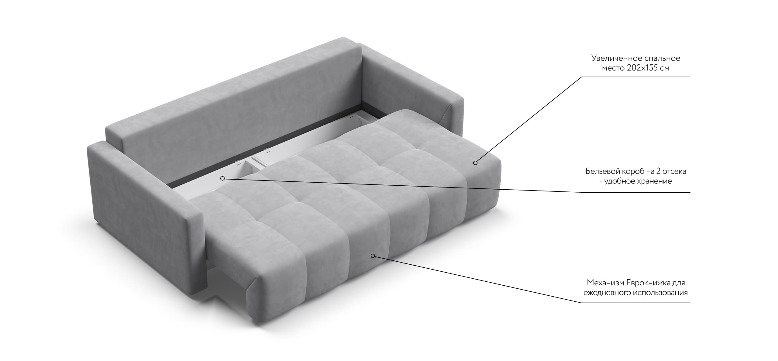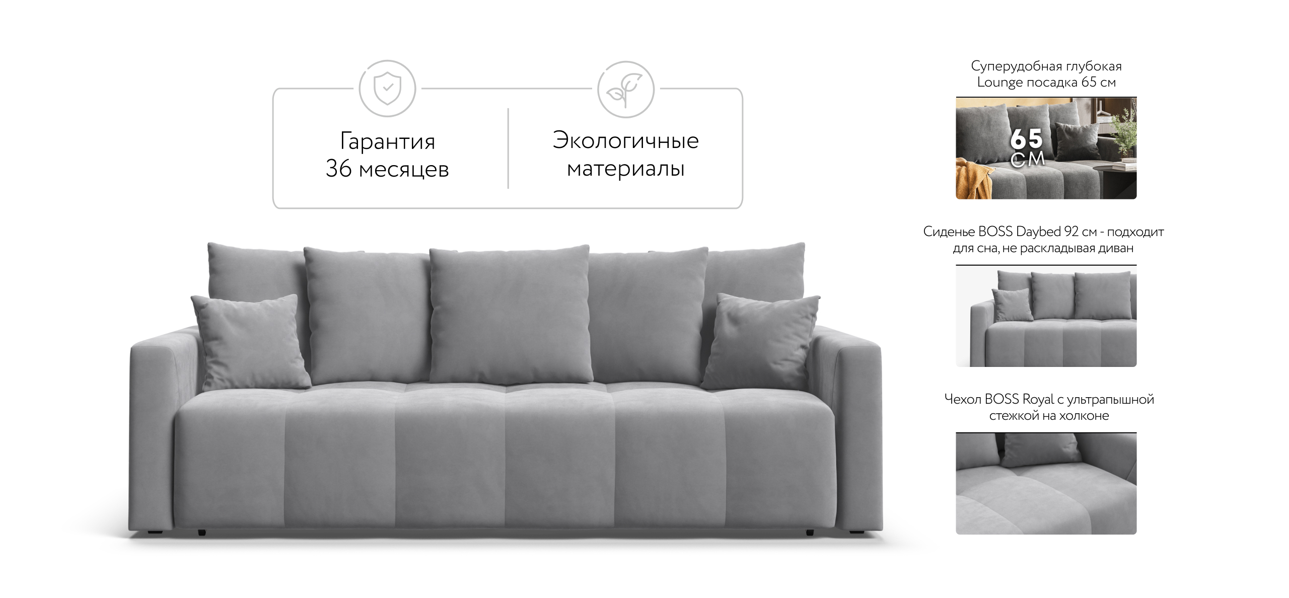 Сиденье BOSS Daybed глубиной 92 см идеально подходит для сна одного человека, даже без раскладывания дивана. Независимый пружинный блок в основании и механизм "еврокнижка" превращают диван в комфортное спальное место с анатомическим эффектом.