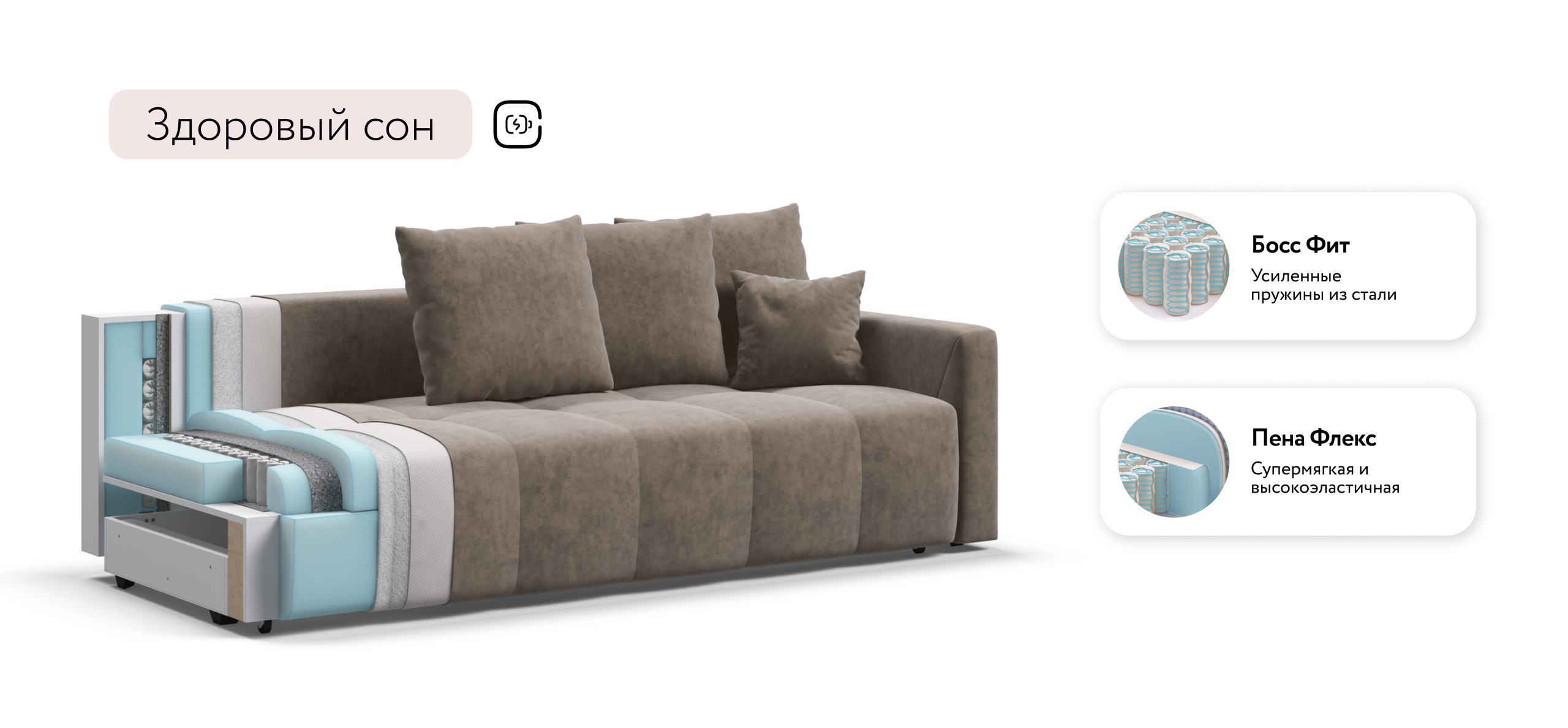 Сиденье BOSS Daybed глубиной 92 см идеально подходит для сна одного человека, даже без раскладывания дивана. Независимый пружинный блок в основании и механизм "еврокнижка" превращают диван в комфортное спальное место с анатомическим эффектом.