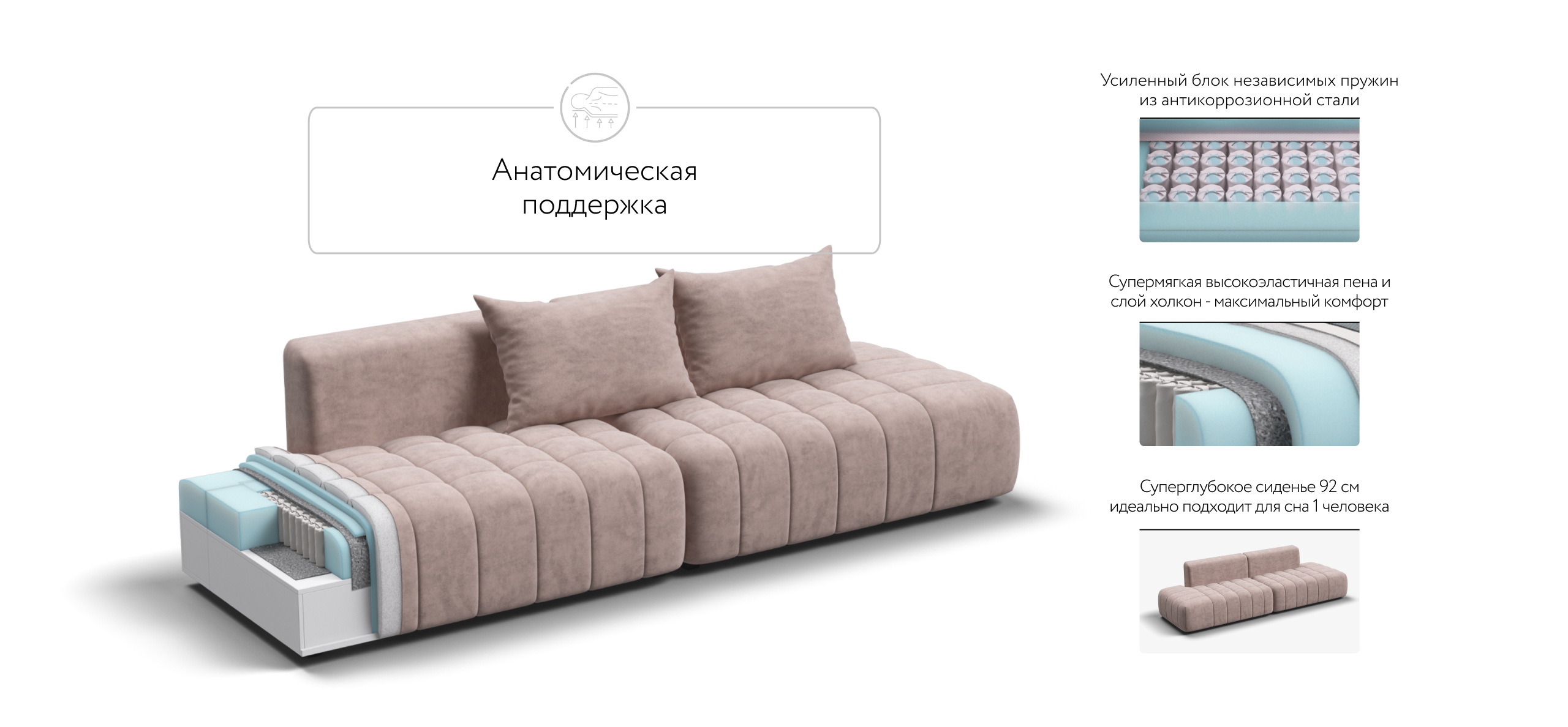 Глубокое сиденье и независимые пружины в основании словно созданы для полного расслабления, а мягкие спинки обеспечивают комфорт без лишних подушек.