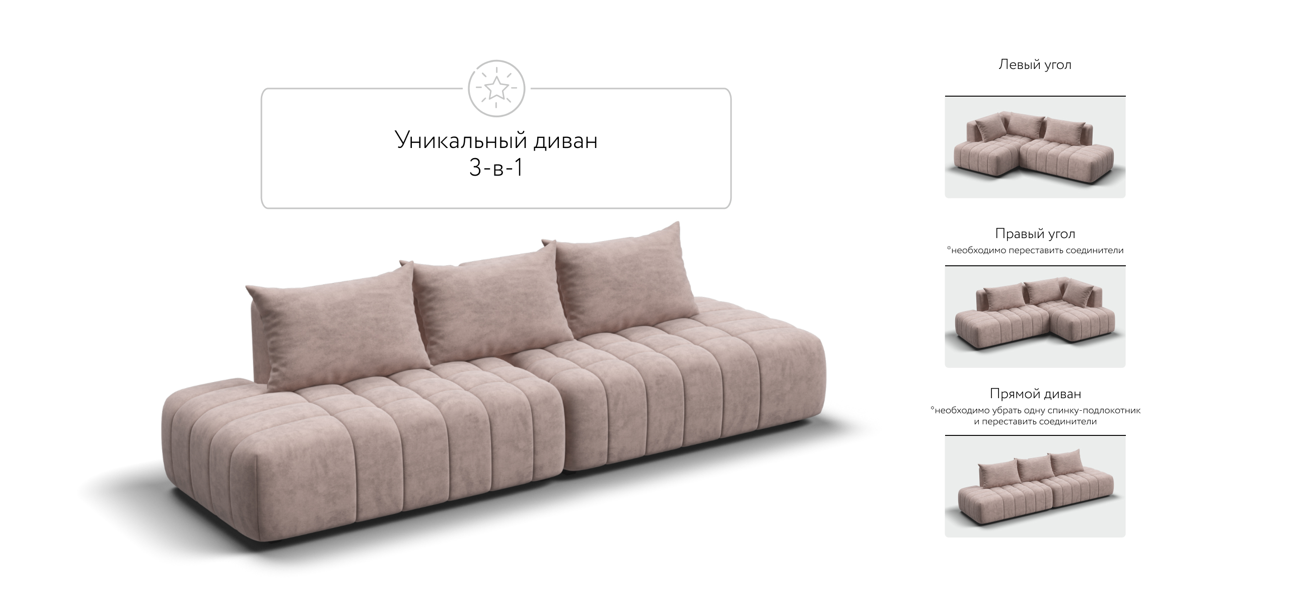 Уникальный диван 3-в-1: прямой, левый угол, правый угол
