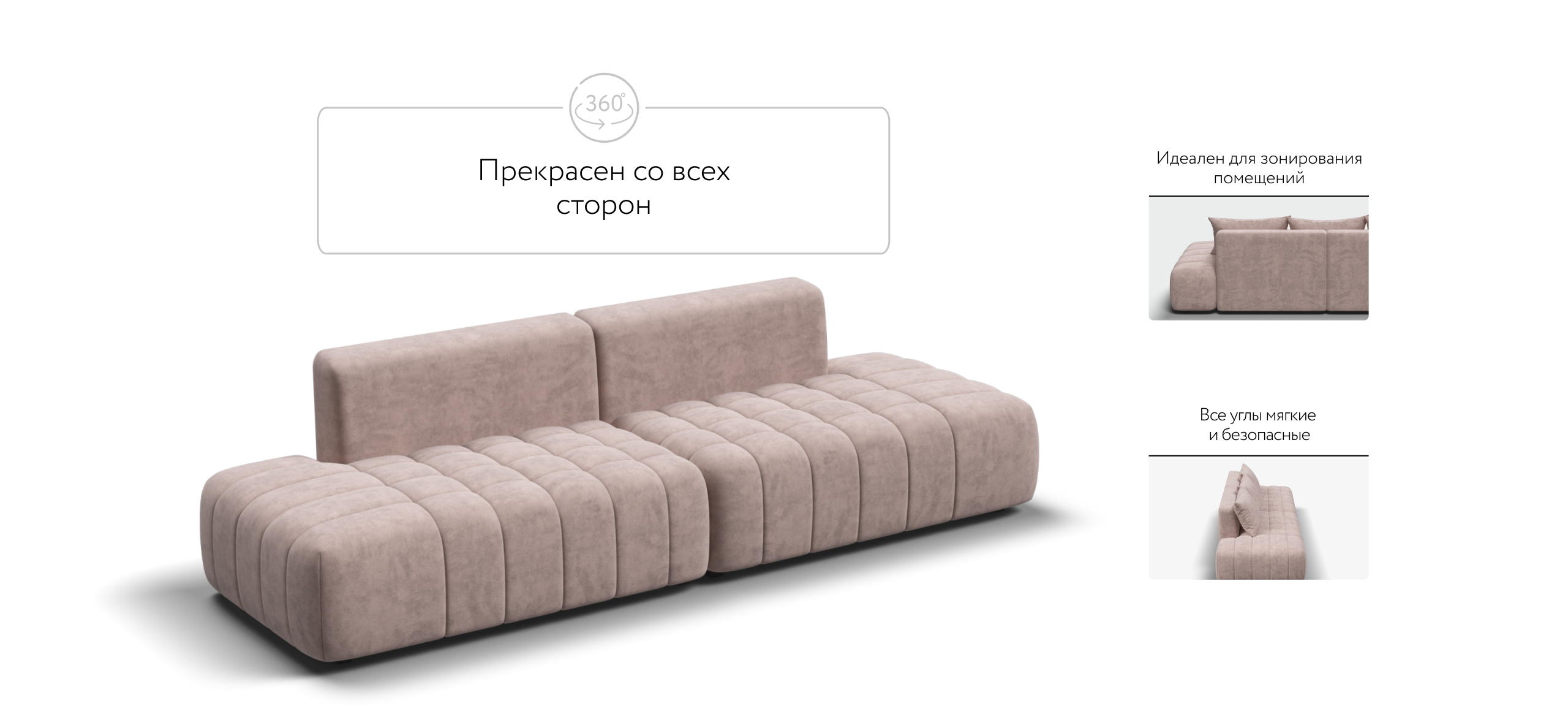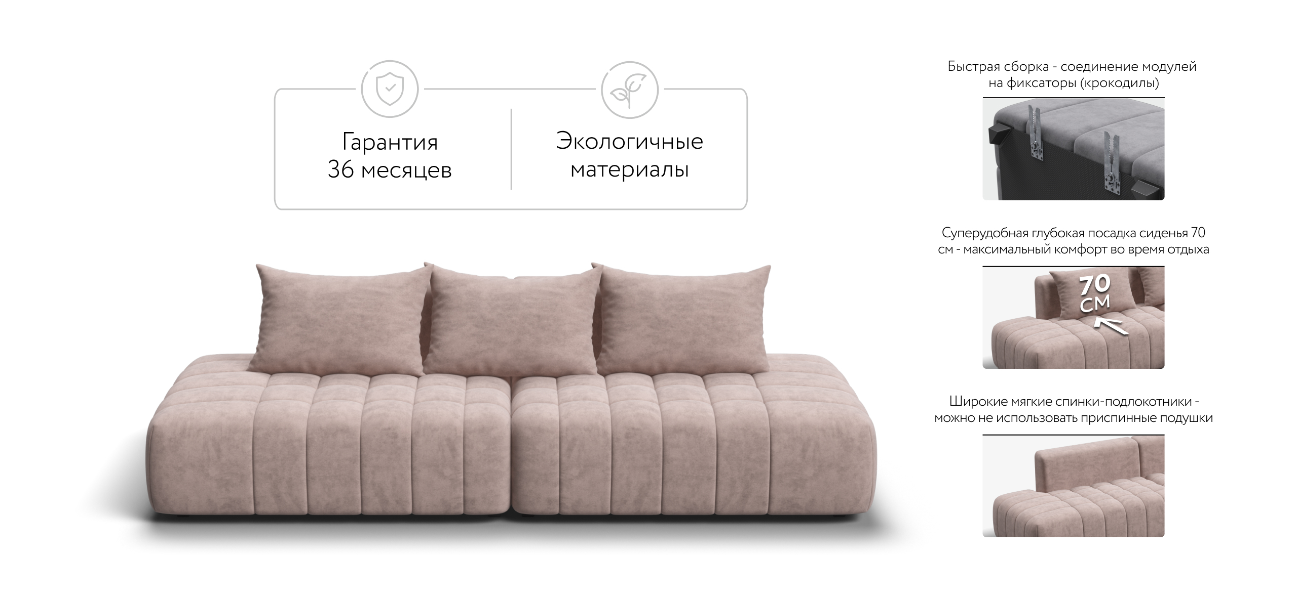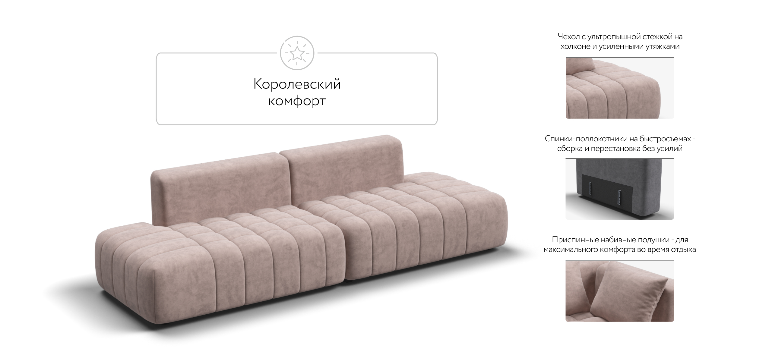 Благодаря инновационной системе креплений и быстросъёмным элементам Вы с лёгкостью можете поменять конфигурацию и адаптировать диван под новое пространство.