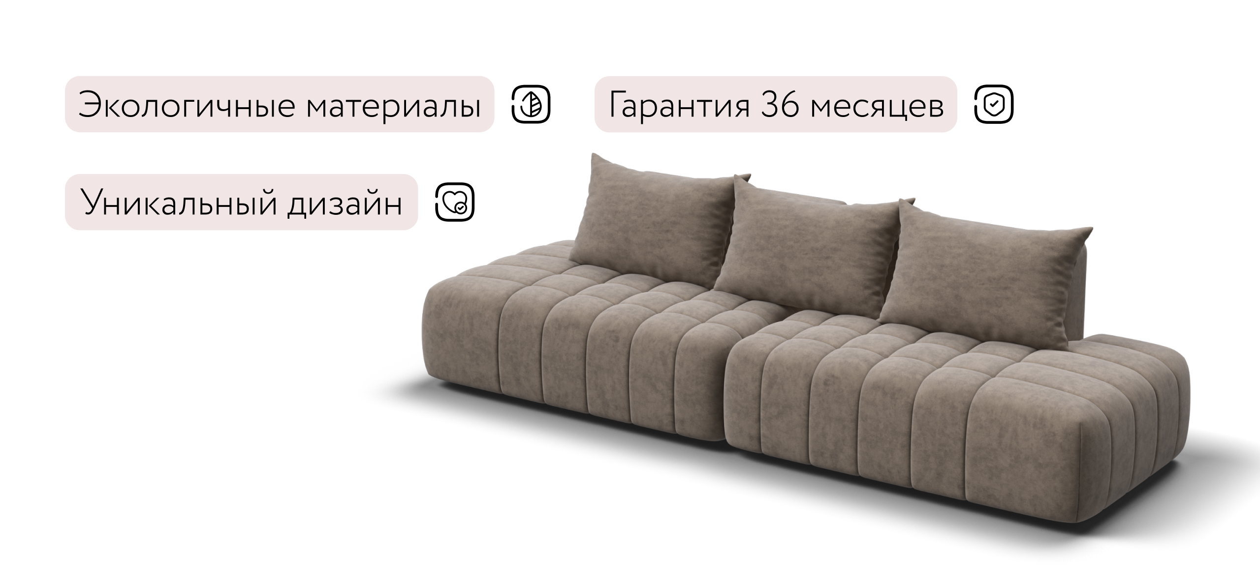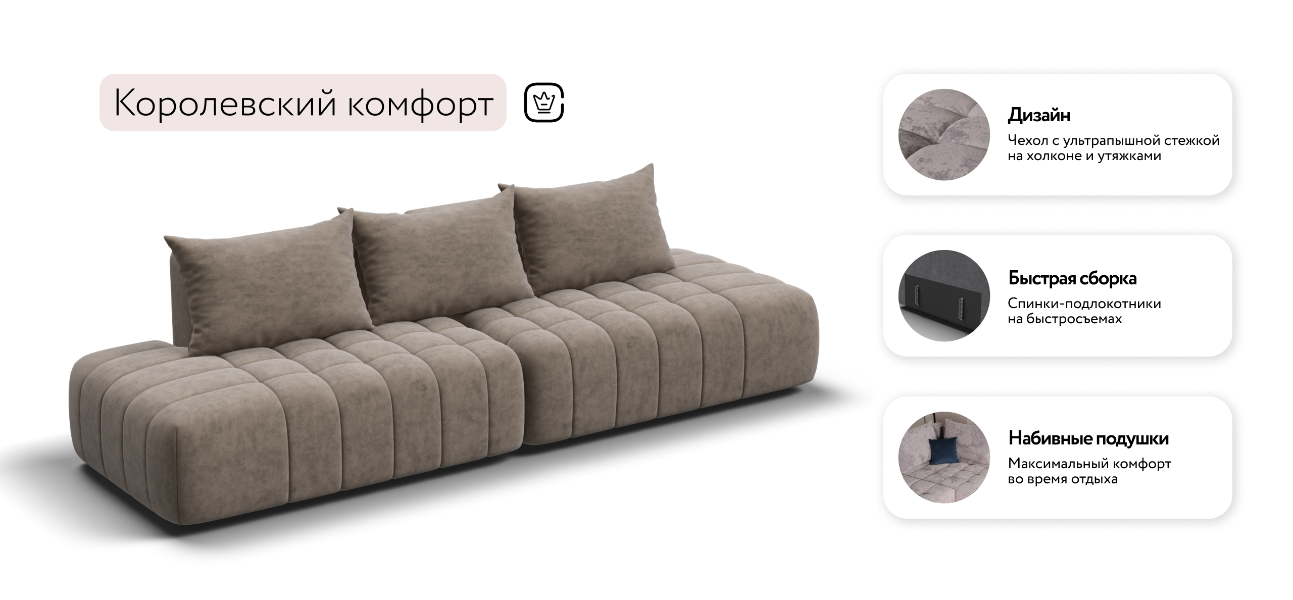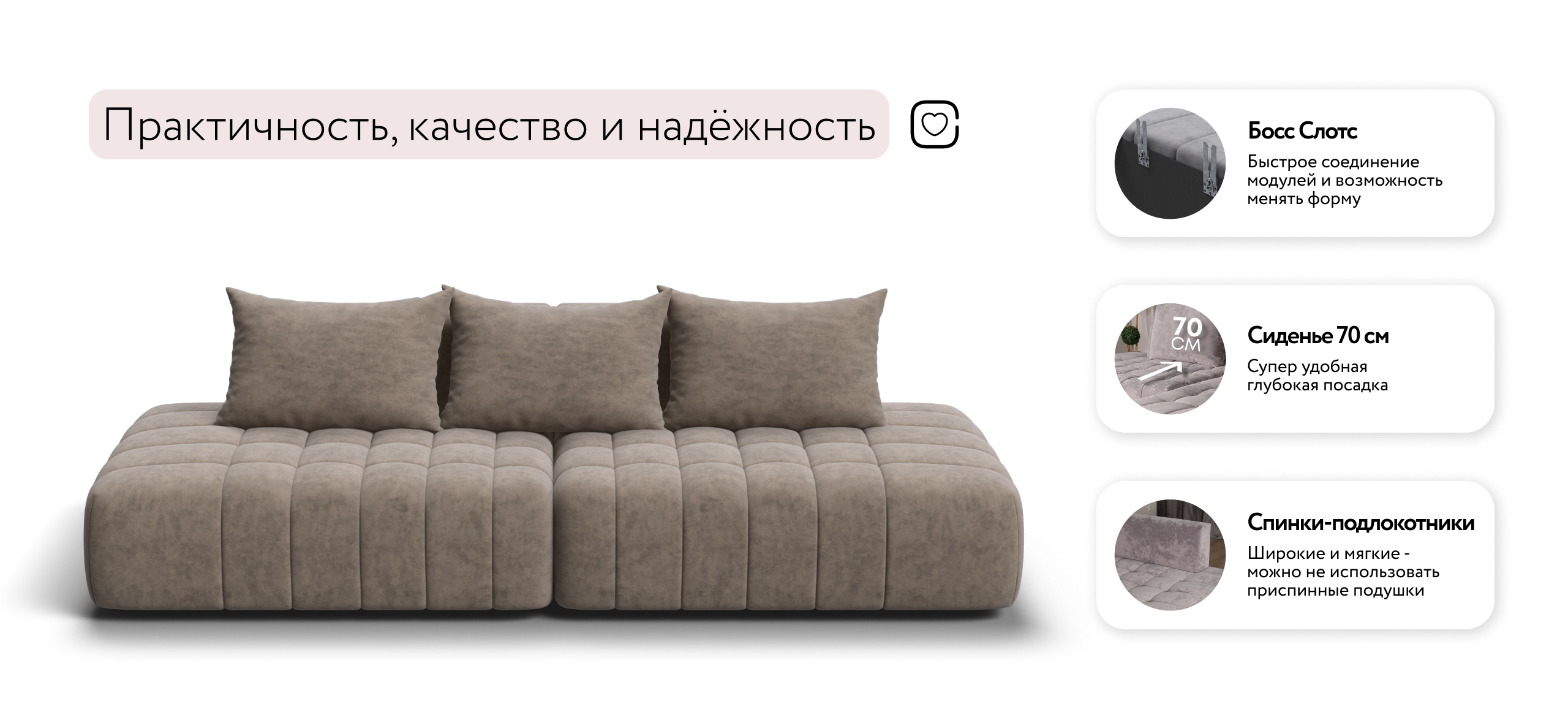 Благодаря инновационной системе креплений и быстросъёмным элементам Вы с лёгкостью можете поменять конфигурацию и адаптировать диван под новое пространство.