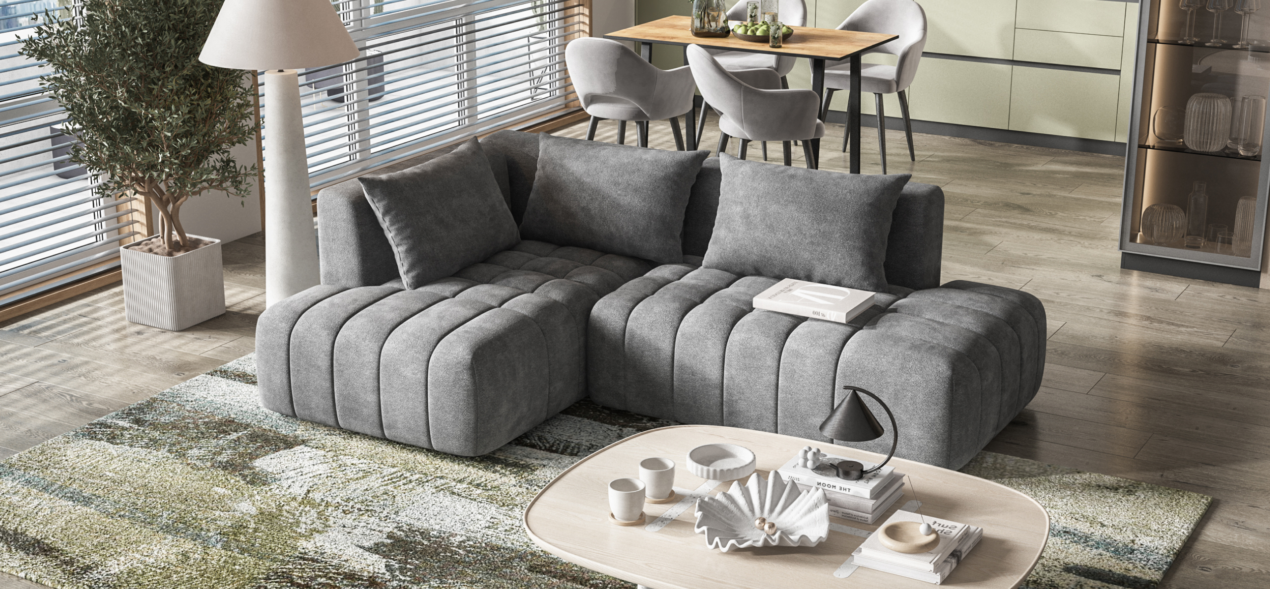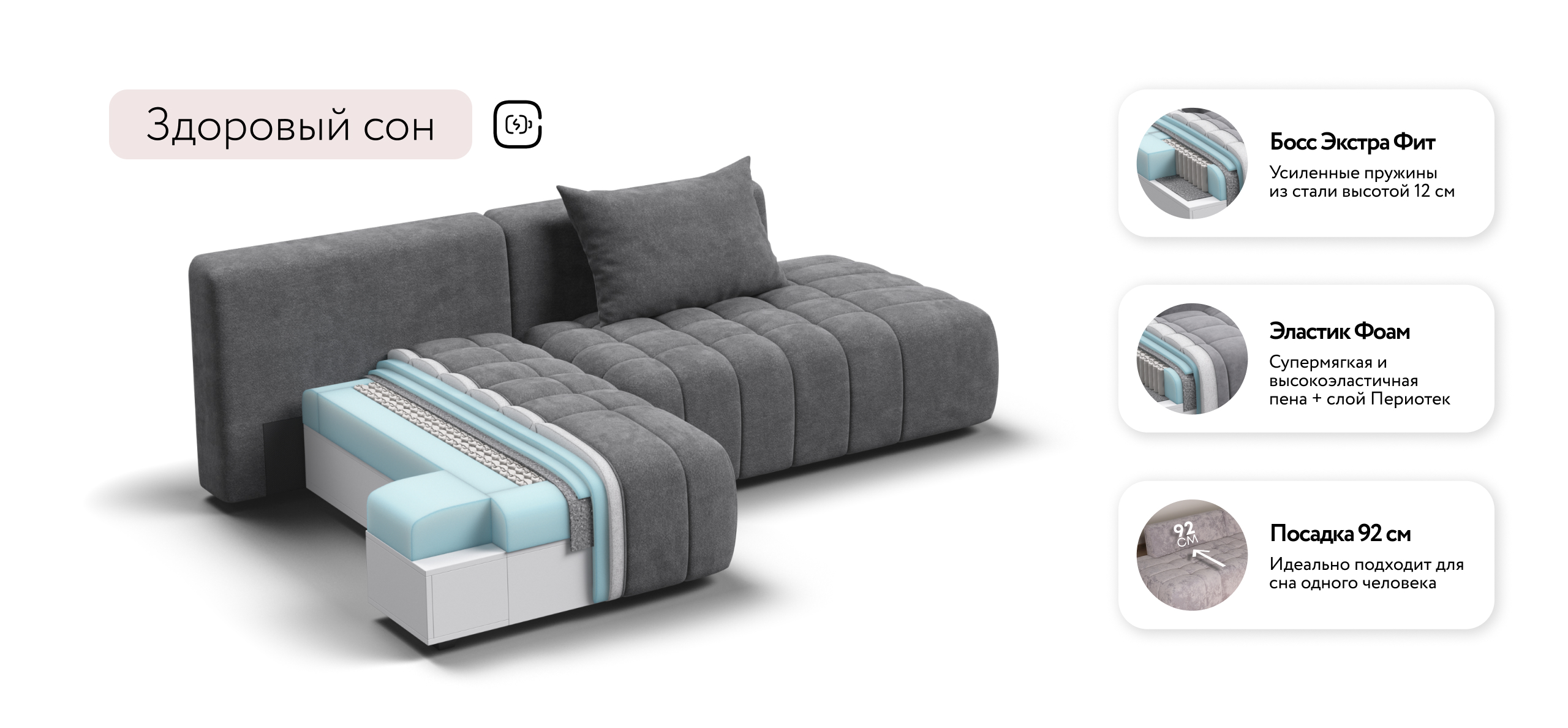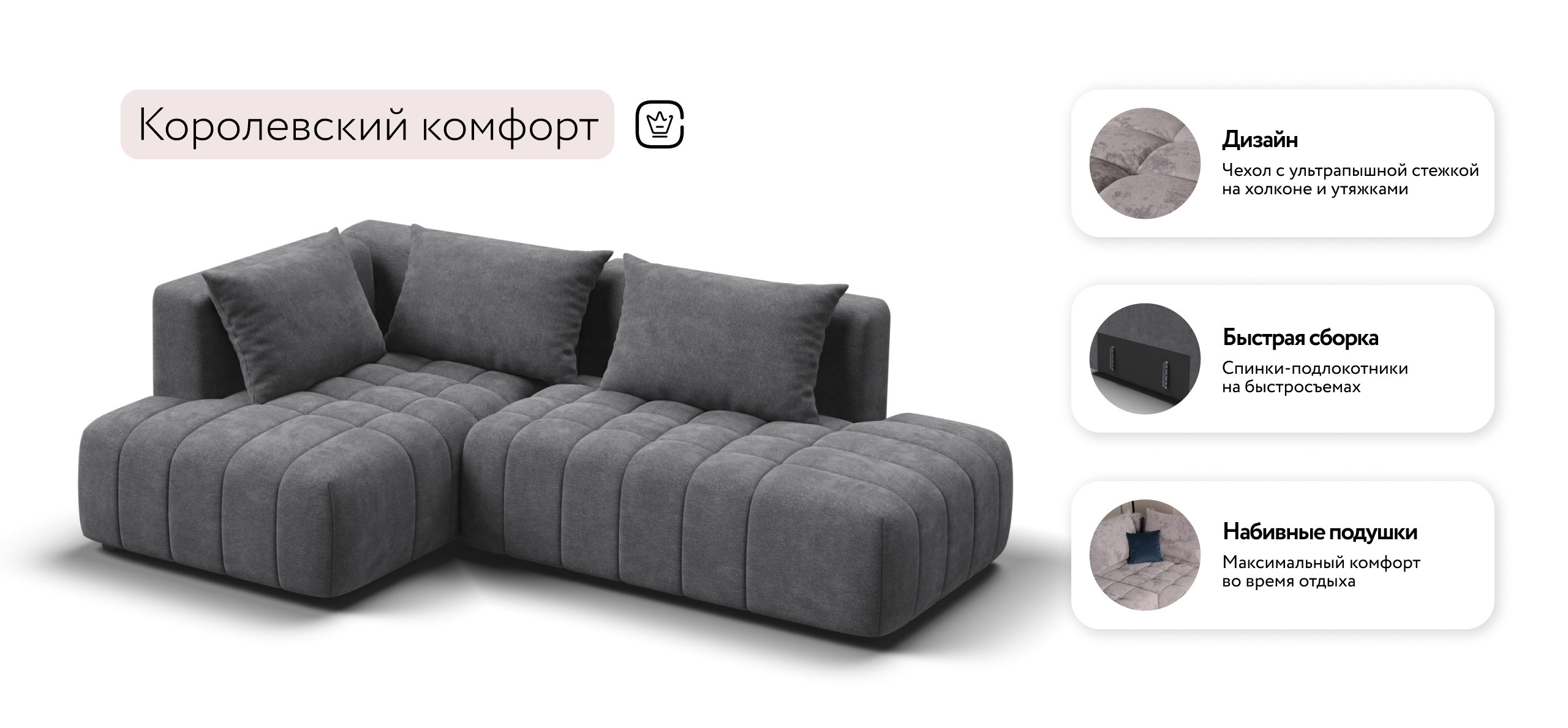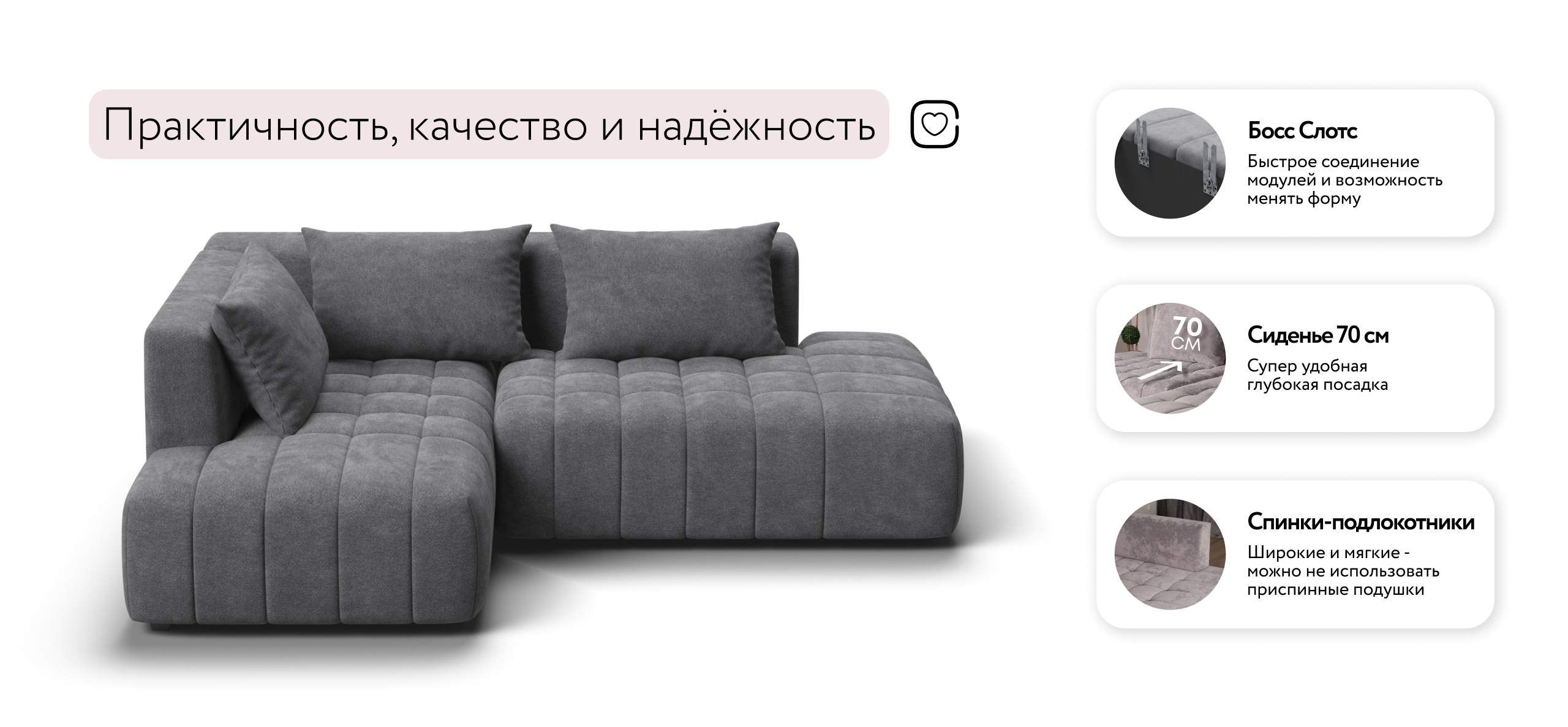 Благодаря инновационной системе креплений и быстросъёмным элементам Вы с лёгкостью можете поменять конфигурацию и адаптировать диван под новое пространство.