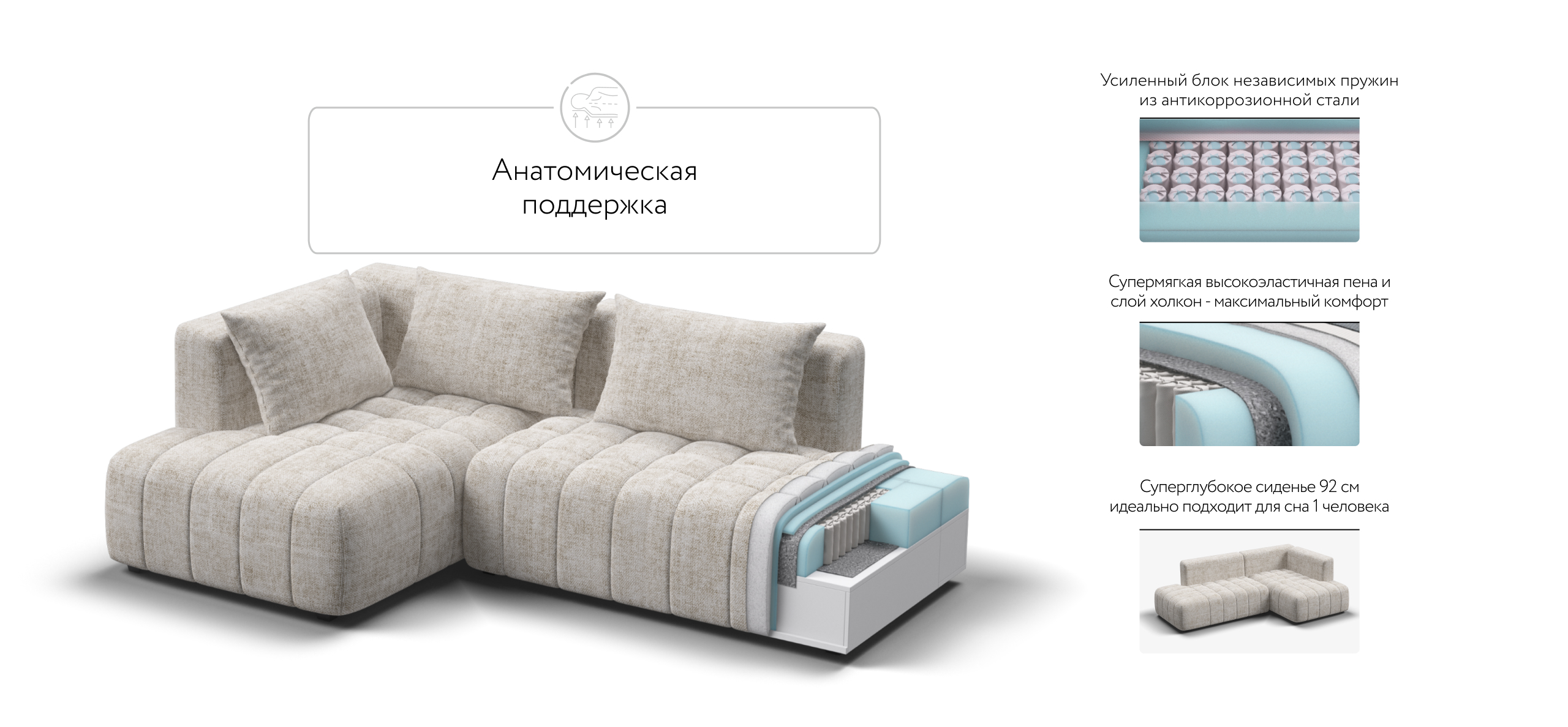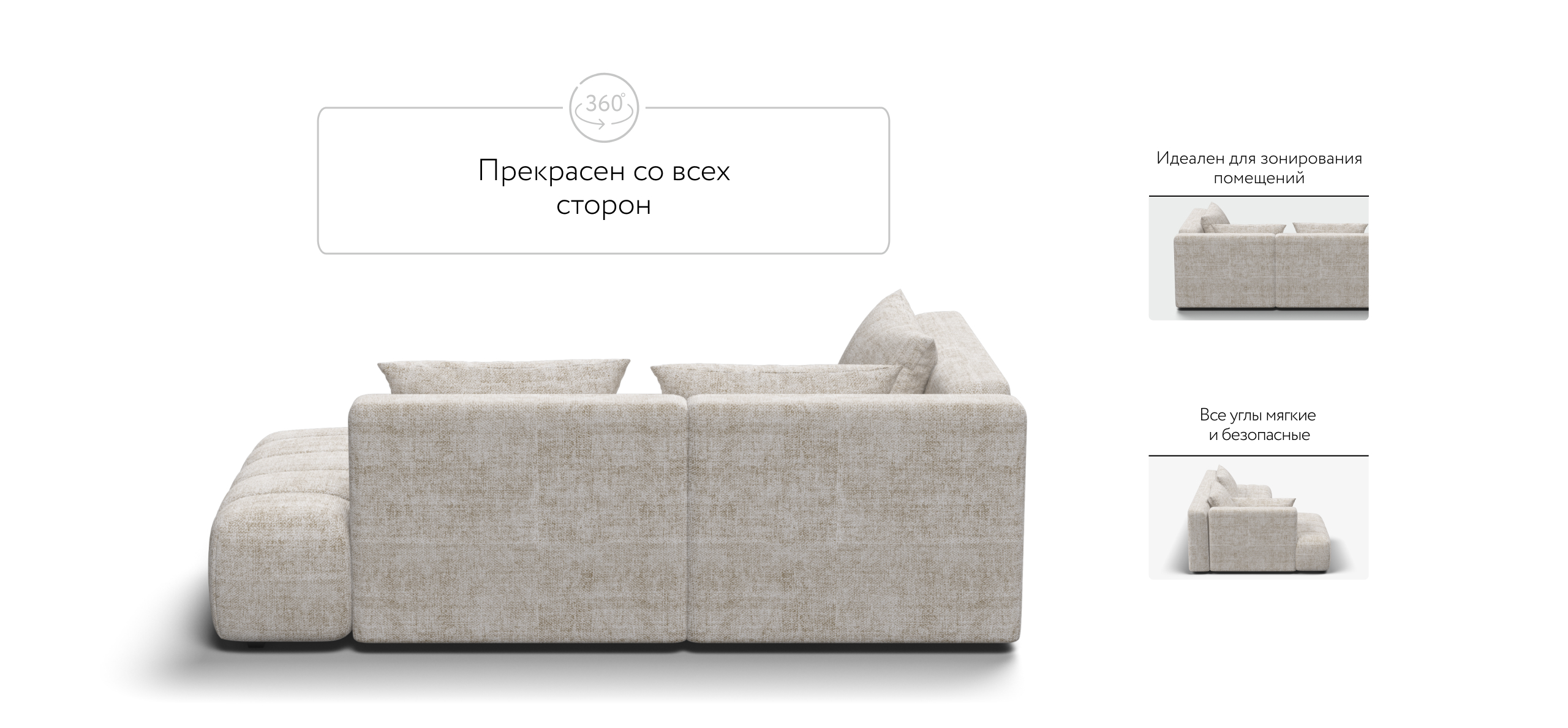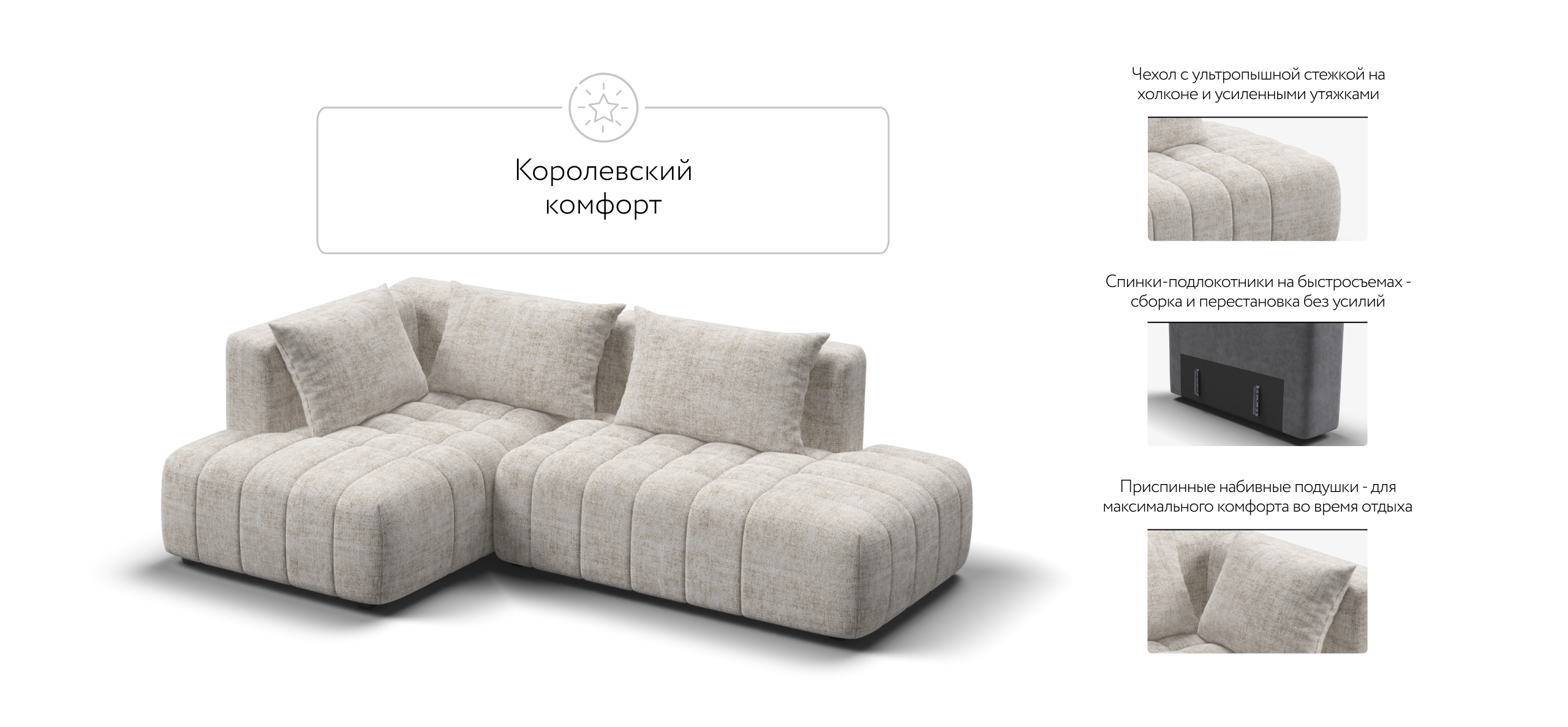 Благодаря инновационной системе креплений и быстросъёмным элементам Вы с лёгкостью можете поменять конфигурацию и адаптировать диван под новое пространство.