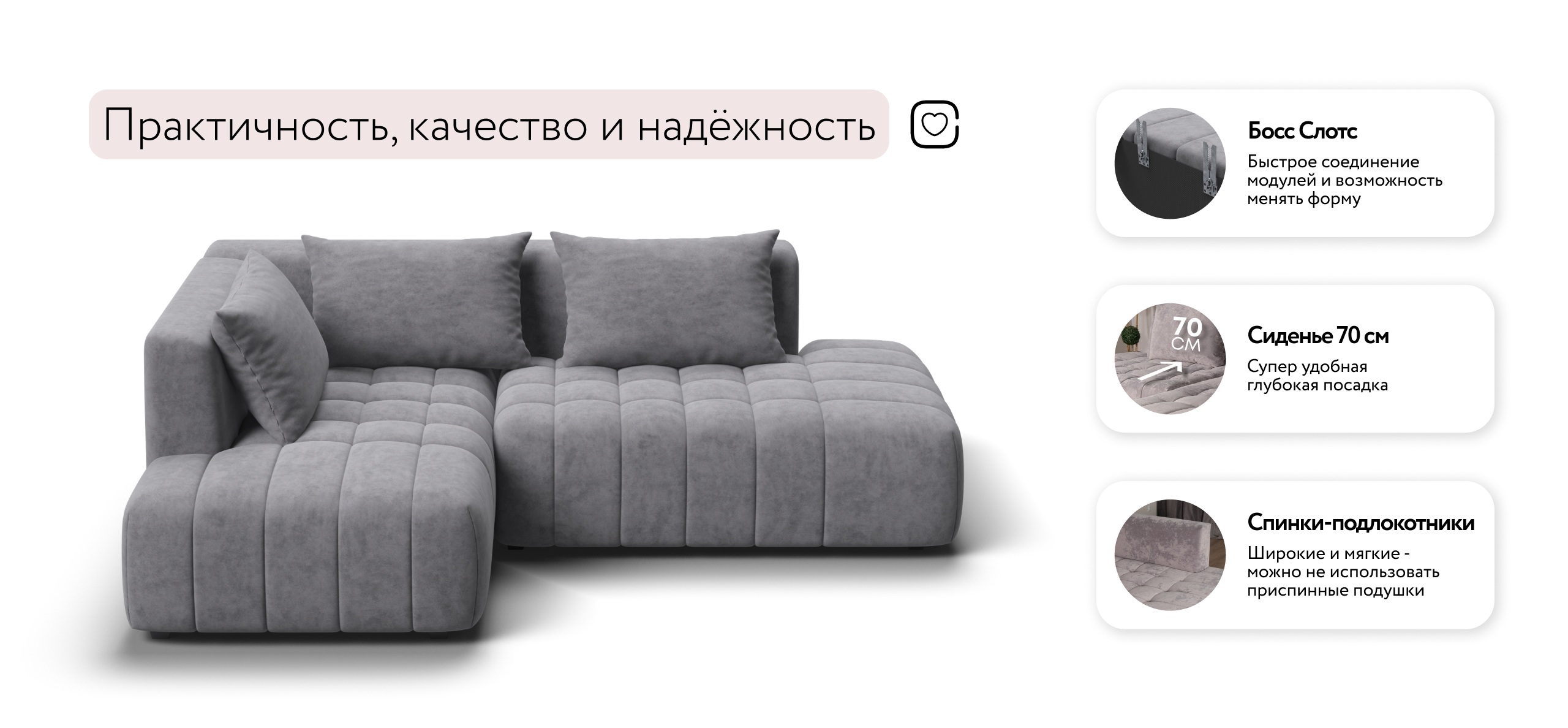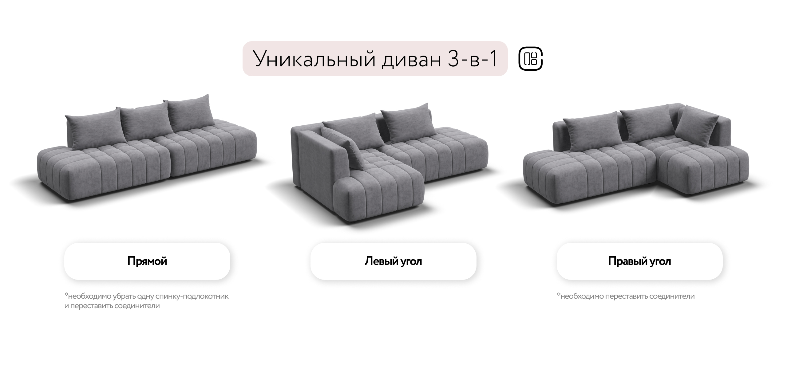 Благодаря инновационной системе креплений и быстросъёмным элементам Вы с лёгкостью можете поменять конфигурацию и адаптировать диван под новое пространство.