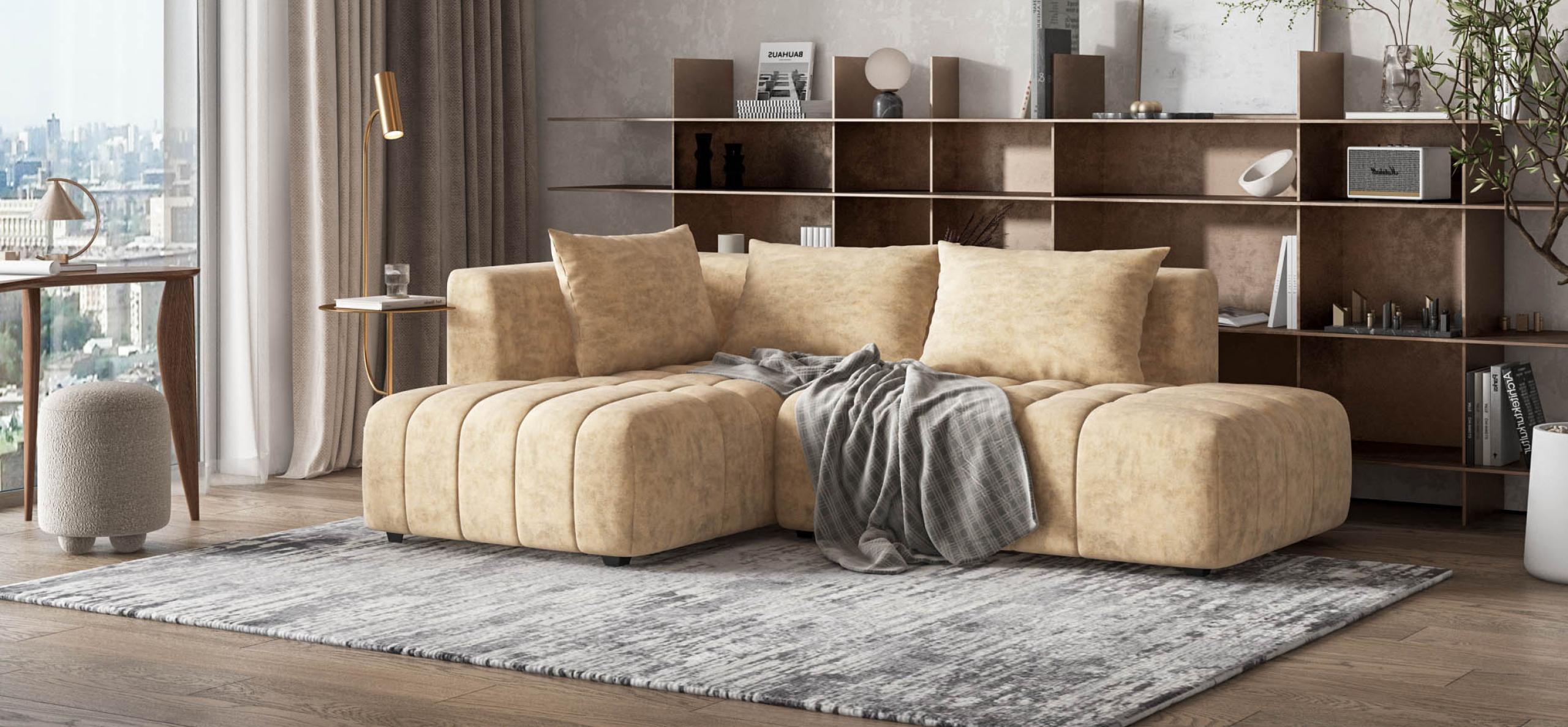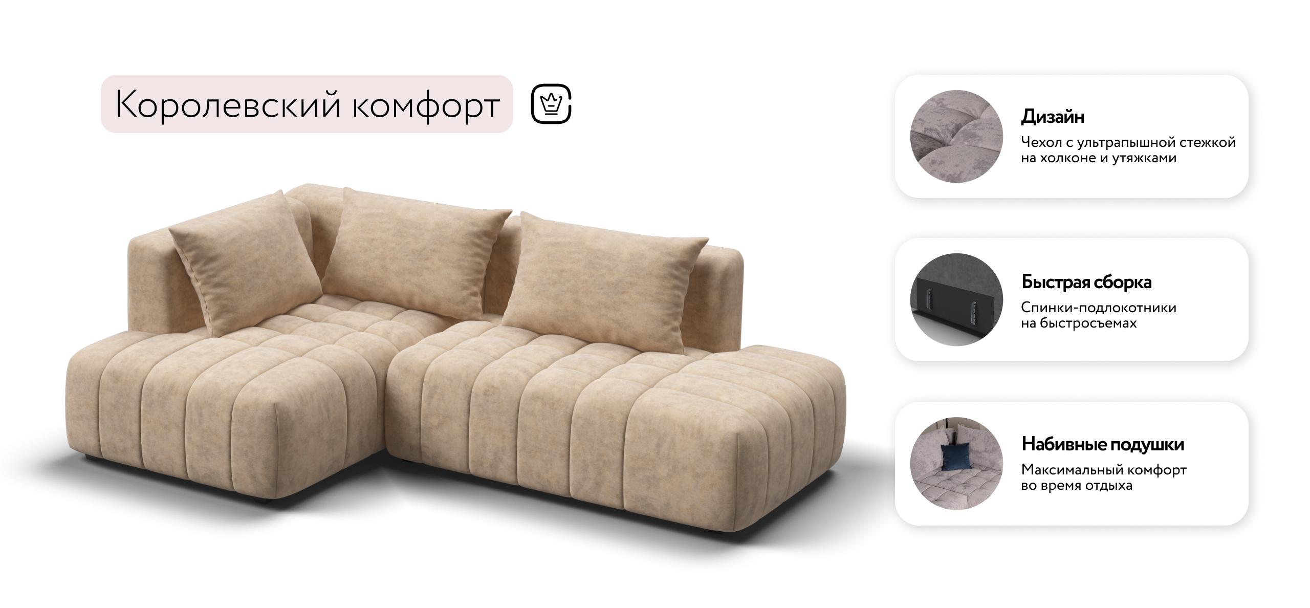 Благодаря инновационной системе креплений и быстросъёмным элементам Вы с лёгкостью можете поменять конфигурацию и адаптировать диван под новое пространство.