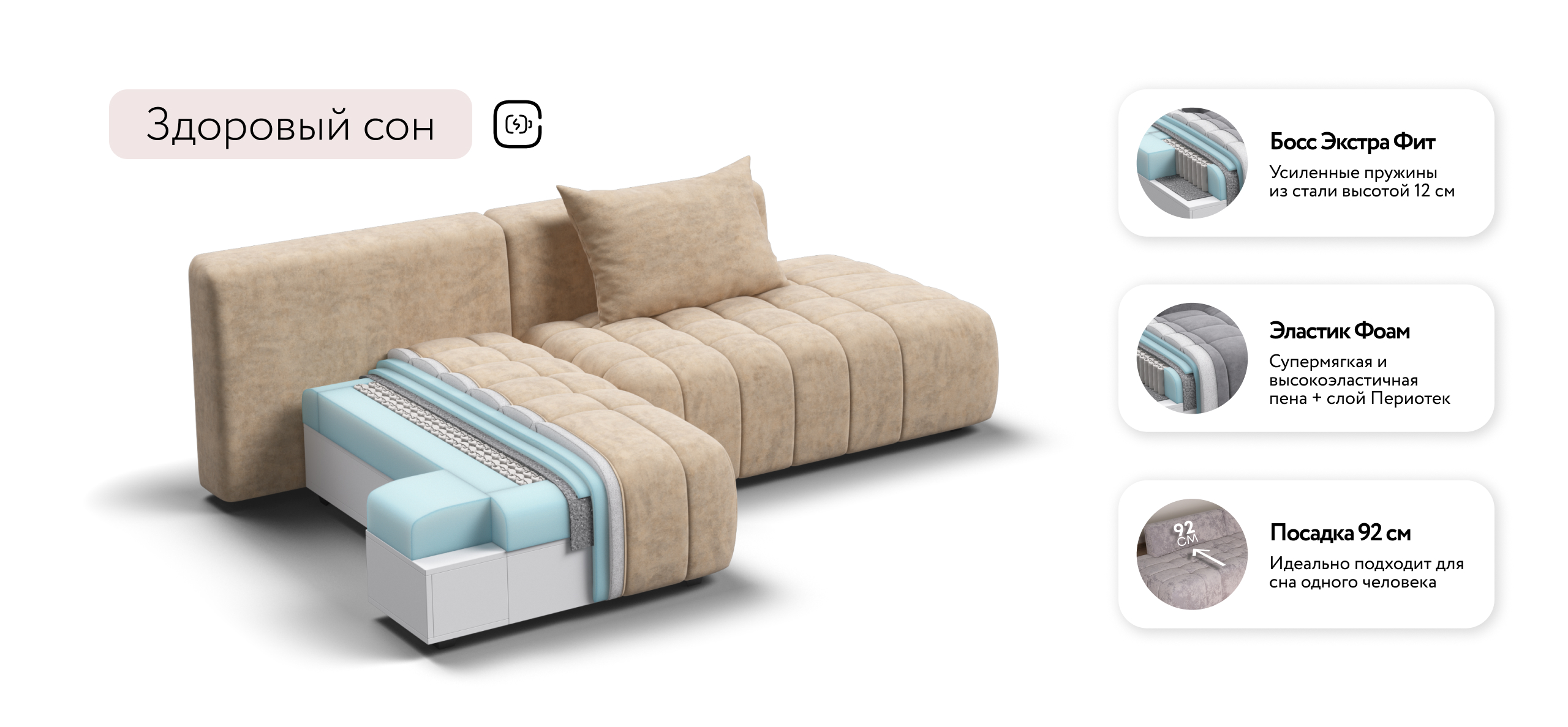 Глубокое сиденье и независимые пружины в основании словно созданы для полного расслабления, а мягкие спинки обеспечивают комфорт без лишних подушек.