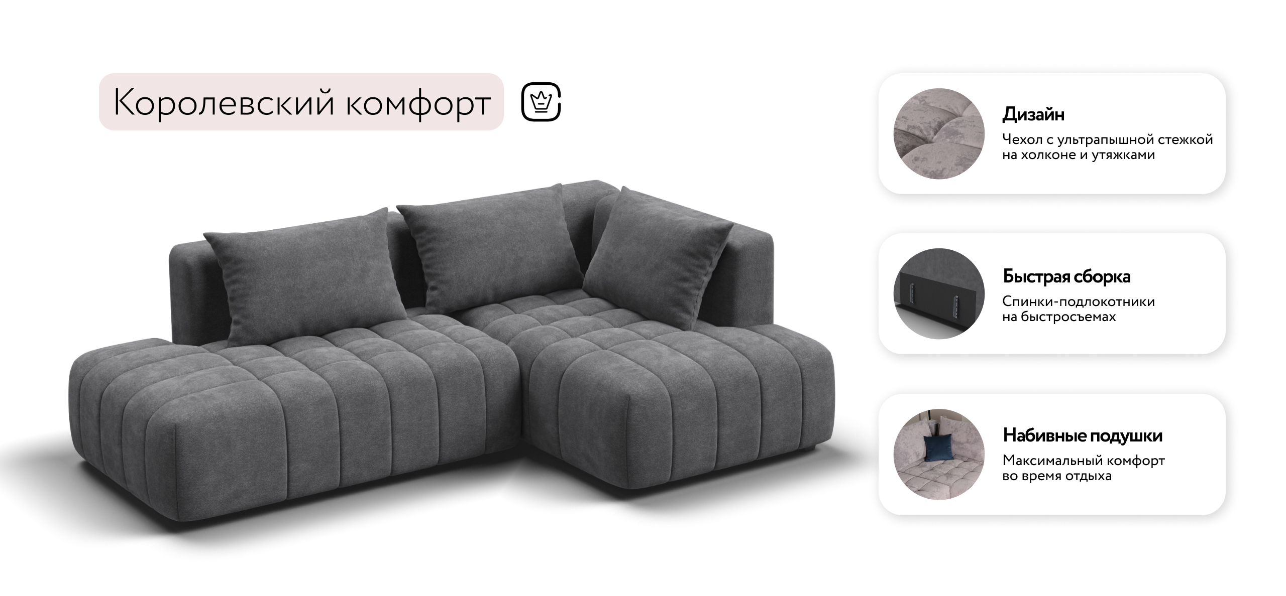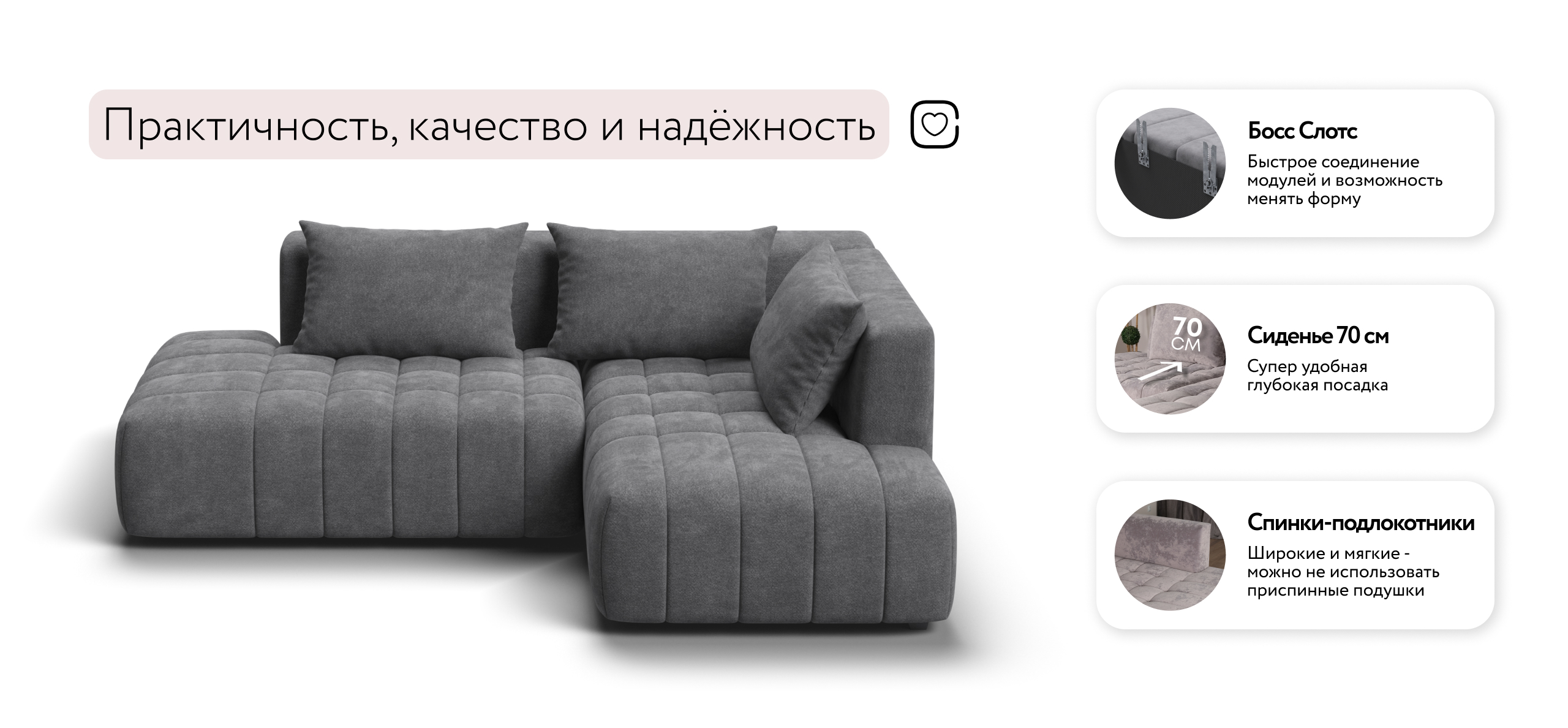 Благодаря инновационной системе креплений и быстросъёмным элементам Вы с лёгкостью можете поменять конфигурацию и адаптировать диван под новое пространство.