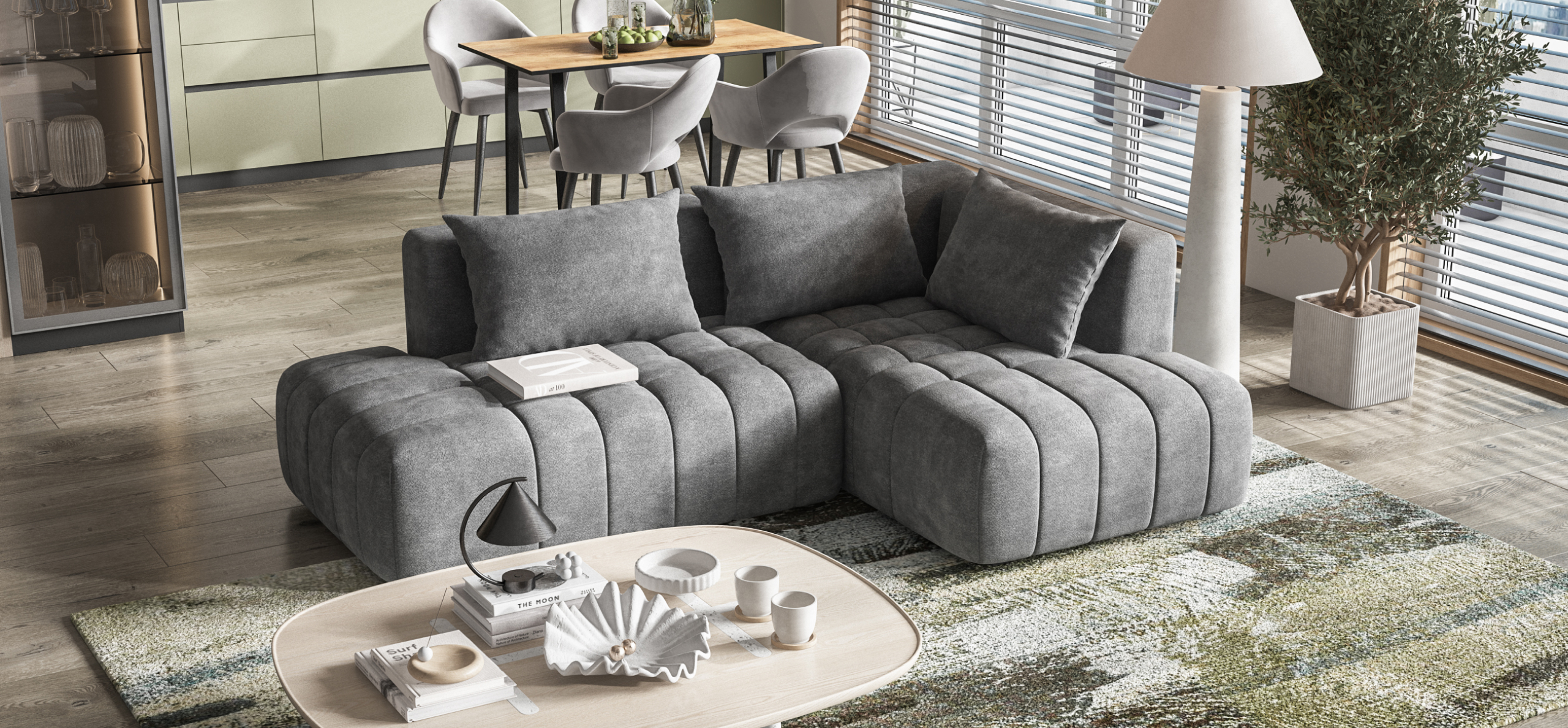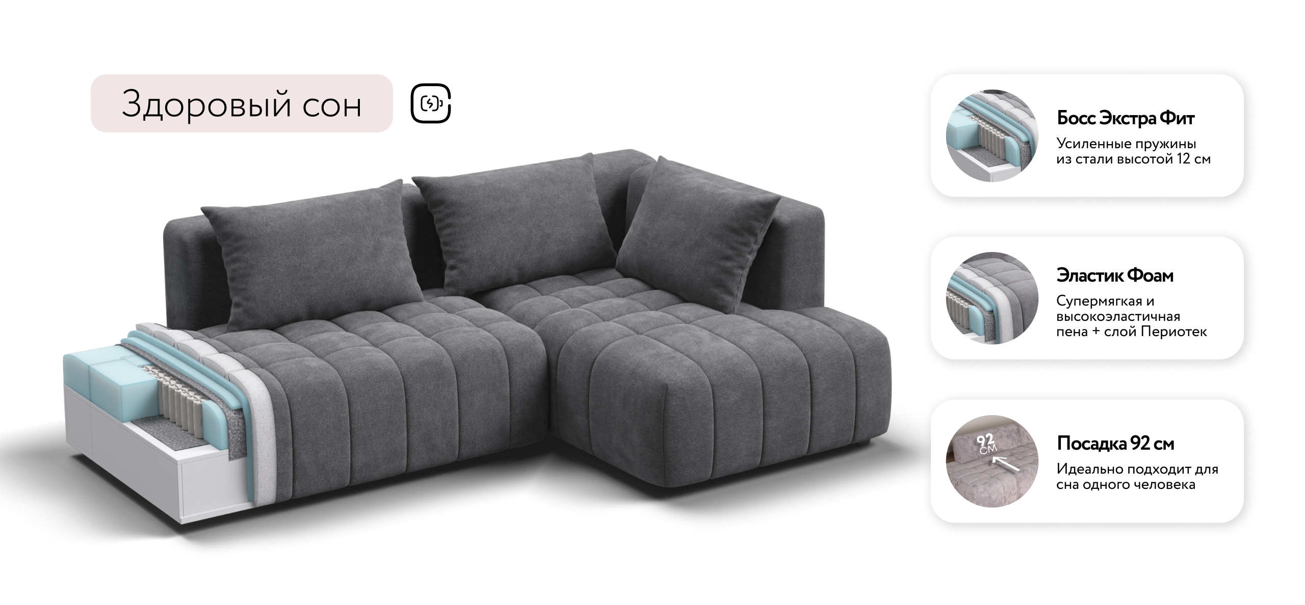 Глубокое сиденье и независимые пружины в основании словно созданы для полного расслабления, а мягкие спинки обеспечивают комфорт без лишних подушек.
