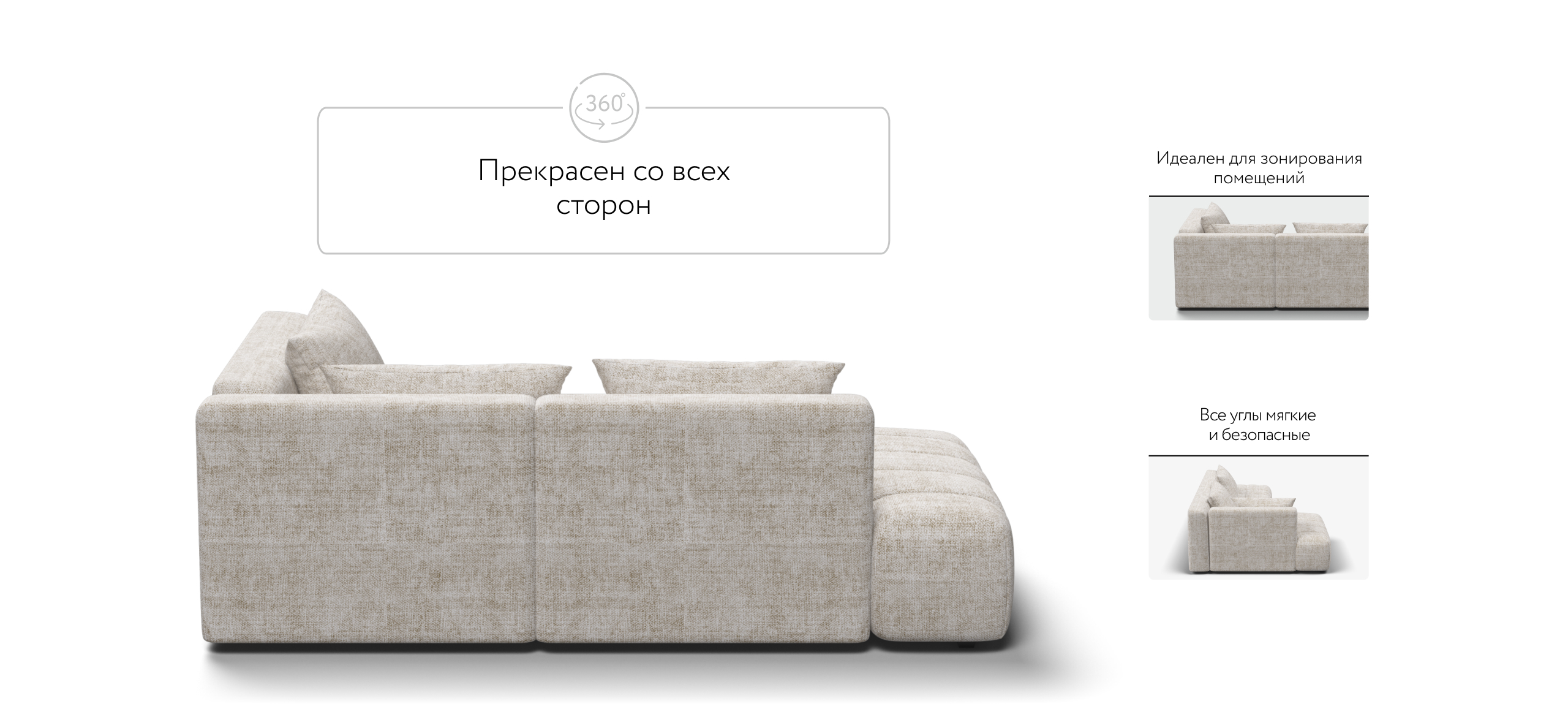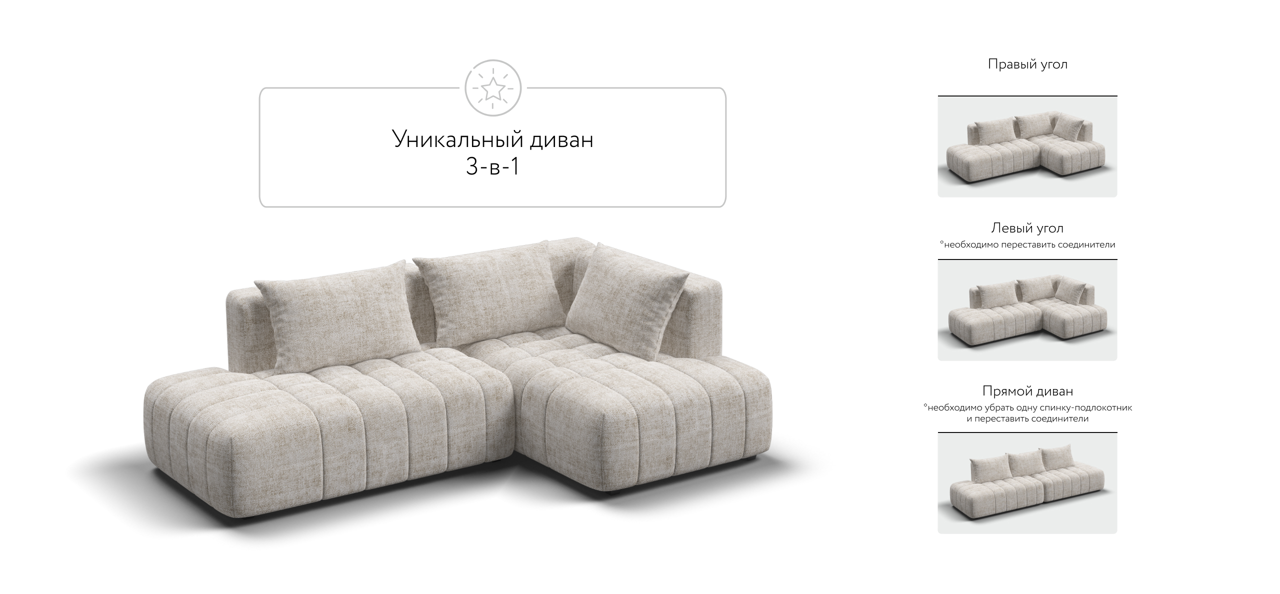Универсальный дизайн 3-в-1 позволяет быстро менять его форму — левый угол, правый угол и прямой — всё для Вашего комфорта.