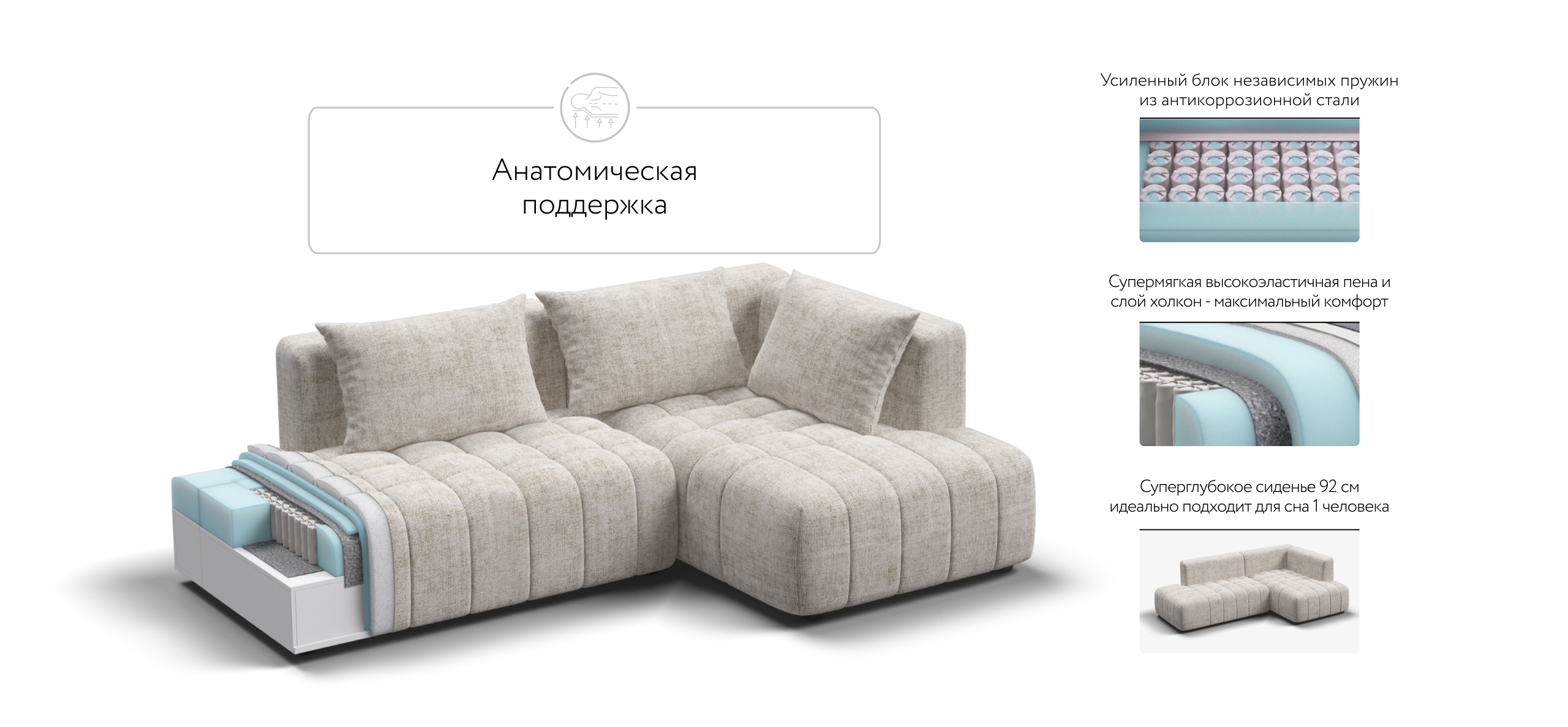 Глубокое сиденье и независимые пружины в основании словно созданы для полного расслабления, а мягкие спинки обеспечивают комфорт без лишних подушек.