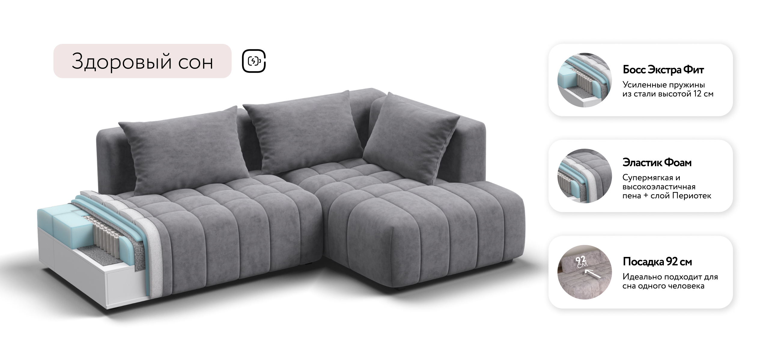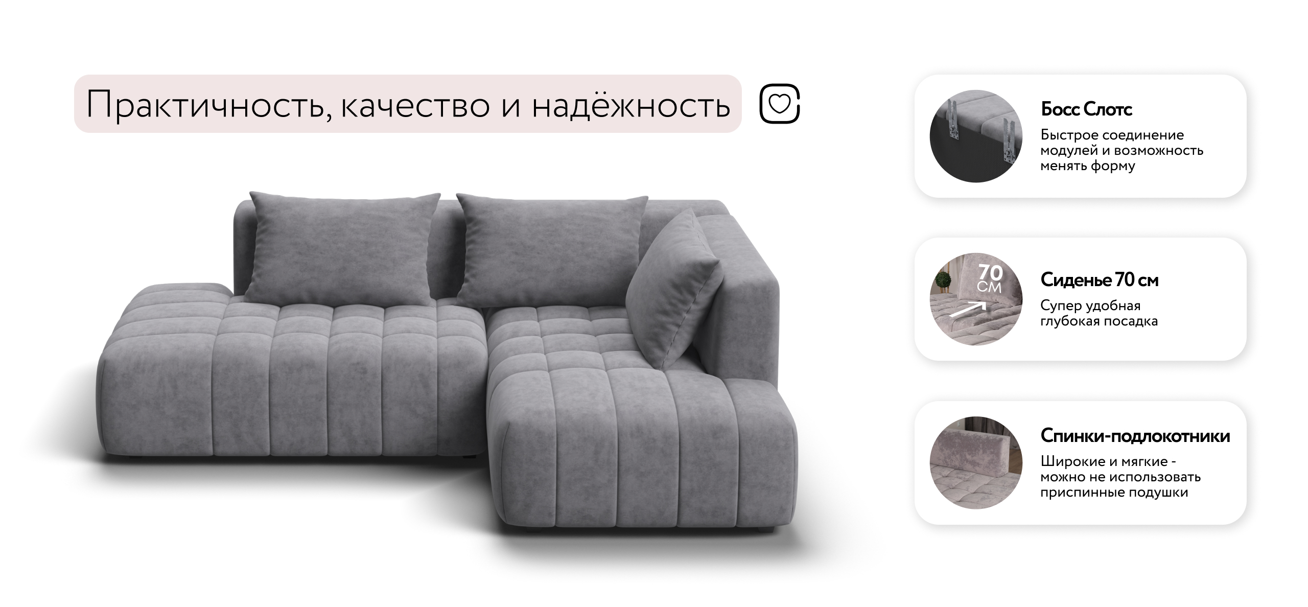 Благодаря инновационной системе креплений и быстросъёмным элементам Вы с лёгкостью можете поменять конфигурацию и адаптировать диван под новое пространство.