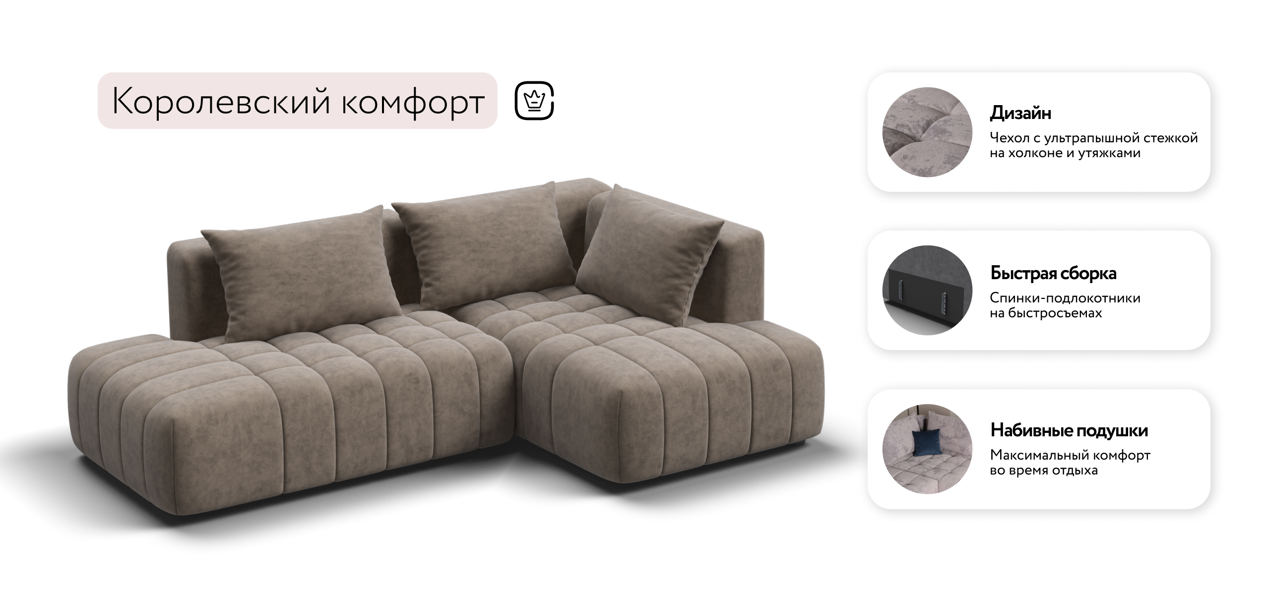 Благодаря инновационной системе креплений и быстросъёмным элементам Вы с лёгкостью можете поменять конфигурацию и адаптировать диван под новое пространство.