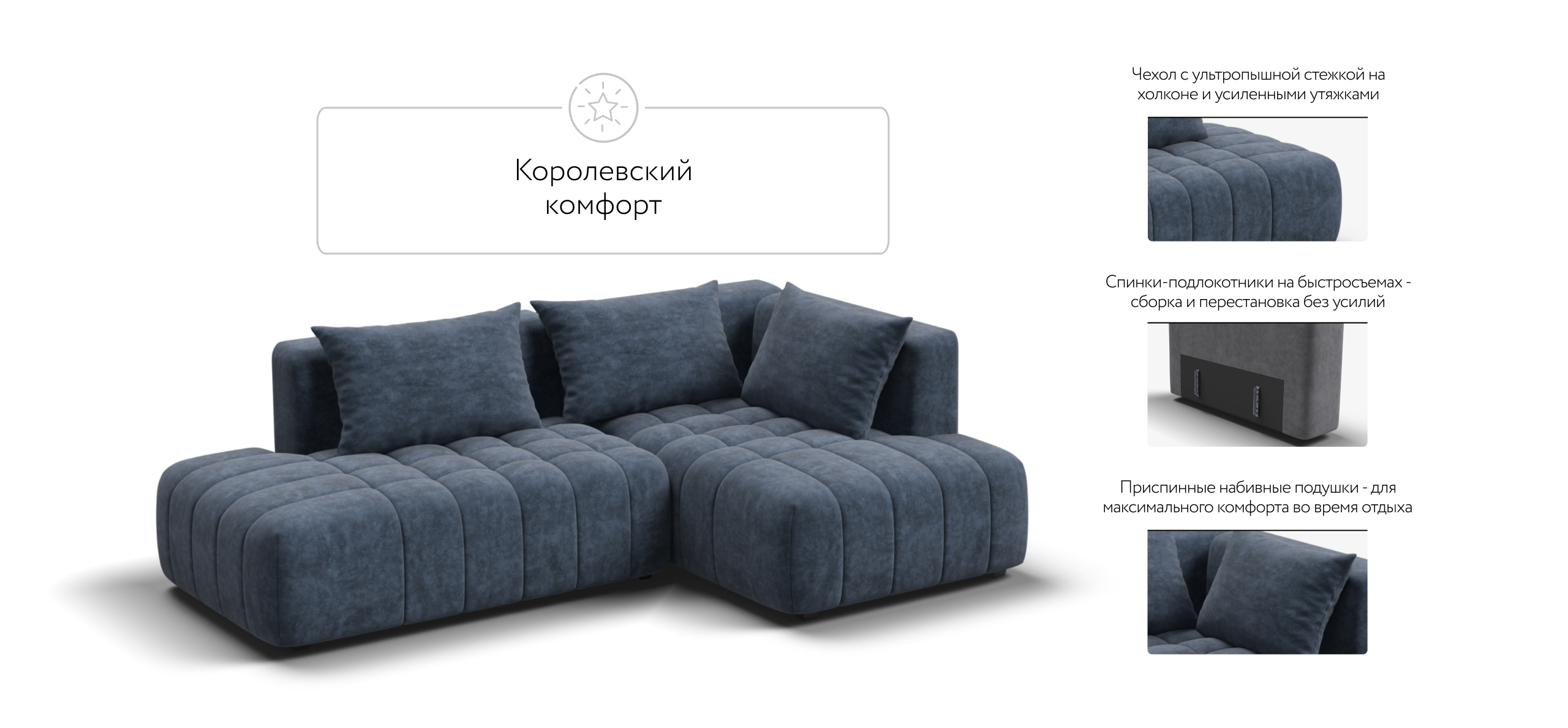 Благодаря инновационной системе креплений и быстросъёмным элементам Вы с лёгкостью можете поменять конфигурацию и адаптировать диван под новое пространство.