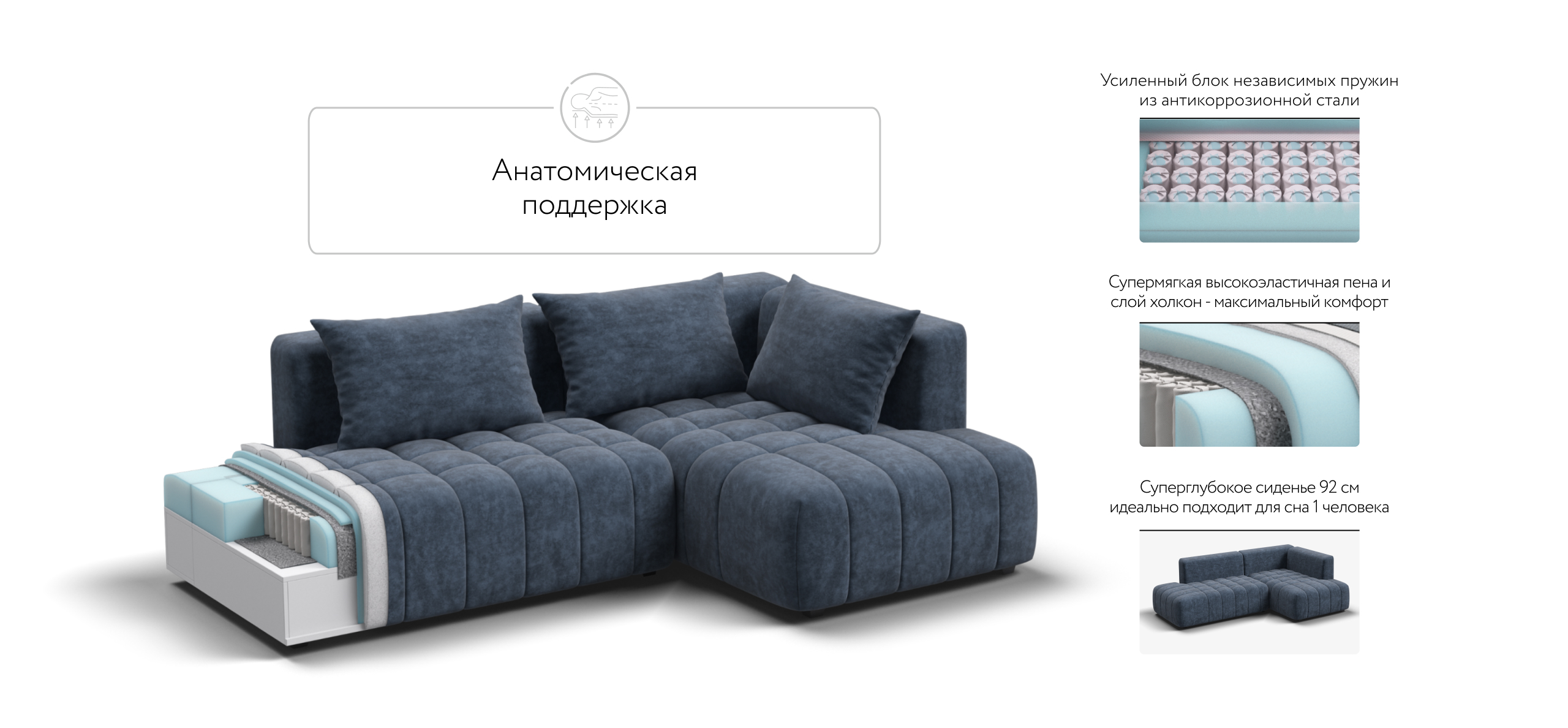 Глубокое сиденье и независимые пружины в основании словно созданы для полного расслабления, а мягкие спинки обеспечивают комфорт без лишних подушек.