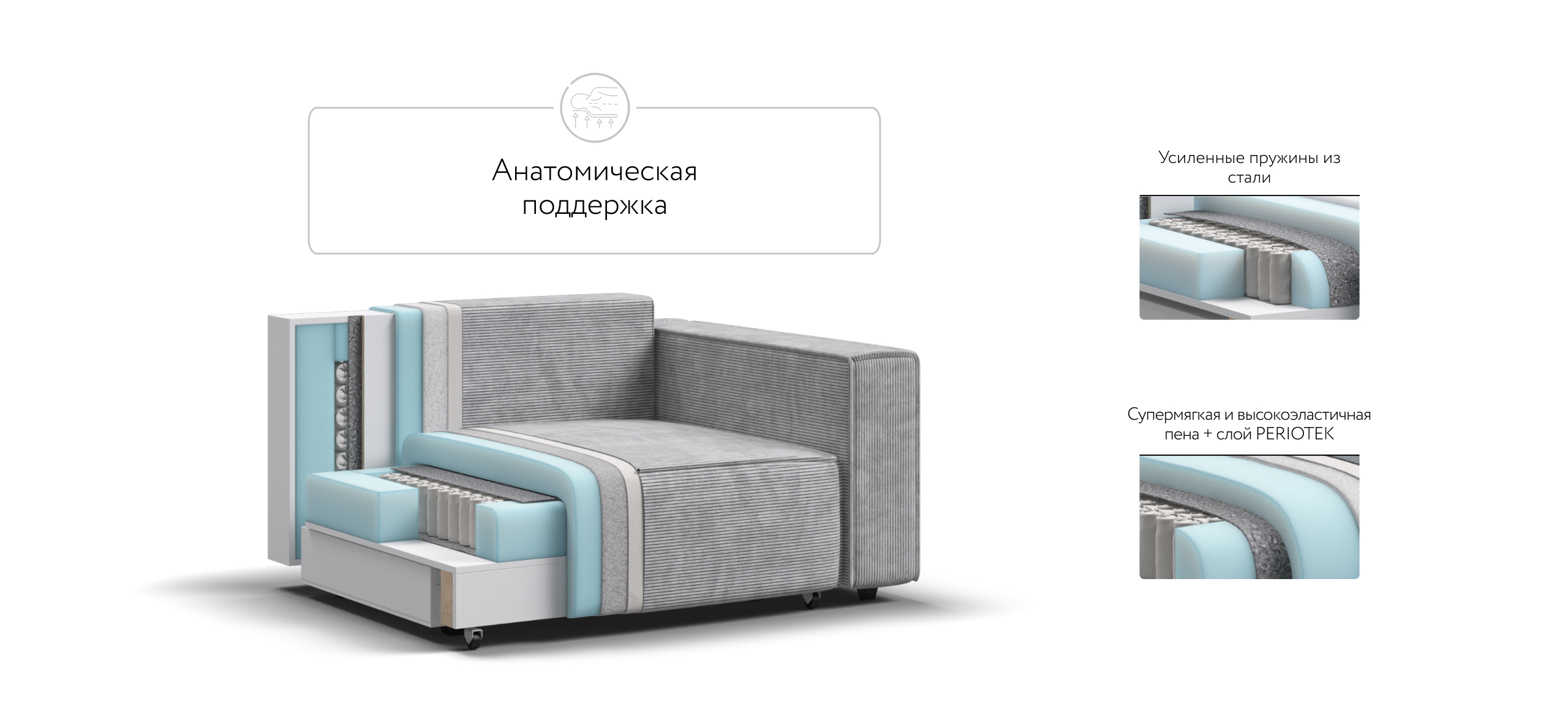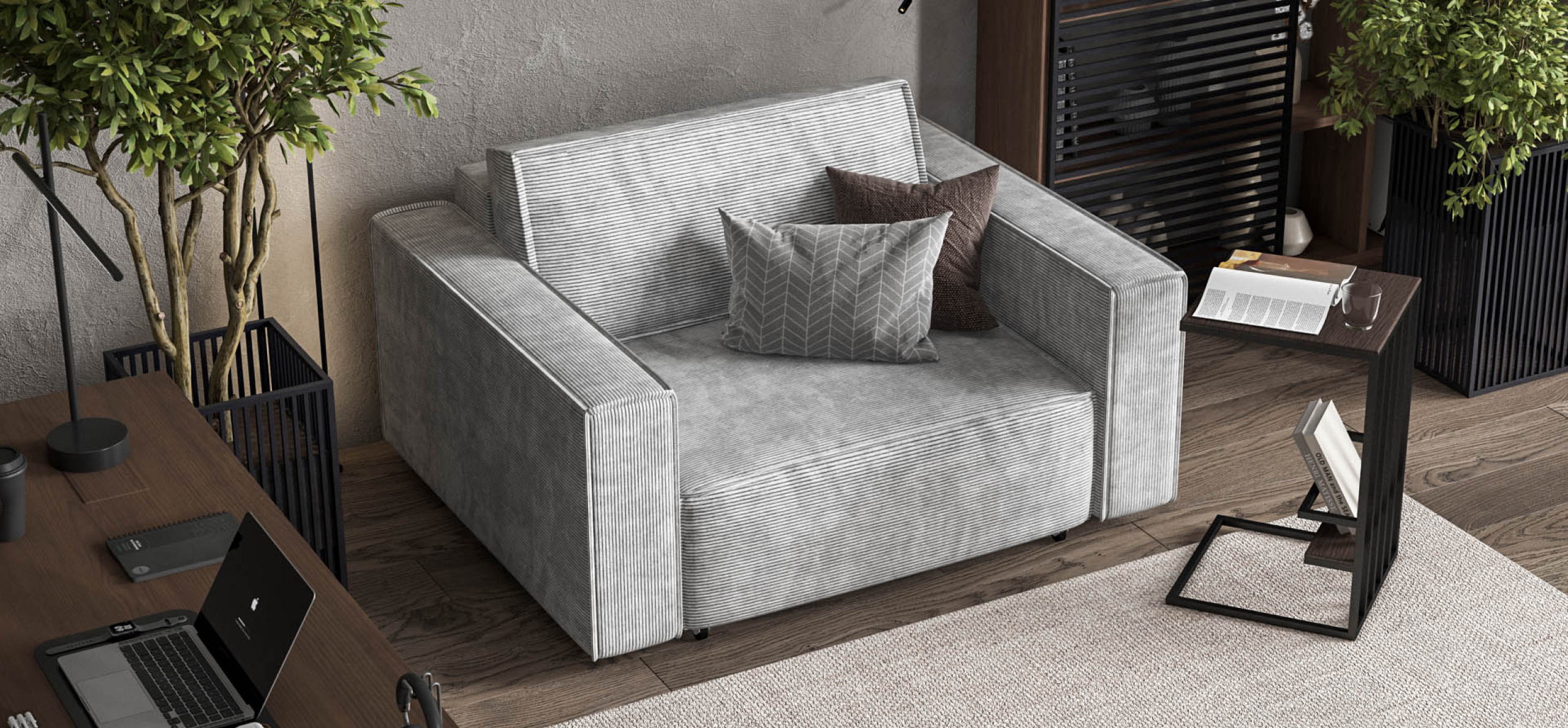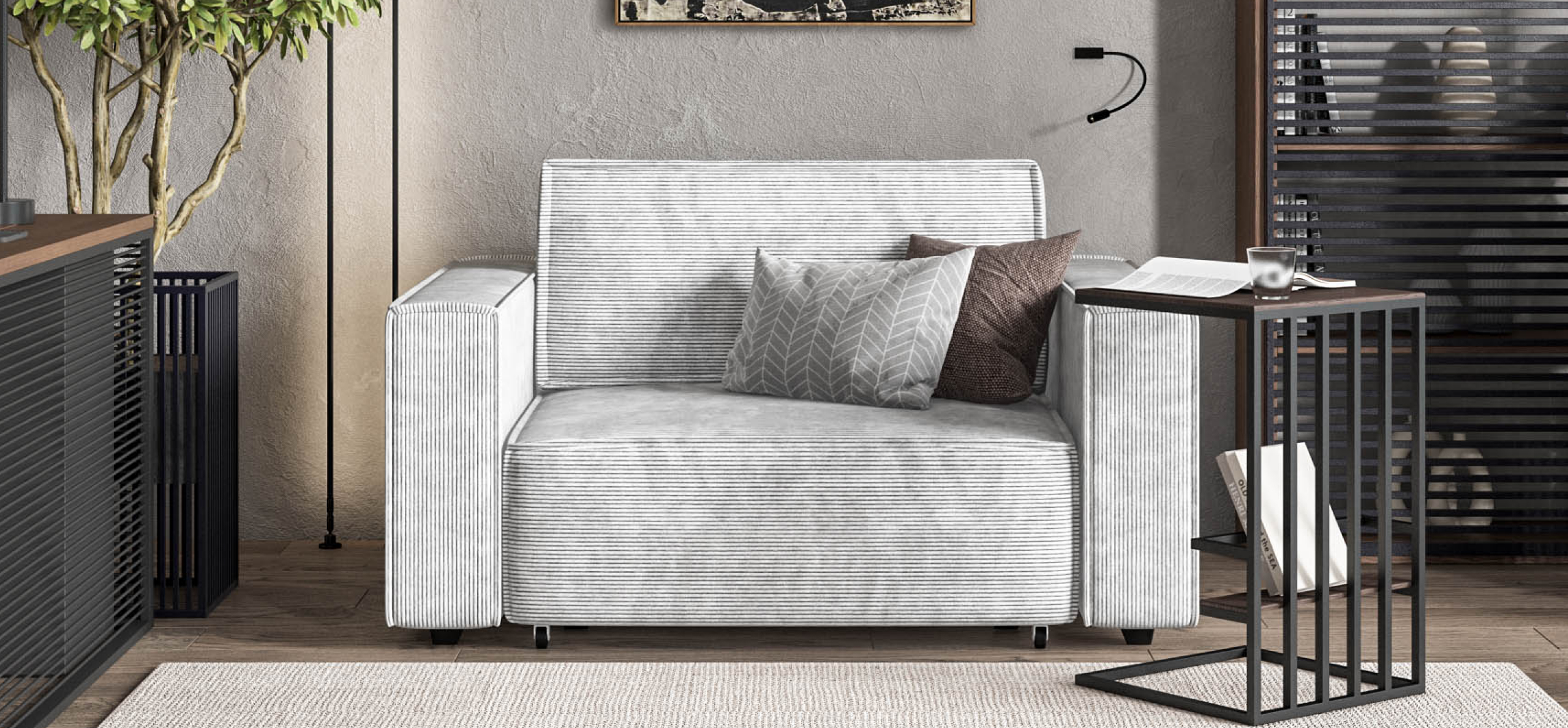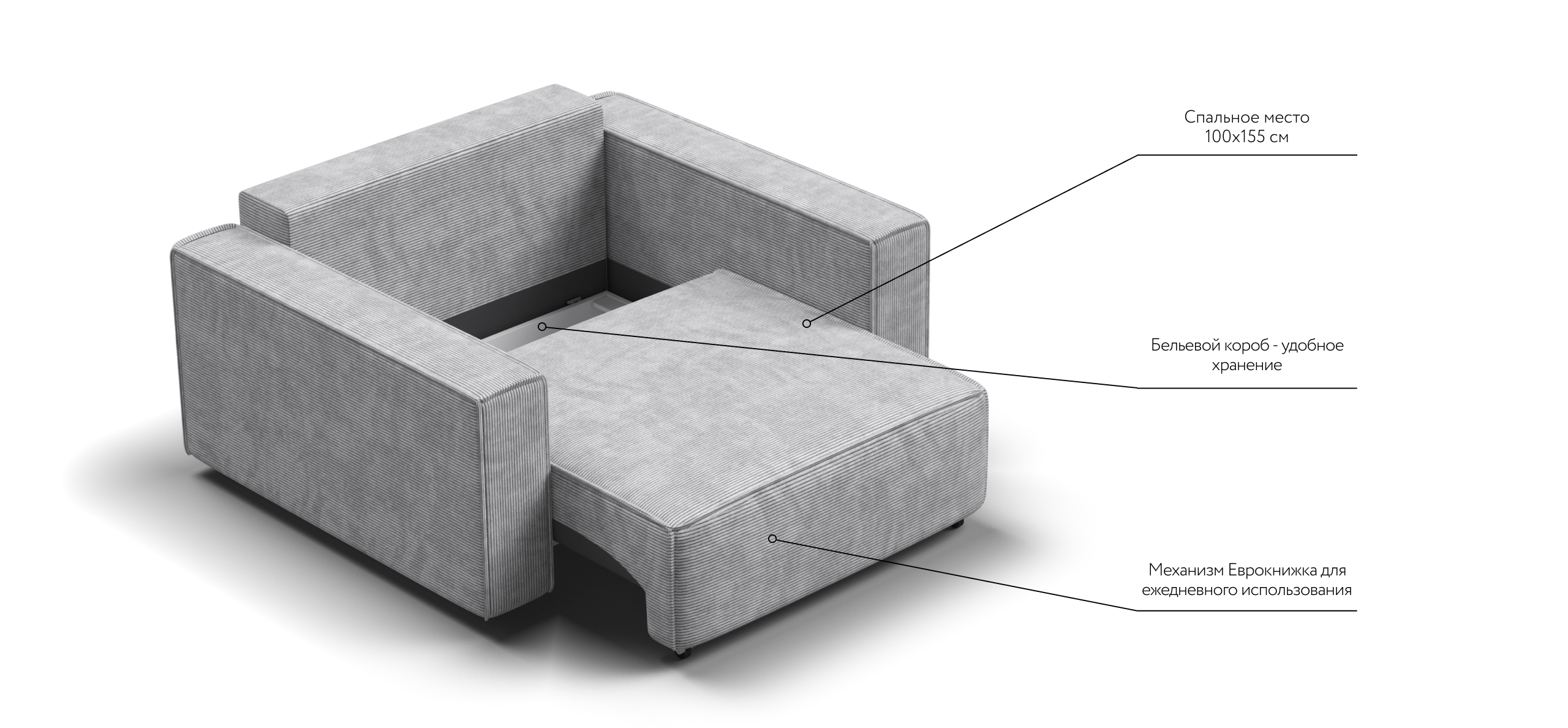 Широкие прямоугольные подлокотники, строгая симметрия и минималистичная отделка идеально дополнит современный интерьер Вашей гостиной.