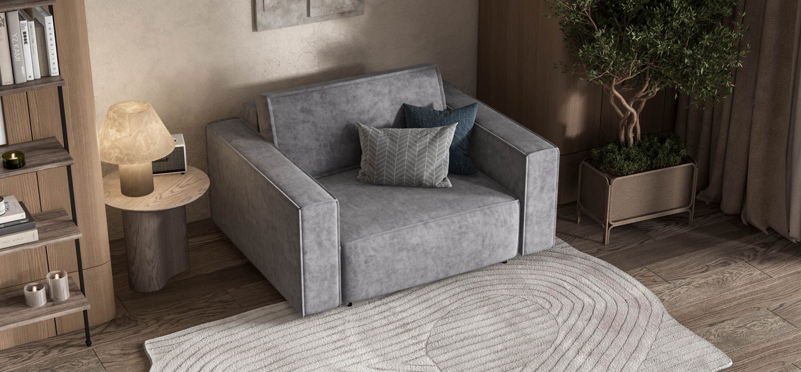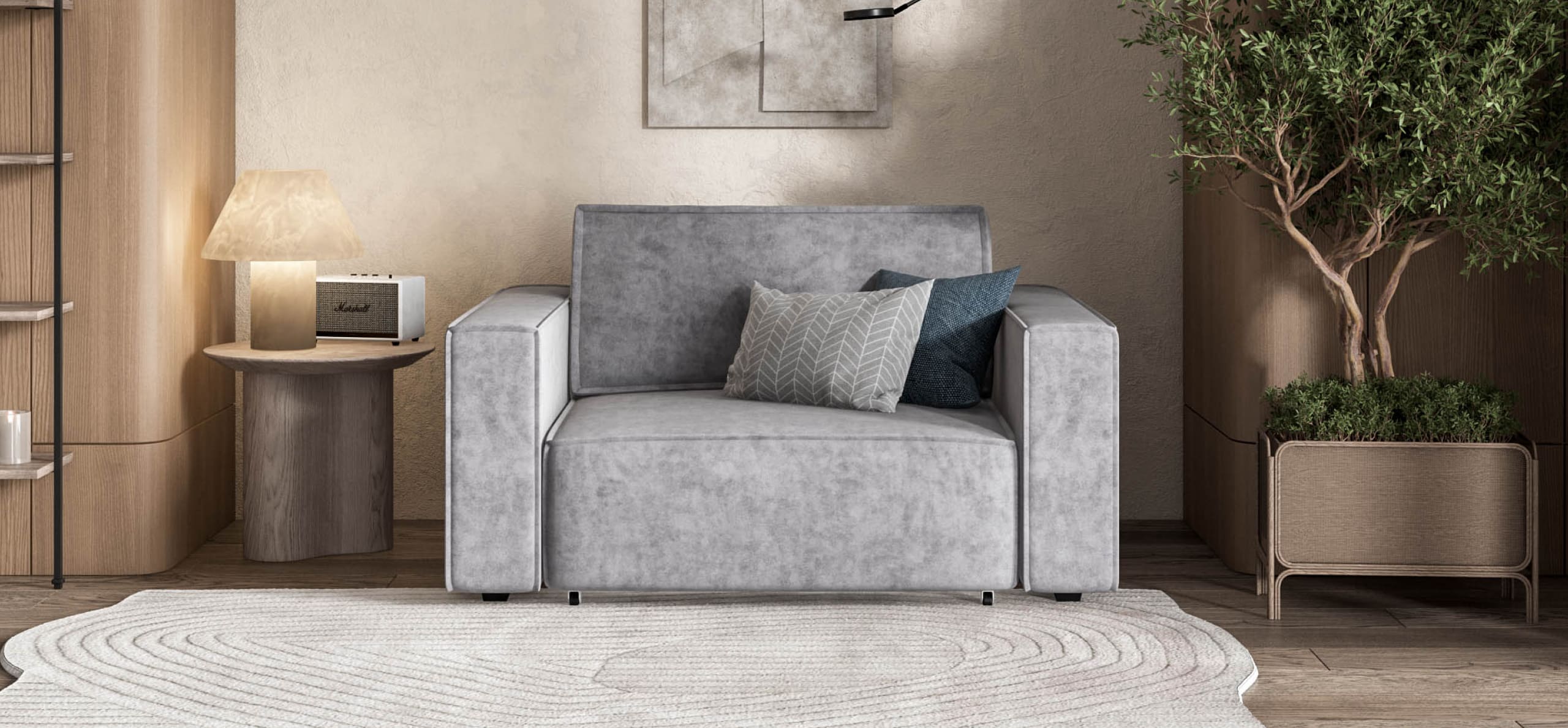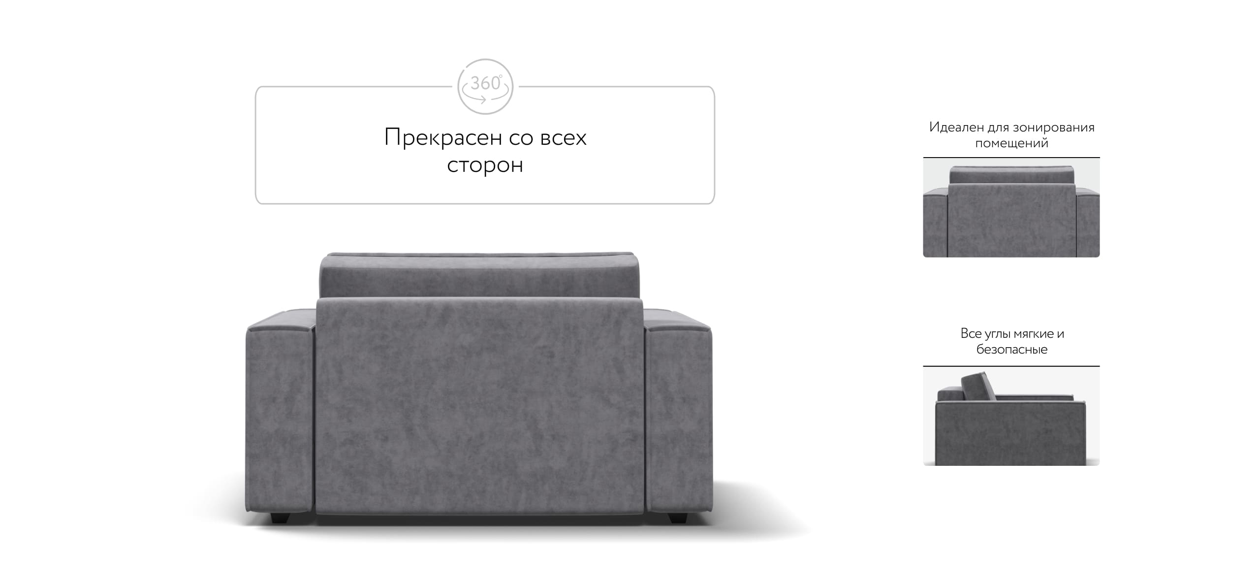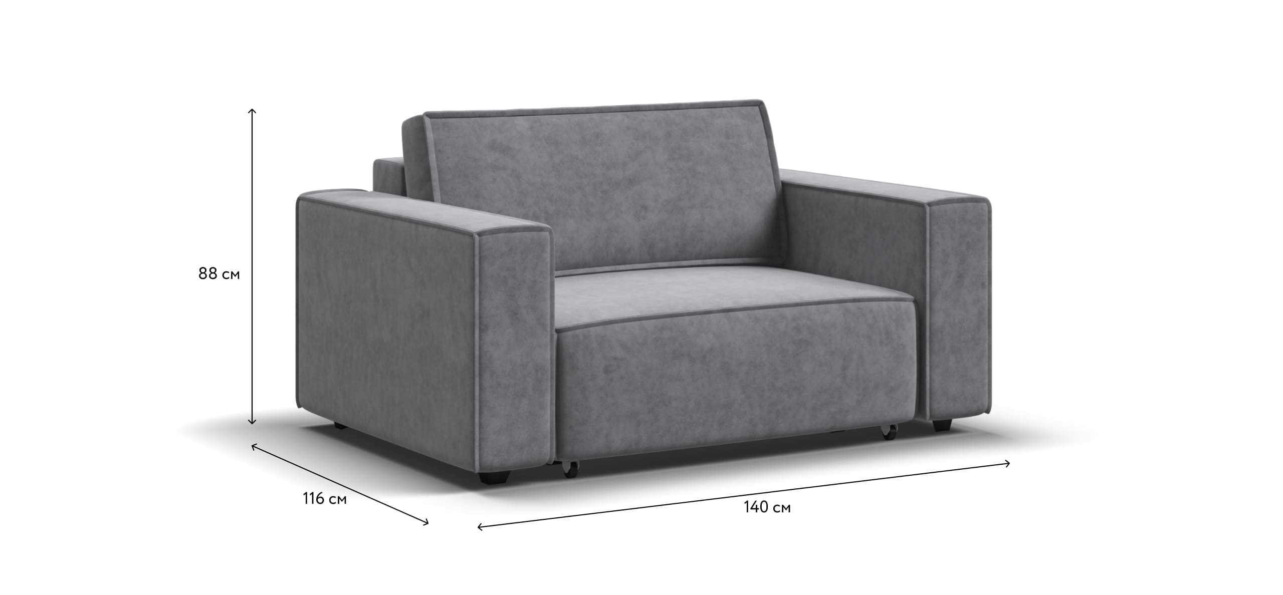 Широкие прямоугольные подлокотники, строгая симметрия и минималистичная отделка идеально дополнит современный интерьер Вашей гостиной.
