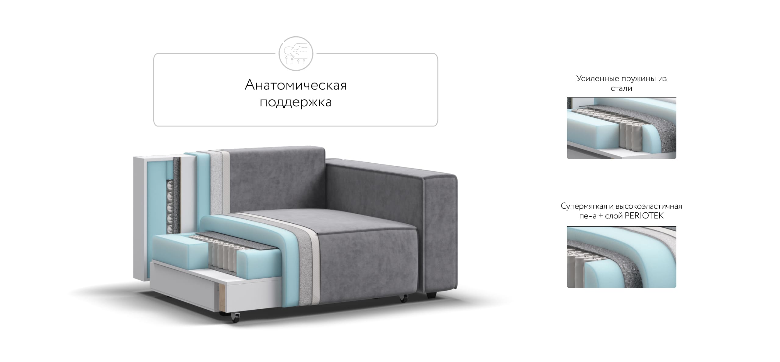 Мягкие набивные подушки, в сочетании холлофайбера и дробленой пены, поддерживают спину, приспосабливаясь под изгибы тела.