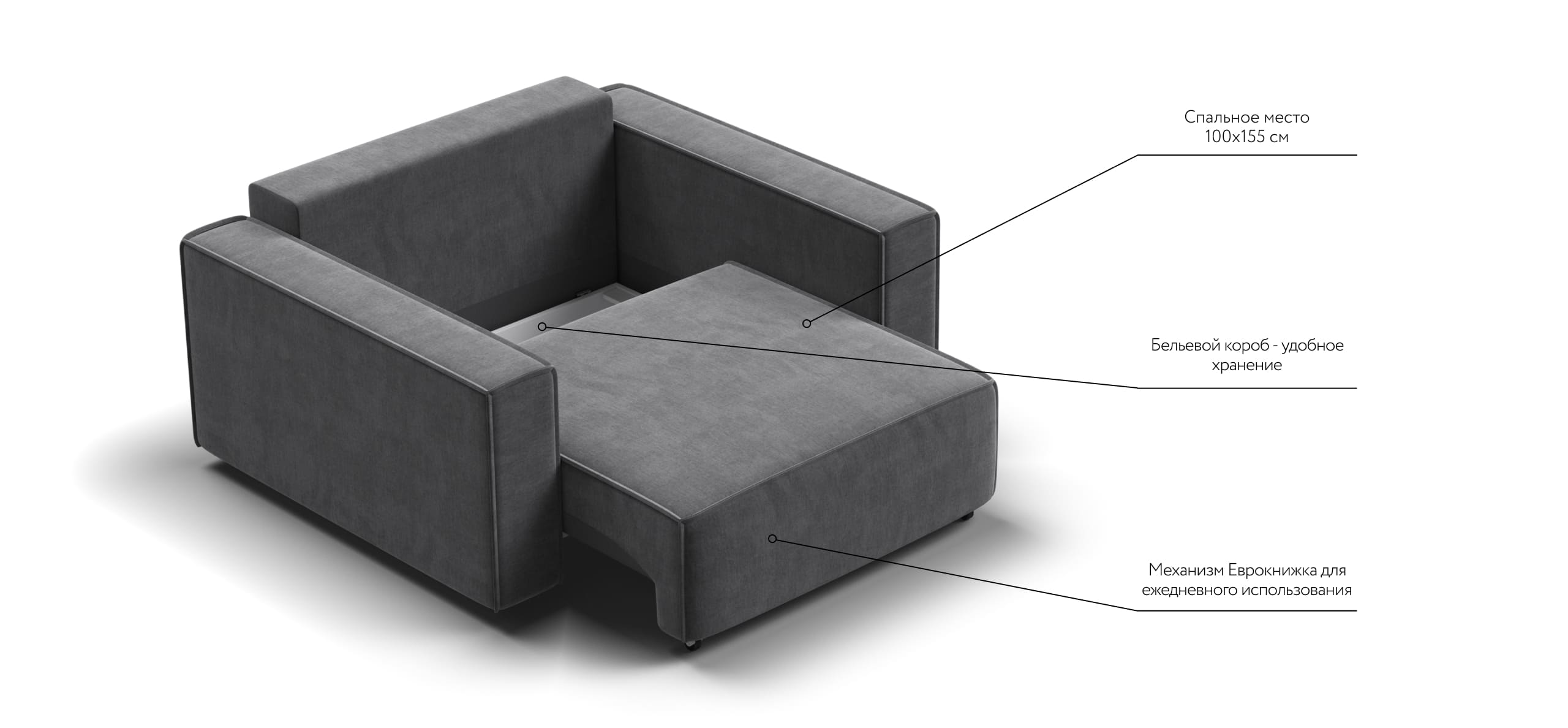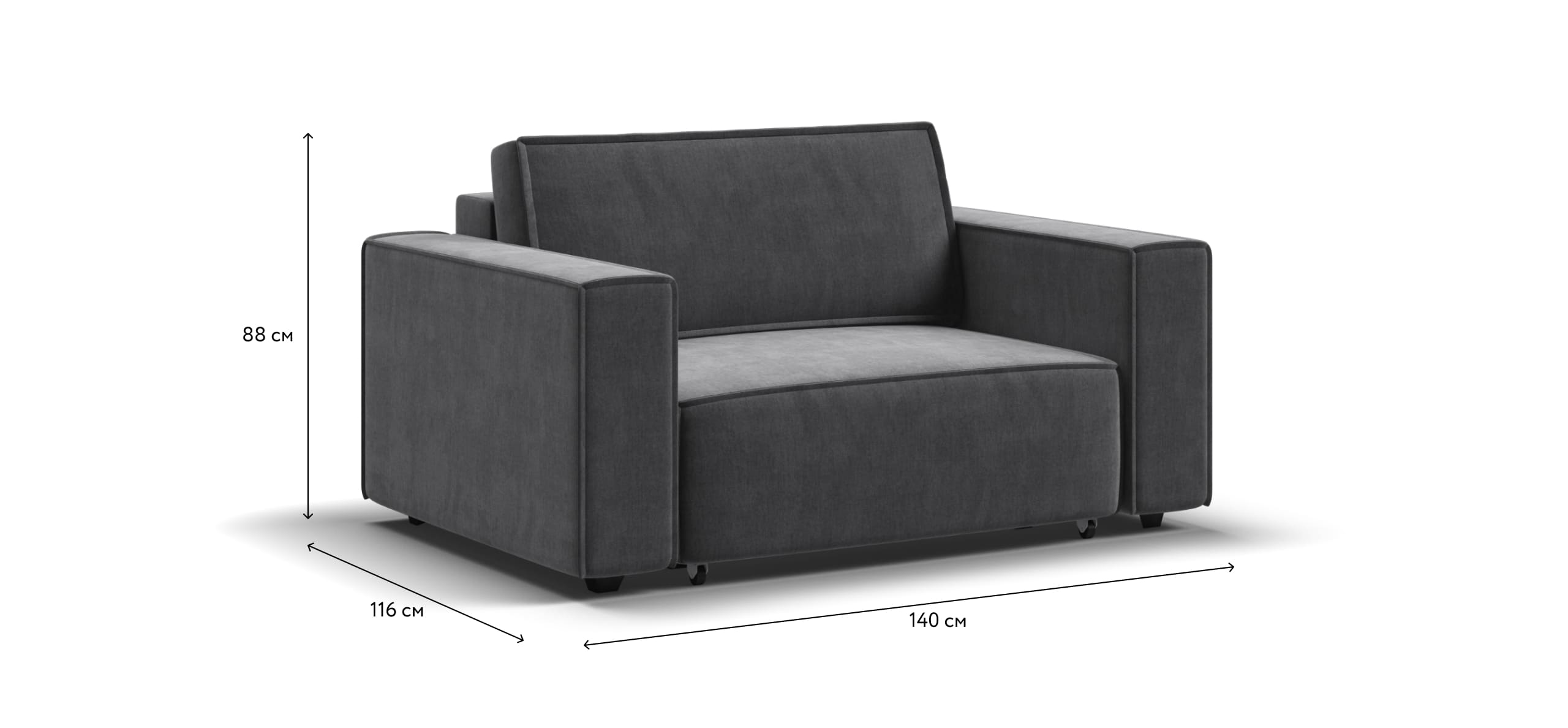 Широкие прямоугольные подлокотники, строгая симметрия и минималистичная отделка идеально дополнит современный интерьер Вашей гостиной.