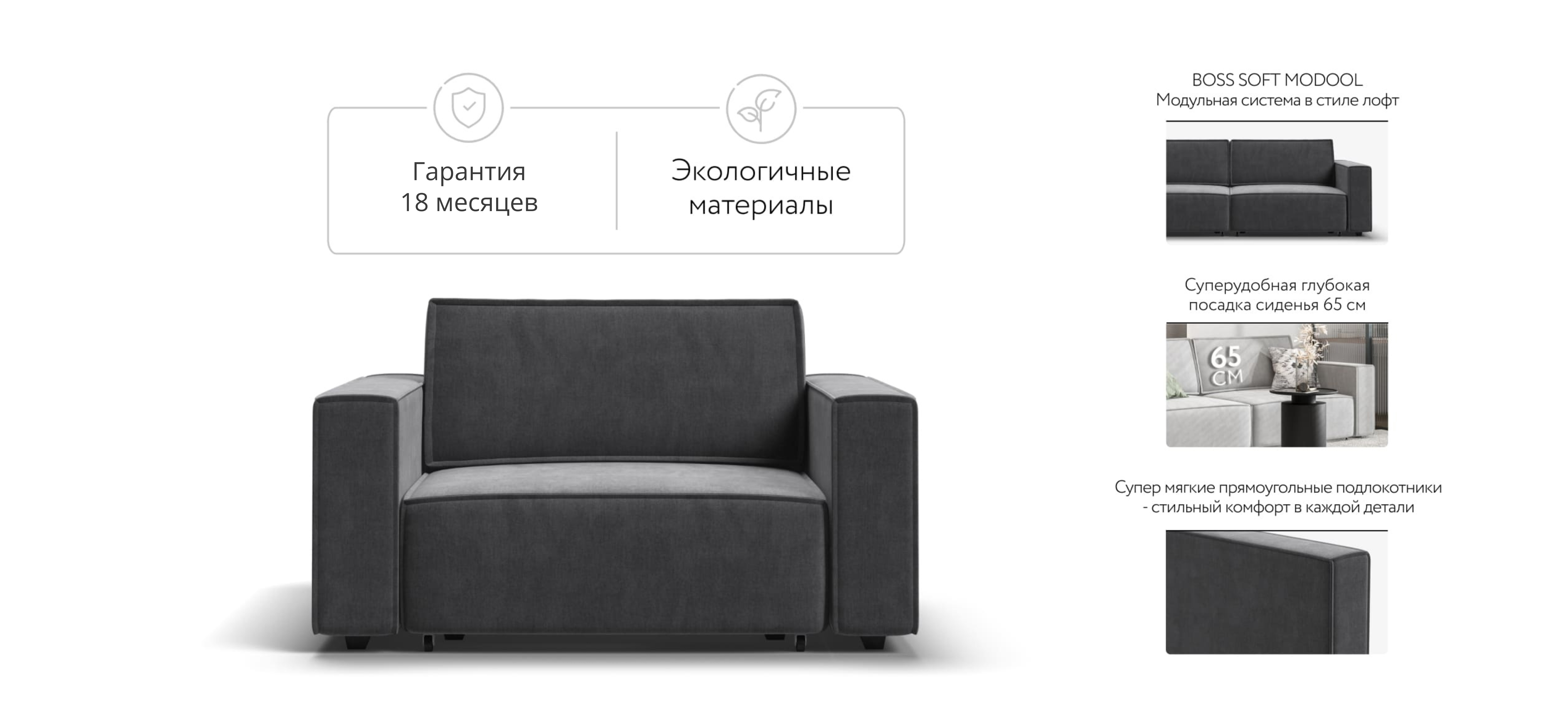 BOSS SOFT Modool – Модульная система в стиле лофт. Сочетание надежности, стиля и функциональности. Суперудобная глубокая посадка и высокоэластичная пена с дополнительным слоем PERIOTEK создадут максимальный комфорт во время отдыха.