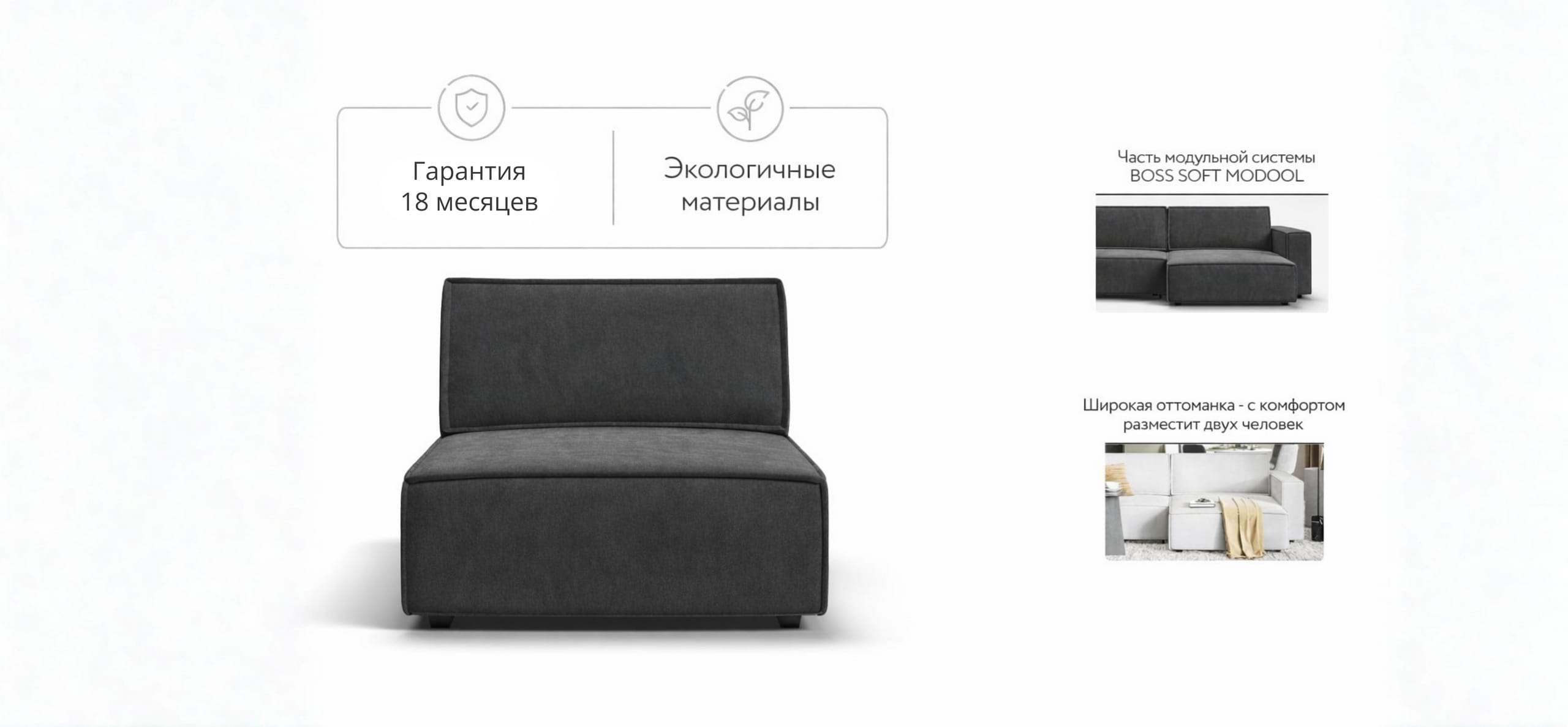 Оттоманка BOSS SOFT Modool является частью модульной системы. Универсальная оттоманка может быть установлена с любой стороны комплектации. Мягкие приспинные подушки и высокоэластичная пена с дополнительным слоем PERIOTEK создадут максимальный комфорт во время отдыха.