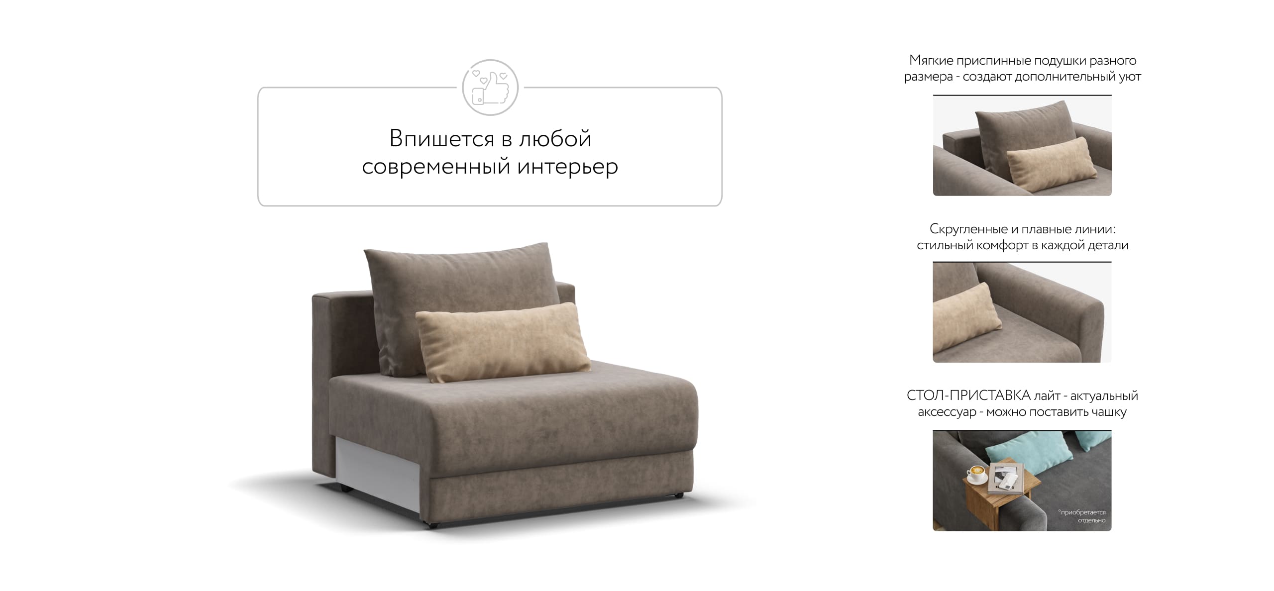 Широкие скругленные подлокотники, плавные линии и приспинные подушки разного размера - стильный комфорт в каждой детали.
