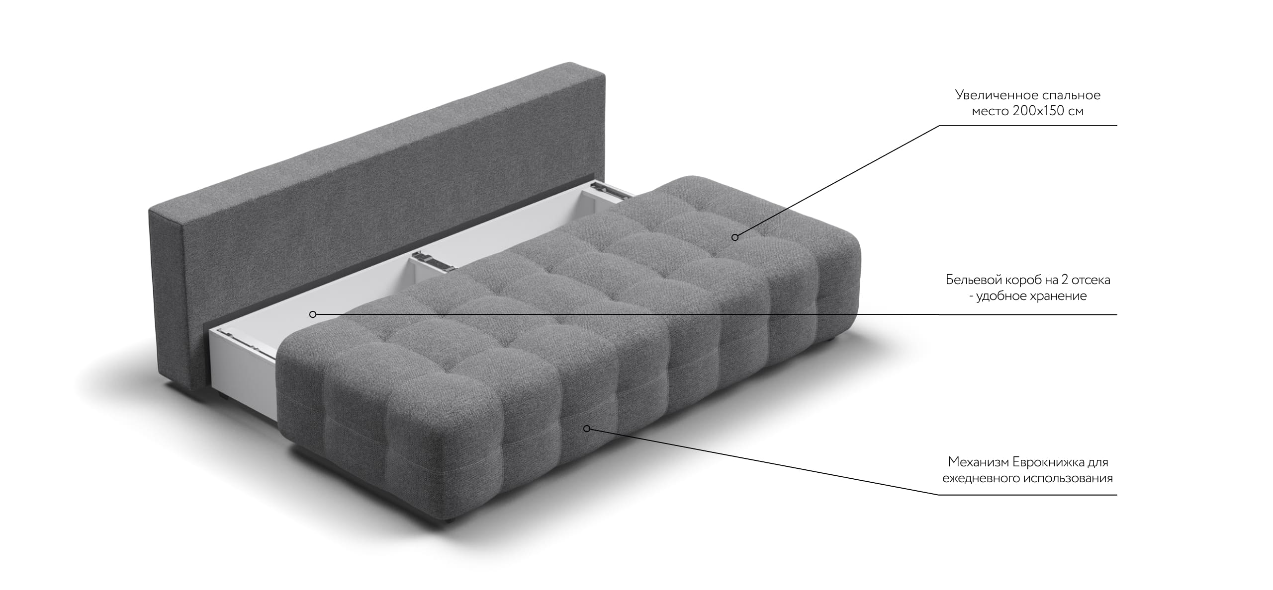 Диван BOSS MINI - отсутствие подлокотников и минималистичный дизайн. Надежный механизм трансформации, в положение повышенного комфортного отдыха RELAX, увеличенная глубина сиденья на 30%, и два ровных цельных спальных места при полной раскладки дивана. Ощутите истинный комфорт у себя дома!