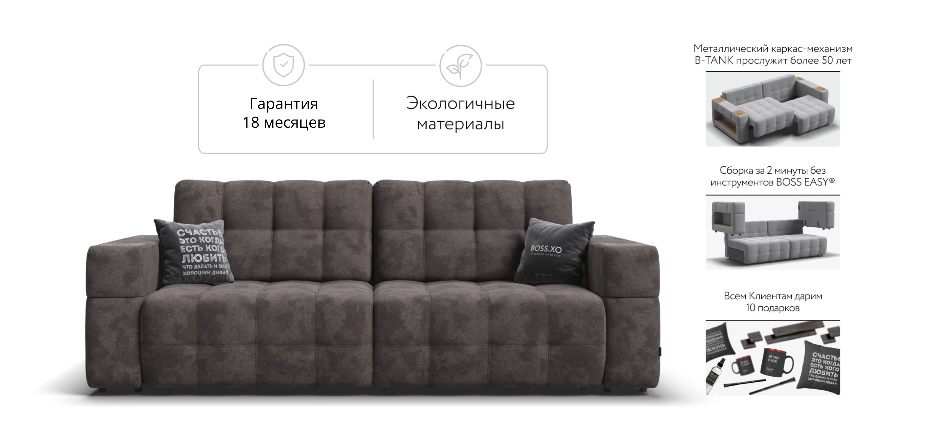 Покупая диван BOSS.XO вы становитесь обладателем уникальных подарков: быстрая зарядка для смартфона, 2 стильных кружки, 2 удобных столика для ноутбука, 2 подушки, комплект запасных накладок на подлокотники B-HAPPY®️, экоручки и средство для чистки BOSS Clean.Характеристики