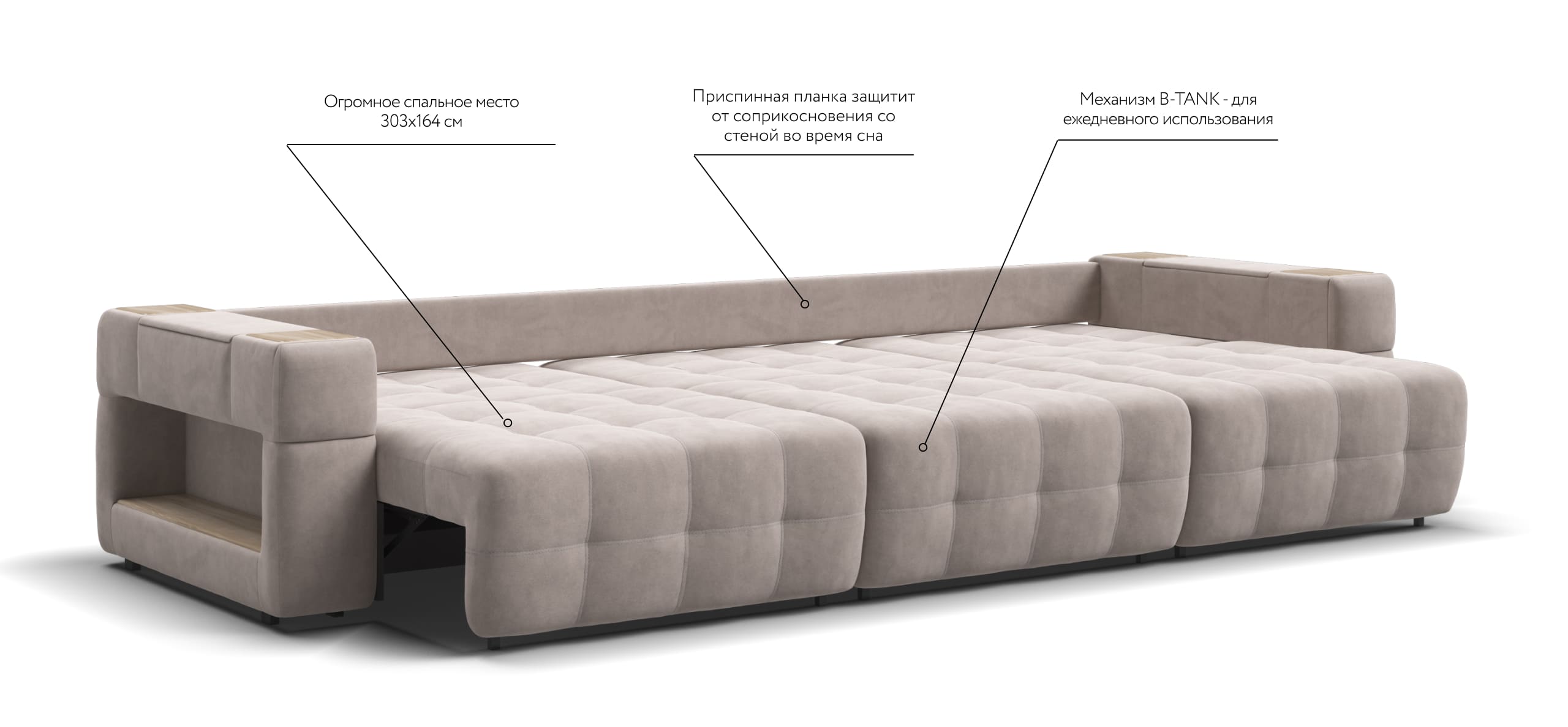 BOSS.XO MAX - это и прямой, угловой и П-образный диван сразу, за 10 секунд вы можете превратить его в правый или левый угол, а также в П-образный.