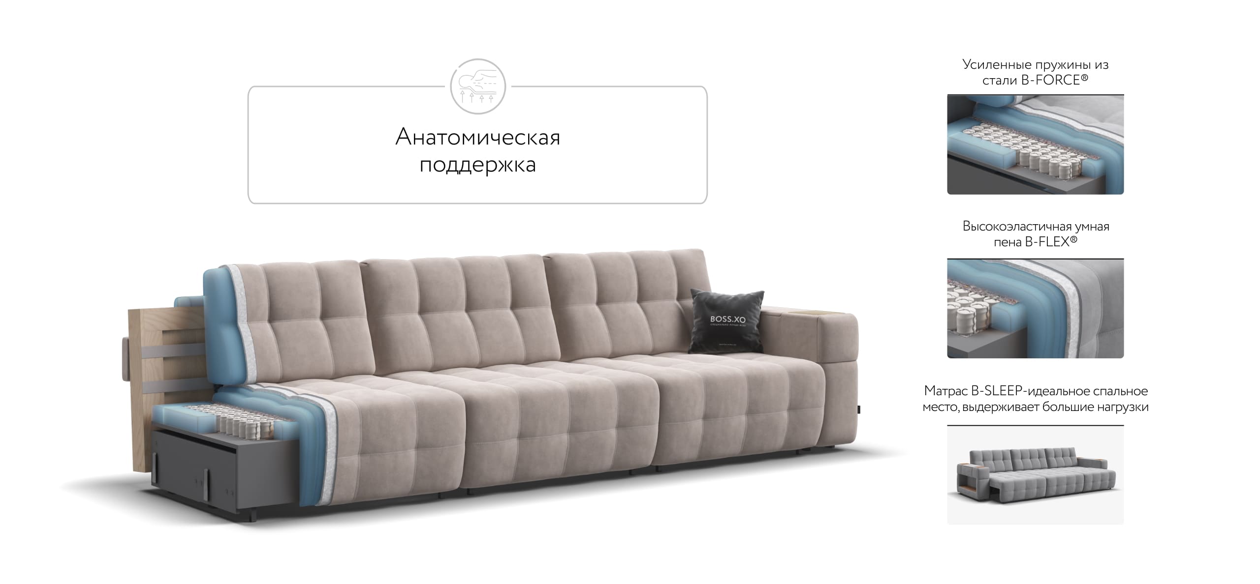BOSS.XO MAX по своим характеристикам лучше многих диванов с ценой от 300 тысяч рублей.